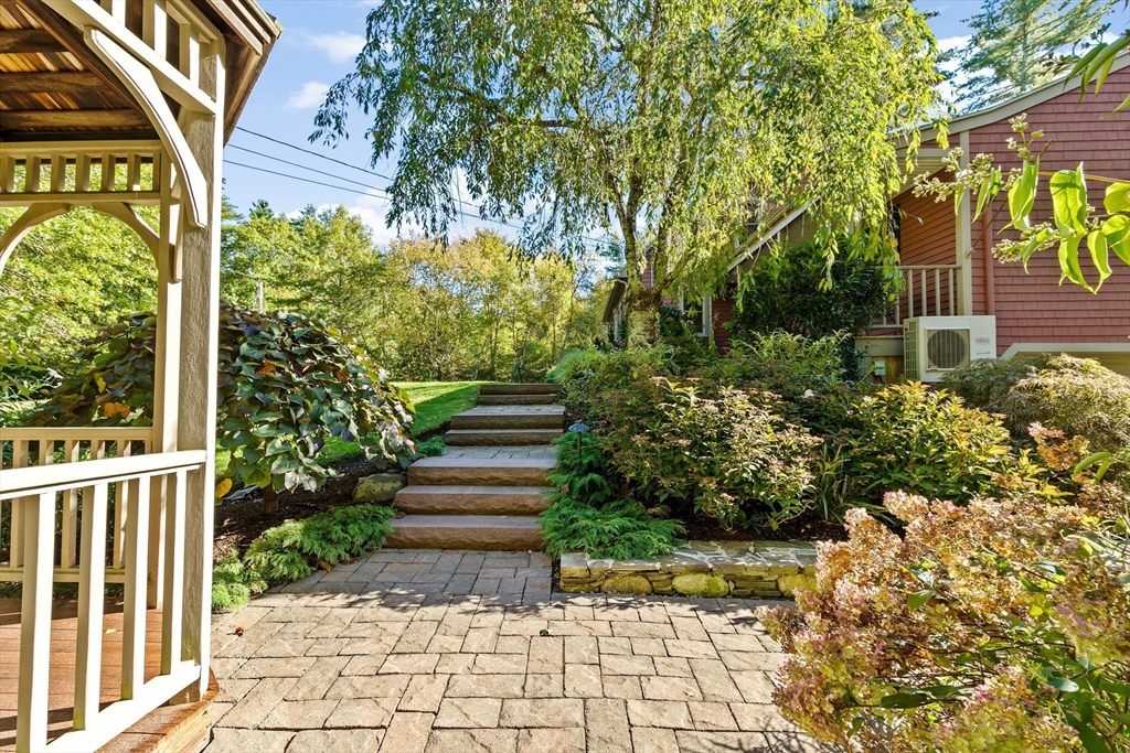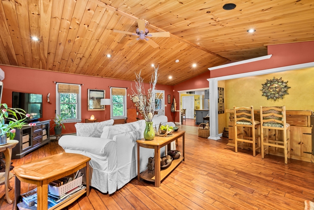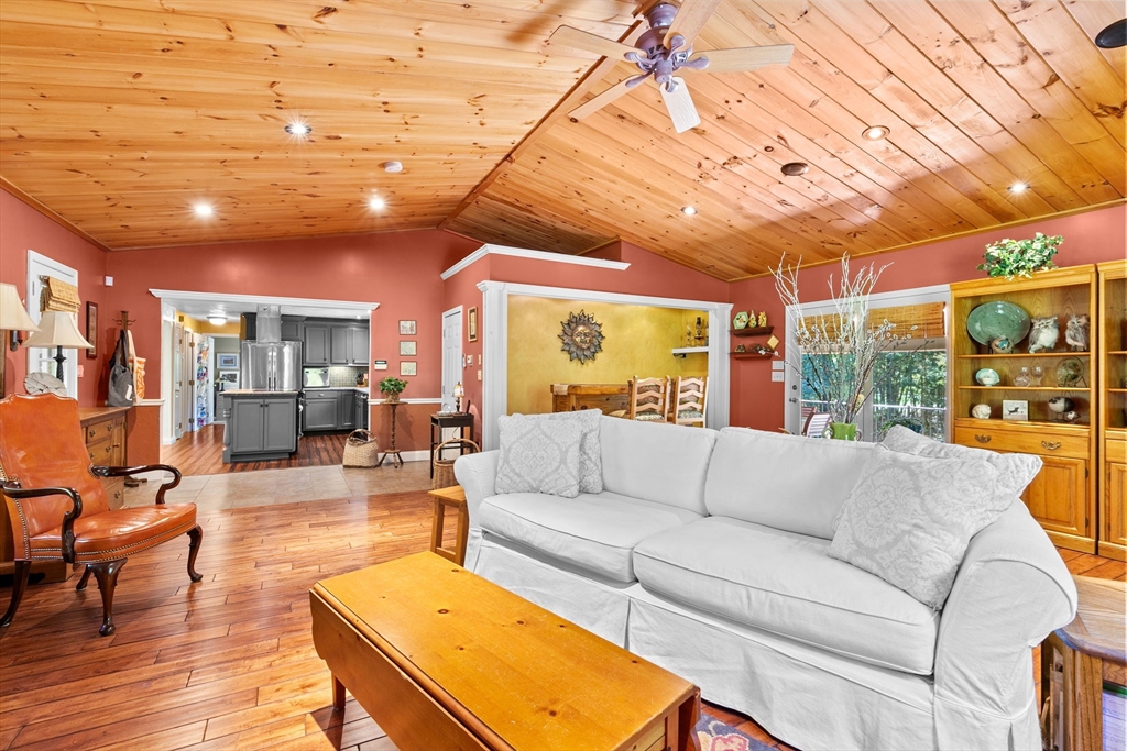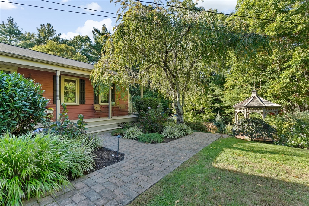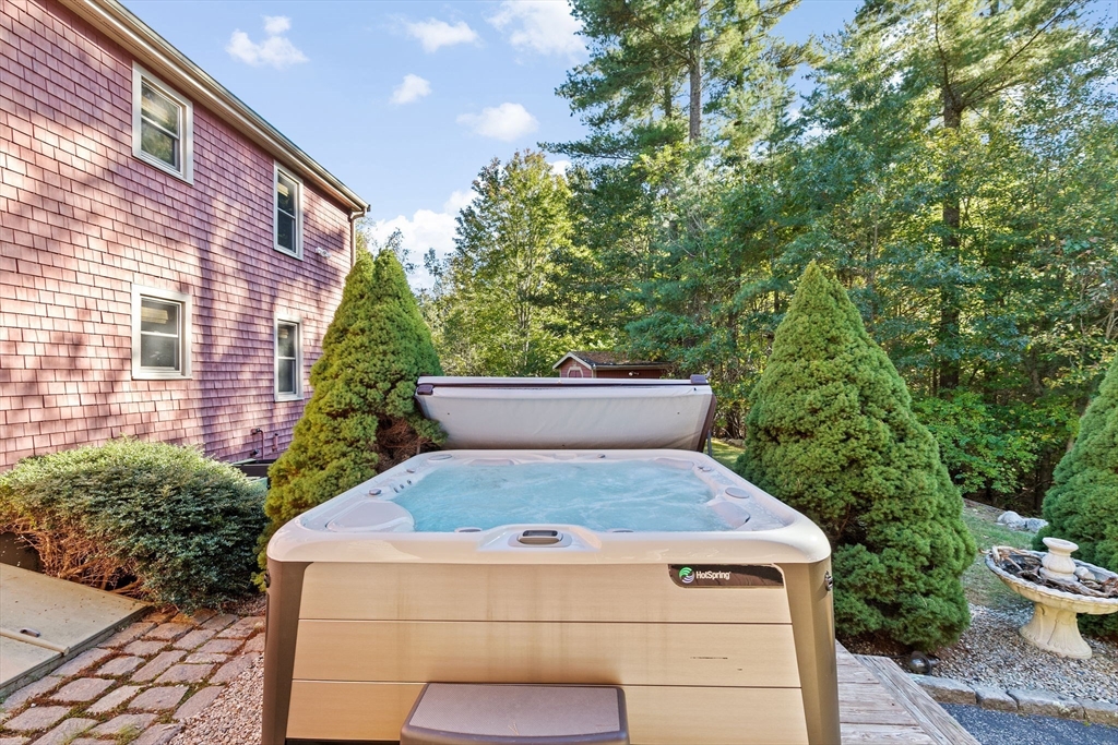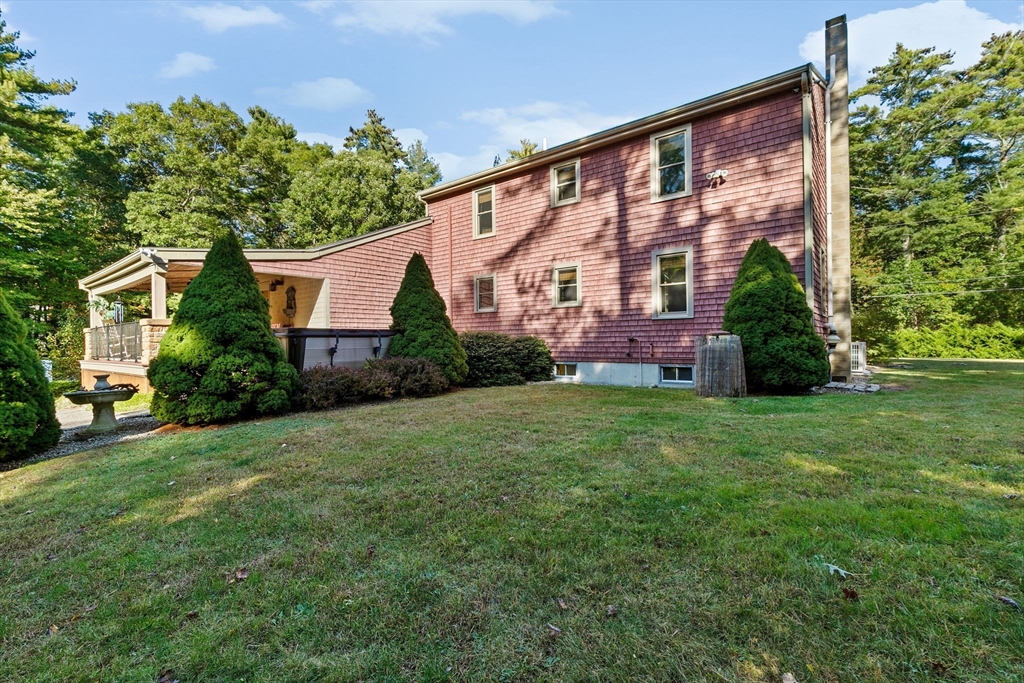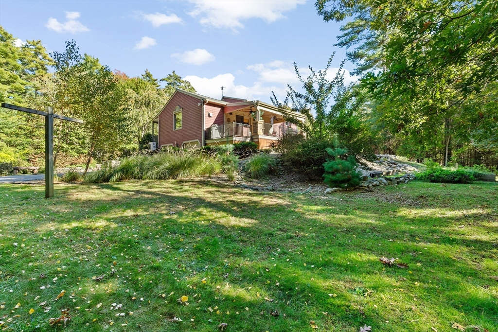 Situated between two communities, this corner lot home offers seclusion and peacefulness surrounded by trees and nature. The living room welcomes you with its rich wood vaulted ceiling, creating an atmosphere of spaciousness and warmth, all while the free-standing gas fireplace adds warmth and coziness instantly. French doors open to the covered deck overlooking the spacious secluded yard with mature landscaping. Imagine relaxing in this inviting space, where natural light dances across the unique architectural details. The kitchen delights in its custom designed island with maple butcher-block top, range hood and stovetop, stainless appliances, and stone countertops Bonus space in basement. So many additions: Culligan water treatment system, irrigation, Aerus central vacuum, Hot Springs Salt Spa, built in bedroom cabinetry. Lots of storage throughout. Six miles to the major shopping center, a short distance to Rte. 495 and 195. Town beach rights to Silvershell Beach 10 miles away.