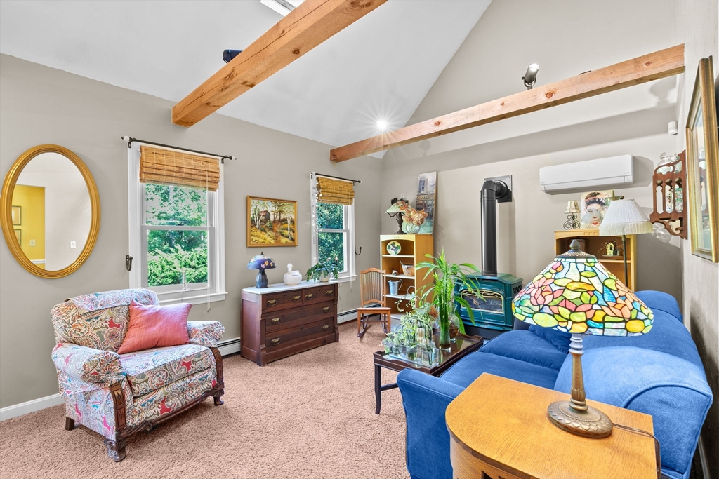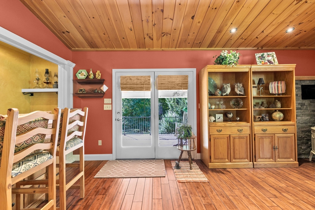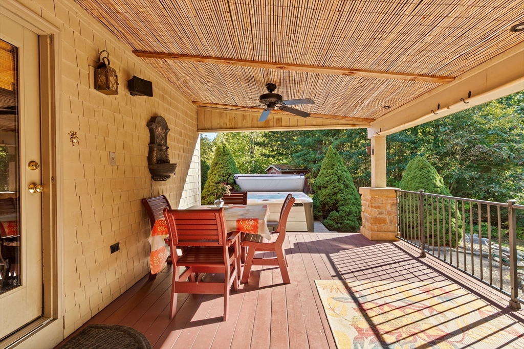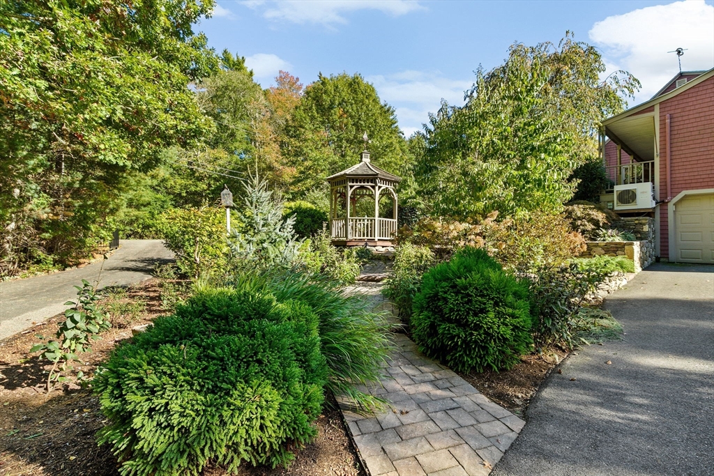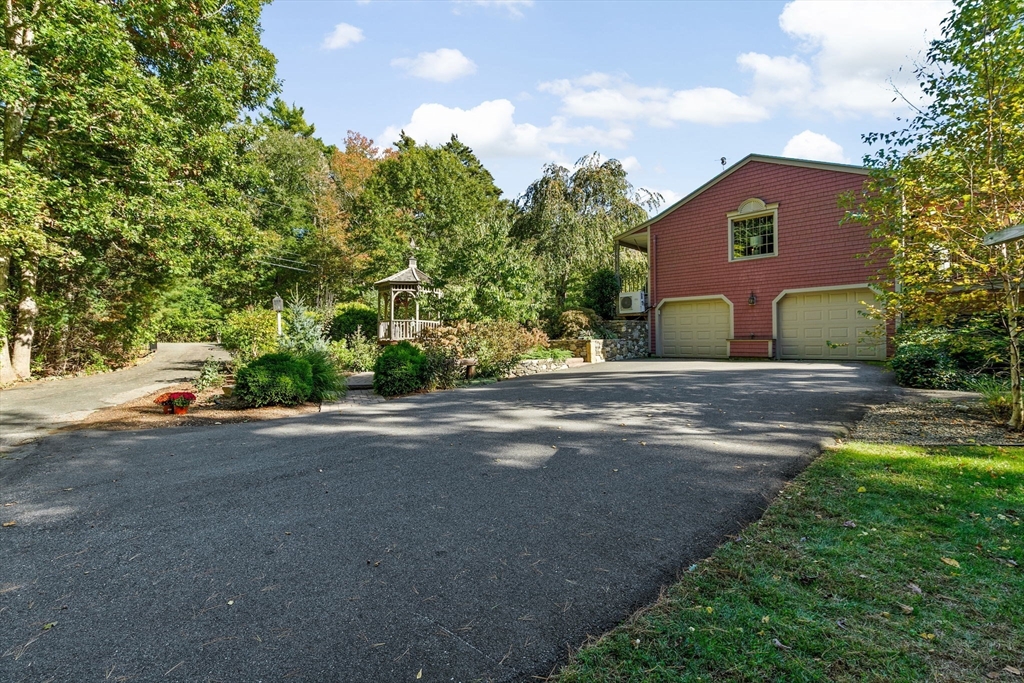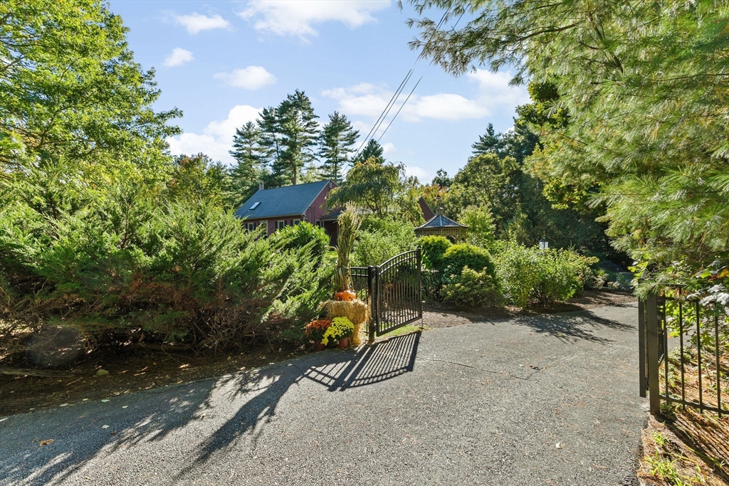 Situated between two communities, this corner lot home offers seclusion and peacefulness surrounded by trees and nature. The living room welcomes you with its rich wood vaulted ceiling, creating an atmosphere of spaciousness and warmth, all while the free-standing gas fireplace adds warmth and coziness instantly. French doors open to the covered deck overlooking the spacious secluded yard with mature landscaping. Imagine relaxing in this inviting space, where natural light dances across the unique architectural details. The kitchen delights in its custom designed island with maple butcher-block top, range hood and stovetop, stainless appliances, and stone countertops Bonus space in basement. So many additions: Culligan water treatment system, irrigation, Aerus central vacuum, Hot Springs Salt Spa, built in bedroom cabinetry. Lots of storage throughout. Six miles to the major shopping center, a short distance to Rte. 495 and 195. Town beach rights to Silvershell Beach 10 miles away.