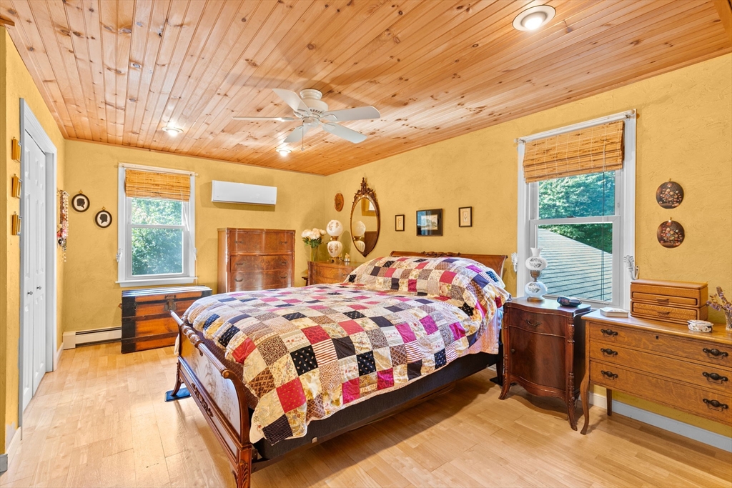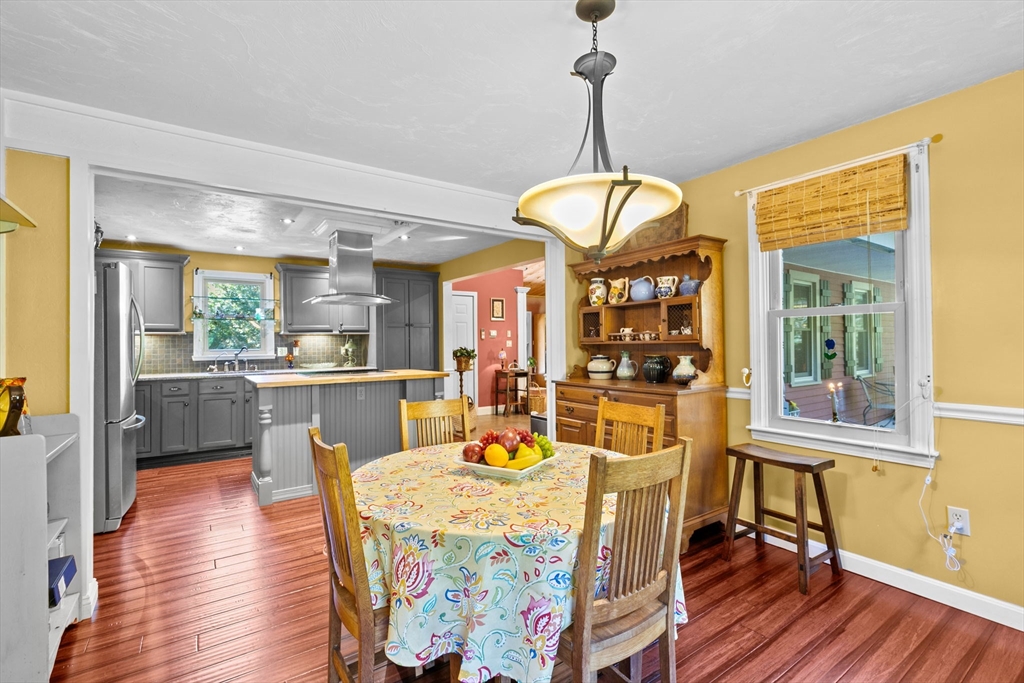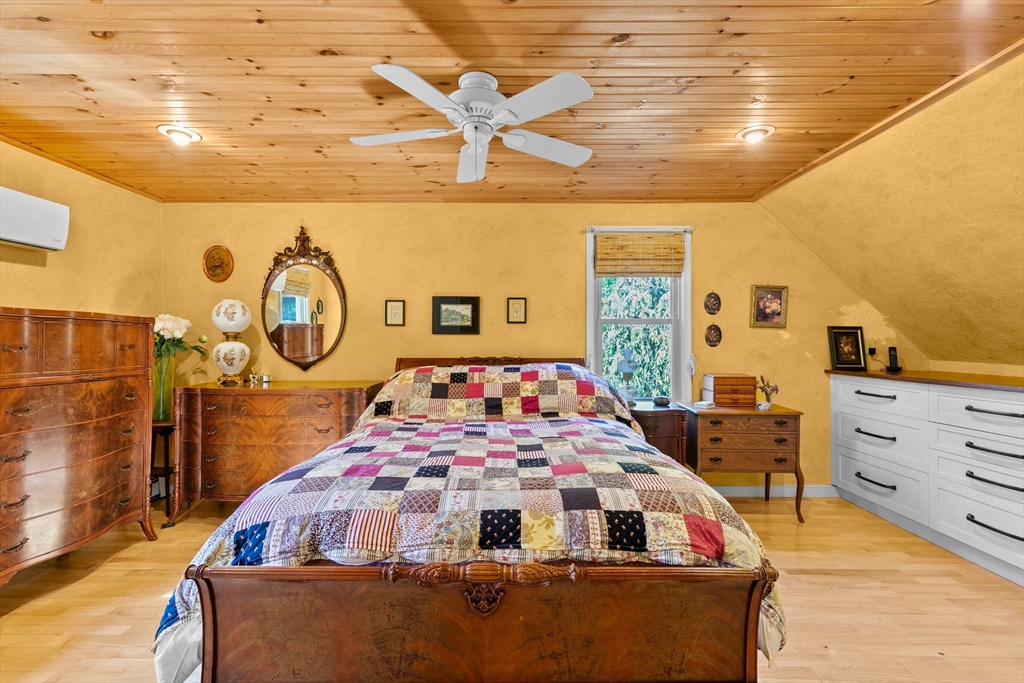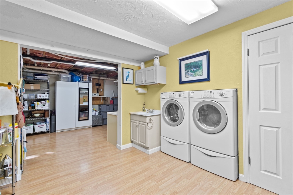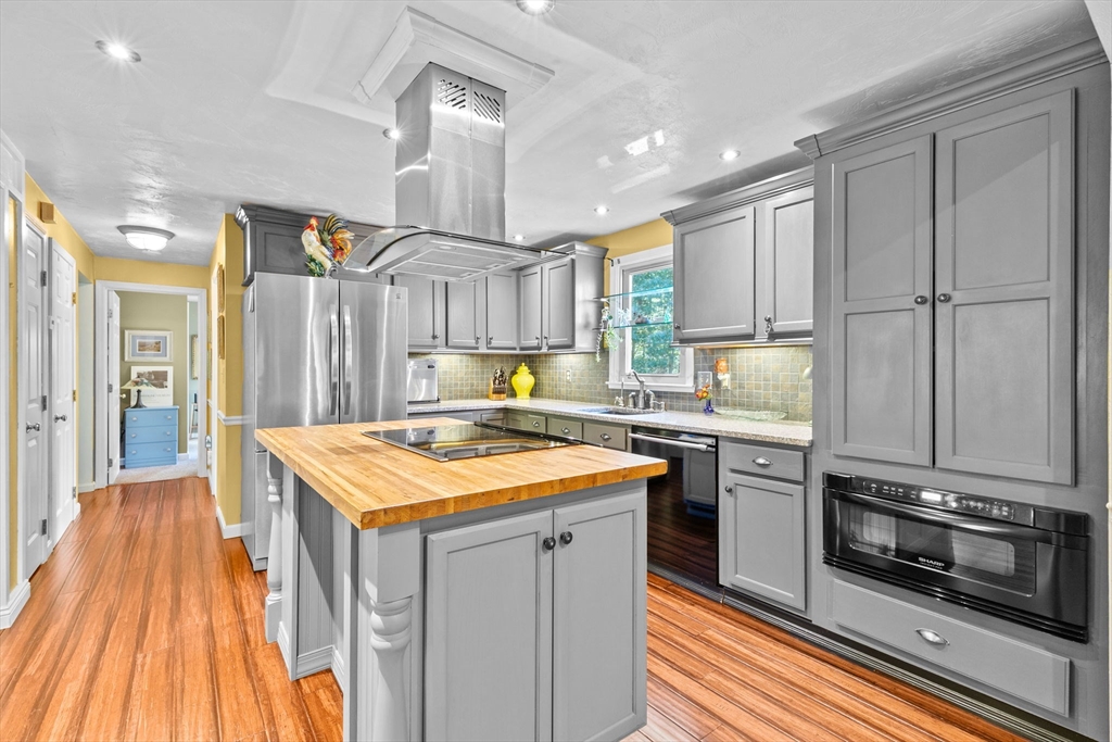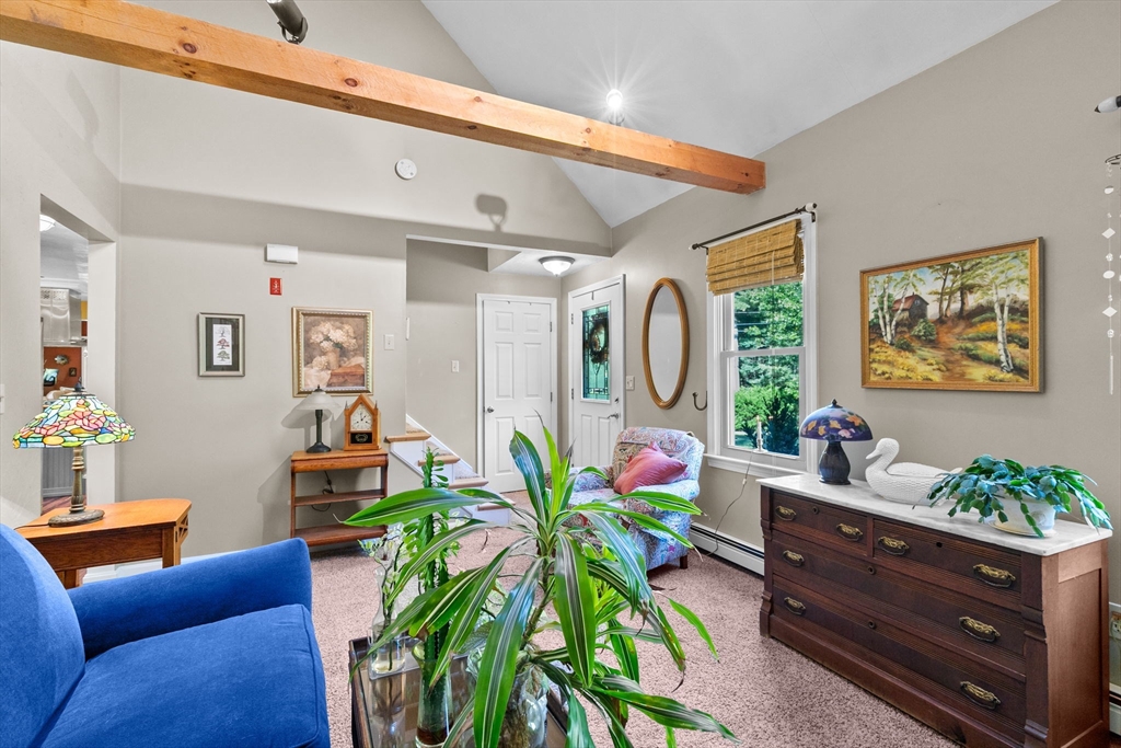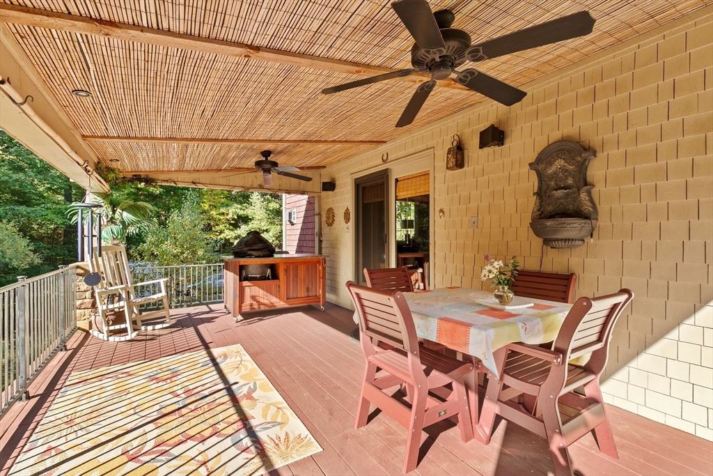 Situated between two communities, this corner lot home offers seclusion and peacefulness surrounded by trees and nature. The living room welcomes you with its rich wood vaulted ceiling, creating an atmosphere of spaciousness and warmth, all while the free-standing gas fireplace adds warmth and coziness instantly. French doors open to the covered deck overlooking the spacious secluded yard with mature landscaping. Imagine relaxing in this inviting space, where natural light dances across the unique architectural details. The kitchen delights in its custom designed island with maple butcher-block top, range hood and stovetop, stainless appliances, and stone countertops Bonus space in basement. So many additions: Culligan water treatment system, irrigation, Aerus central vacuum, Hot Springs Salt Spa, built in bedroom cabinetry. Lots of storage throughout. Six miles to the major shopping center, a short distance to Rte. 495 and 195. Town beach rights to Silvershell Beach 10 miles away.