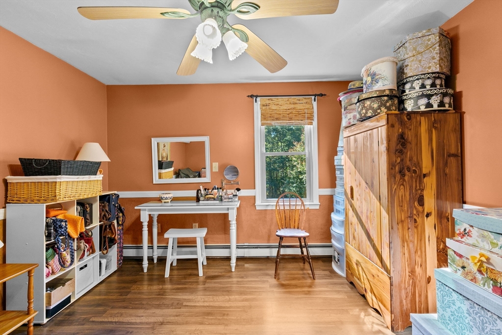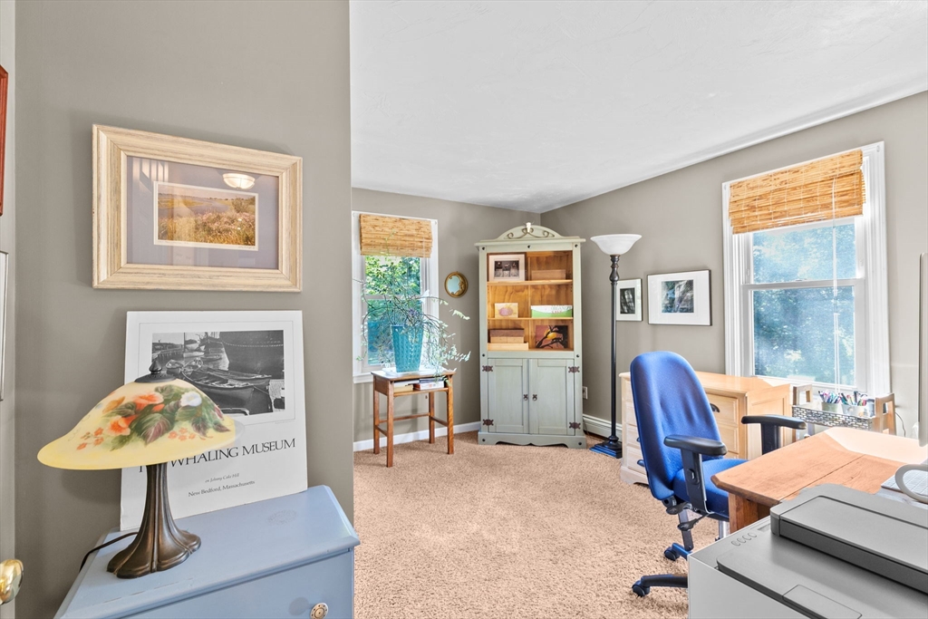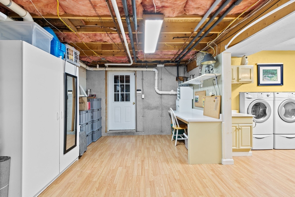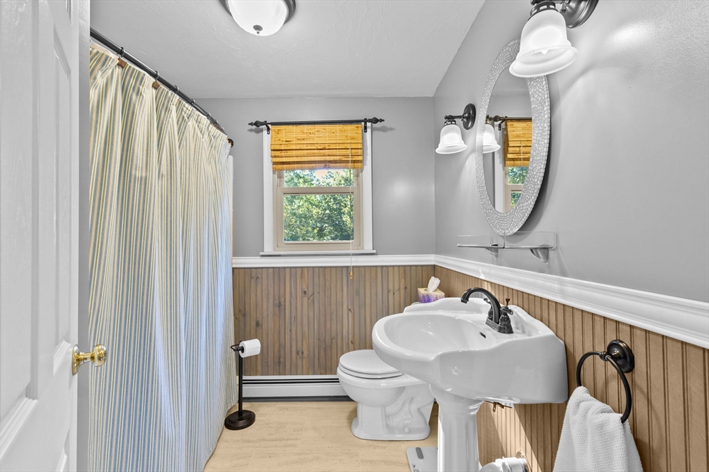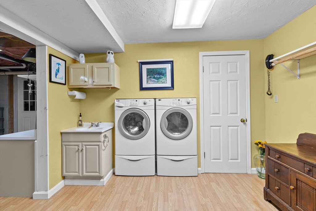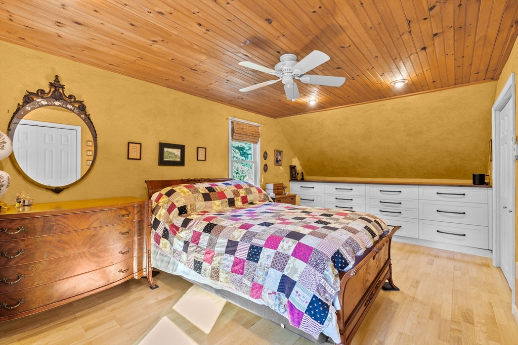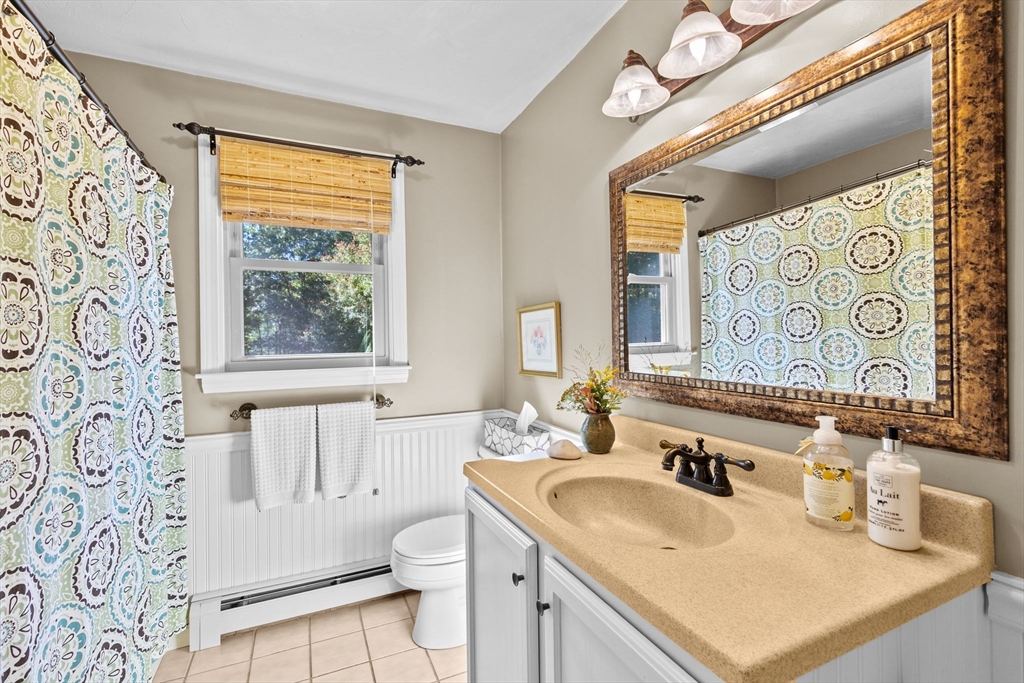 Situated between two communities, this corner lot home offers seclusion and peacefulness surrounded by trees and nature. The living room welcomes you with its rich wood vaulted ceiling, creating an atmosphere of spaciousness and warmth, all while the free-standing gas fireplace adds warmth and coziness instantly. French doors open to the covered deck overlooking the spacious secluded yard with mature landscaping. Imagine relaxing in this inviting space, where natural light dances across the unique architectural details. The kitchen delights in its custom designed island with maple butcher-block top, range hood and stovetop, stainless appliances, and stone countertops Bonus space in basement. So many additions: Culligan water treatment system, irrigation, Aerus central vacuum, Hot Springs Salt Spa, built in bedroom cabinetry. Lots of storage throughout. Six miles to the major shopping center, a short distance to Rte. 495 and 195. Town beach rights to Silvershell Beach 10 miles away.
