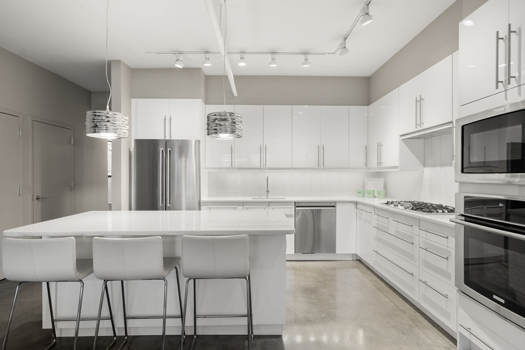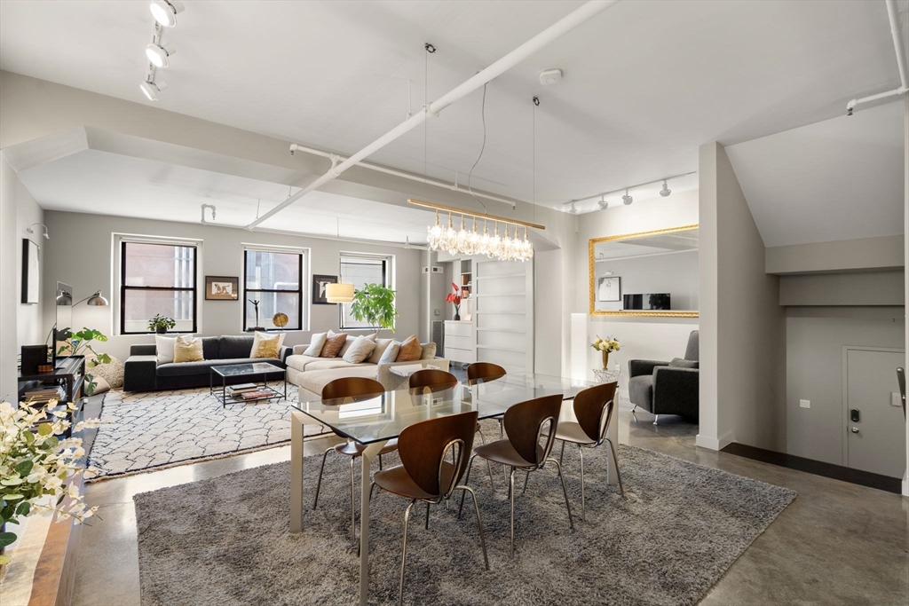 Stunning 1 bed, 2 bath loft with 1,693 SF, thoughtfully renovated by a distinguished Boston designer to maximize livability and storage. This expansive open-concept loft features polished concrete floors, soaring ceilings with exposed piping, and oversized windows that fill the space with natural light. The sleek modern kitchen includes custom cabinetry, quartz countertops, stainless steel appliances, and a large island perfect for entertaining. The spacious primary suite includes a built-in workspace, a massive walk-in closet, and a spa-like bath with a glass-enclosed shower and floating vanity. A second full bath and custom Murphy bed provide flexible guest accommodations. Ideally located in Boston’s Downtown/Leather District, steps from South Station, the Greenway, and Seaport—true urban loft living at its finest.