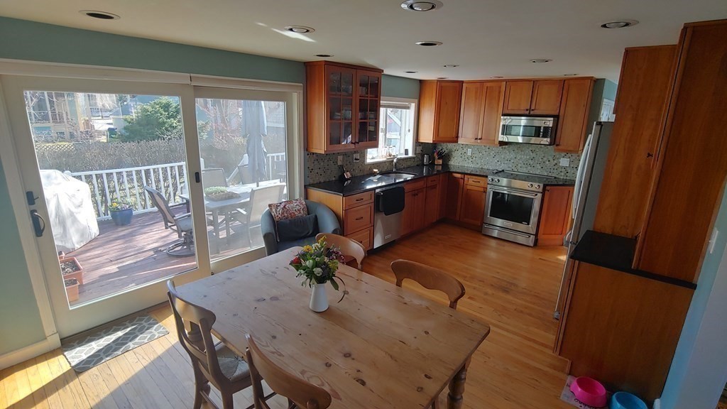 Bright and sunny SFH available furnished or unfurnished for January 1st in desirable Newton Highlands. Situated near NSHS - Brown - Oak Hill - Countryside schools and Newton Highlands T Station. The first floor features a large living room with fireplace and opens to a charming eat-in kitchen featuring top-quality stainless appliances, granite countertops and solid wood cabinets. A separate study/office and full bathroom complete the first floor, plus sliding doors off the kitchen open to the large deck which overlooks the private fenced-in backyard. The second floor offers 3 spacious bedrooms with closets and another full bathroom. The finished basement makes for an ideal play and family room, with a separate area for laundry. The attached garage and driveway can park two cars, plus free on-street parking. Lincoln Street shops and restaurants are nearby, as well as Route 9 shopping and easy access to I-95. Dogs are OK, but no cats. Also no smoking, please.