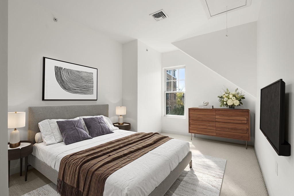 Single-family alternative. Lives like a single. Rarely available. Two-level townhouse on a tree-lined one-way street with a 2-car garage. A gracious and spacious home that has soaring high ceilings, with an abundance of large, insulated windows. This sun-filled home has light streaming in throughout. There is a large open living dining with tree-top views. The sunny, large eat-in kitchen has lots of additional wall cabinets for great storage, granite counters, and stainless steel appliances. The 2nd level has a large primary suite with a ensuite bath, 2 additional bedrooms, and a large main bath. Great closet space throughout. Minutes to T, school, park, public library, shopping, restaurants, and Longwood Medical. Easy access to downtown Boston.