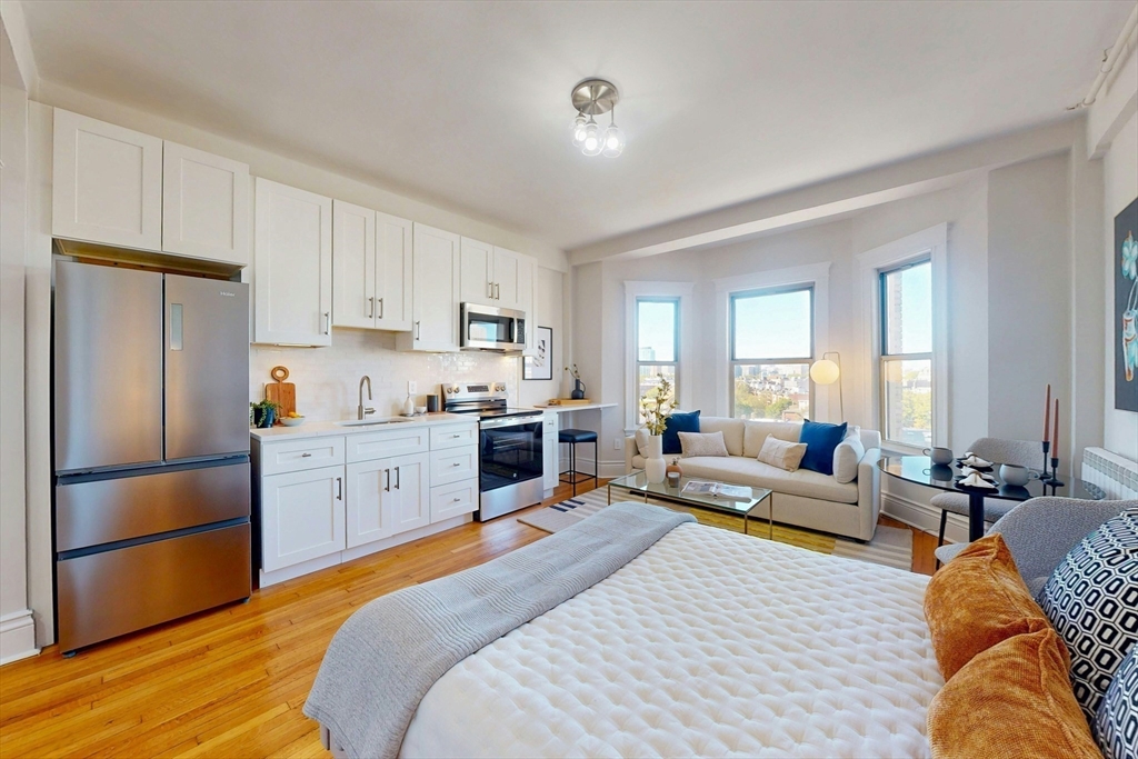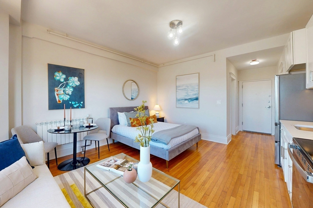 Step into a slice of history at 270 Huntington Ave. Head to the 7th floor to enjoy sweeping views overlooking the renowned "Avenue of the Arts". This meticulously renovated, front-facing top floor unit offers modern living & features stainless steel appliances, elegant white cabinetry & oak floors. The open layout includes a convenient desk nook perfect for work/study & is pre-wired for a wall-mounted TV. Indulge in the chic modern bath, complete with a walk-in shower with glass surround. Located in a distinguished elevator building with 24-hour concierge and on-site super, the condo fee includes heat & hot water. Enjoy the bustling city right outside your door in Boston's cultural epicenter; just a stone's throw from Symphony Hall, Northeastern University, the New England Conservatory & Berklee College of Music. Enjoy the convenience of nearby Whole Foods, shopping, cafes & a diverse array of dining. Effortlessly connect to all major bus routes & the MBTA Orange & Green lines.