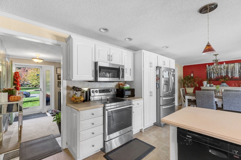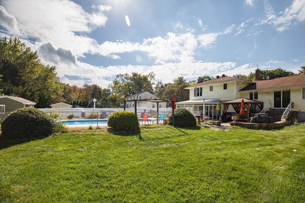 Welcome to this charming 4-bedroom, 2.5-bath split-level home in a highly sought-after neighborhood, perfectly blending indoor comfort with outdoor leisure! Enjoy fantastic curb appeal with a beautifully maintained yard, mature trees, and a spacious driveway. Inside, the bright kitchen features white cabinetry, stainless steel appliances, and a central peninsula that opens to the dining area. The light-filled living room offers large windows and serene views. Upstairs are three bedrooms and two full baths, including a primary ensuite. The lower level includes a cozy family room with pellet stove, sliders to the sunroom with a pellet stove, a half bath with laundry, and a finished bonus bedroom ideal for guests or recreation. The fenced backyard is a true retreat with an in-ground pool, diving board, patio, and fire pit, playset, and garden - perfect for entertaining or relaxing. A wonderful opportunity for comfortable living and summer fun!