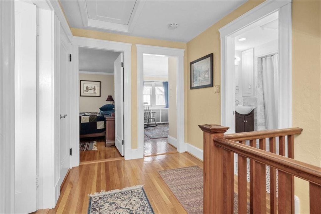 Pride of ownership shines throughout this distinguished Tudor-style home, ideally situated in a highly desired West Quincy neighborhood. From the moment you step into the inviting foyer, you'll be captivated by the home's timeless character, rich wood finishes, and classic crown molding. The gracious living room with a cozy gas fireplace flows seamlessly into a formal dining room—perfect for entertaining. A sunlit family room opens via sliding doors to a spacious deck overlooking a beautifully maintained, serene retreat. The eat-in kitchen offers traditional charm, creating a warm and functional heart of the home. Hardwood floors run throughout, adding to the home's enduring appeal. Extended family/guests will feel right at home in the in-law suite featuring a fireplaced living room. A two-car detached garage, ample closet/storage space, and well-kept landscaping further reflect the care and attention given to this property. A true must-see for buyers who value quality craftsmanship.