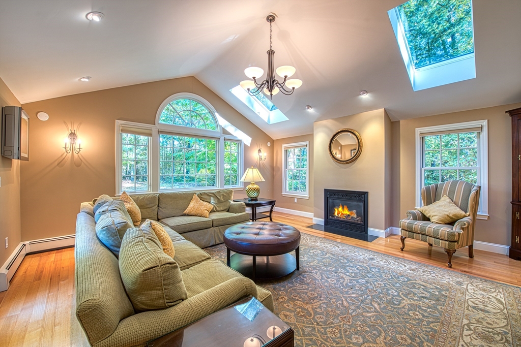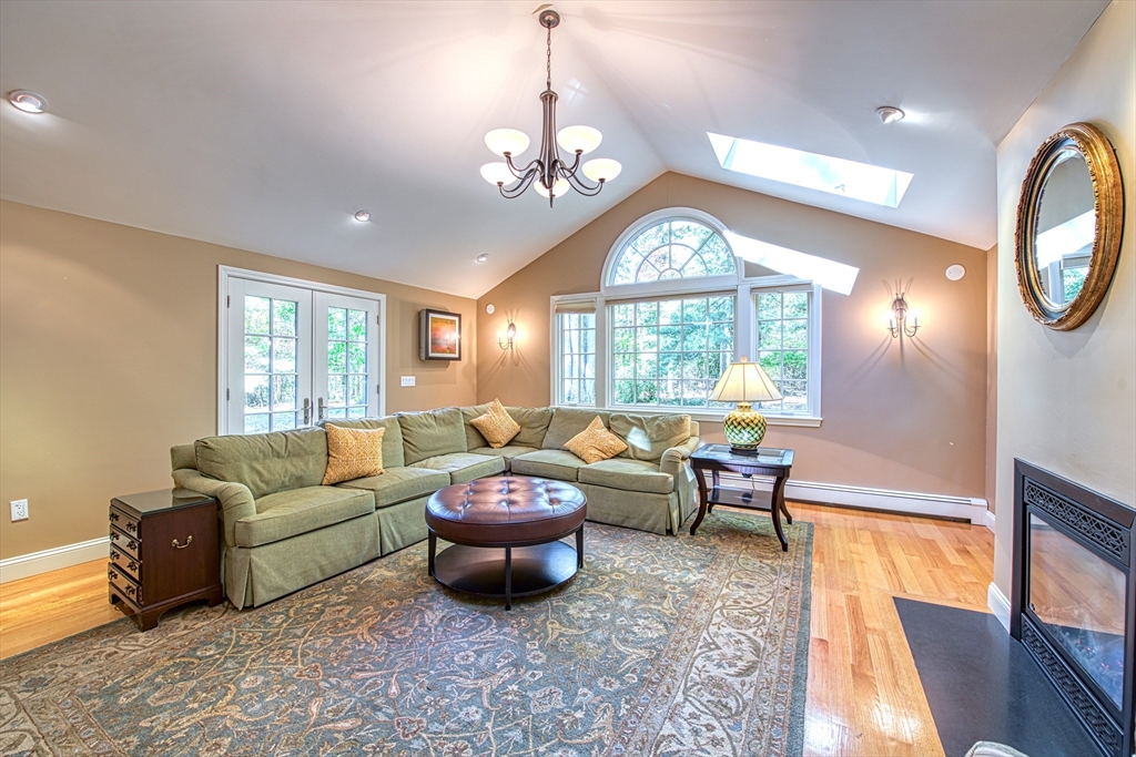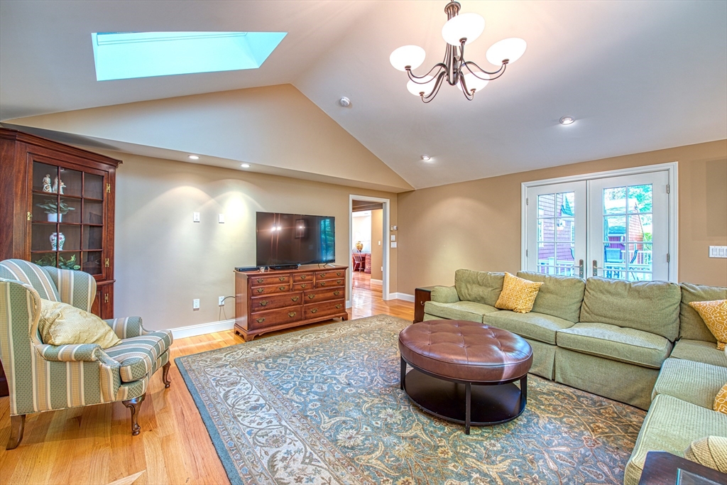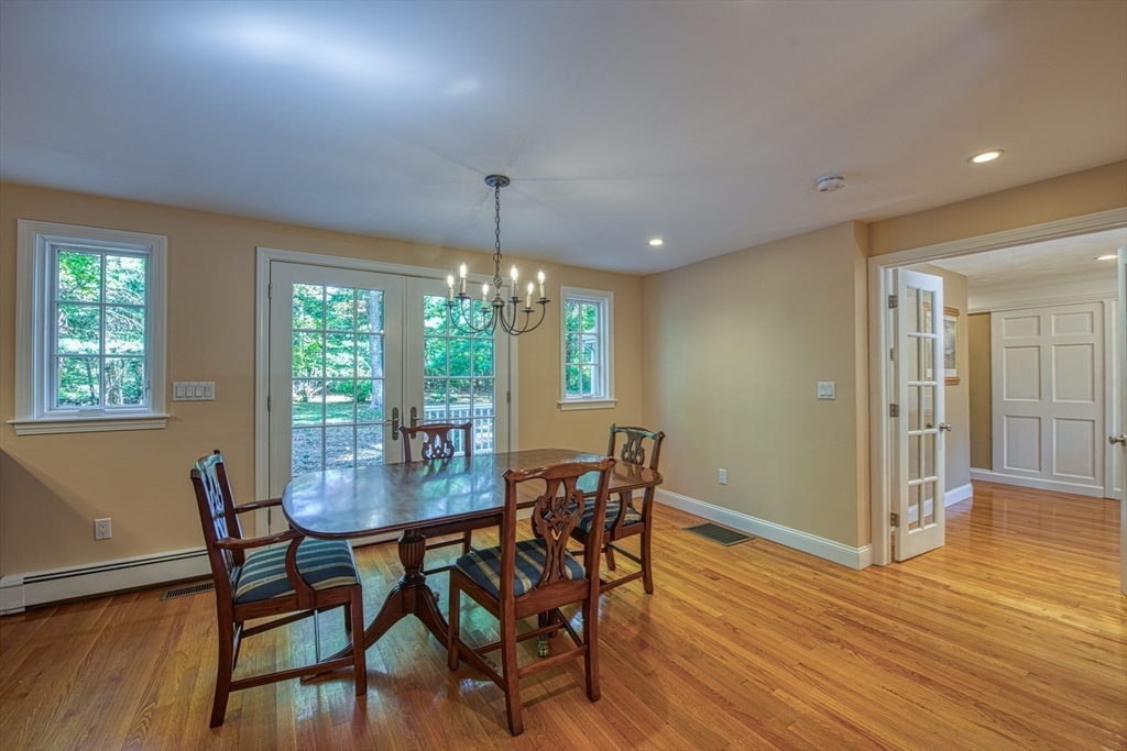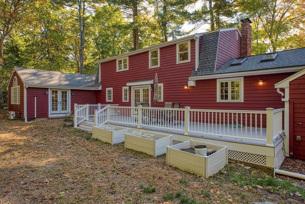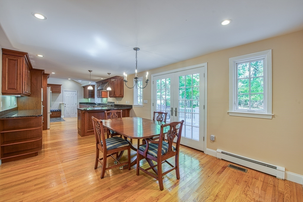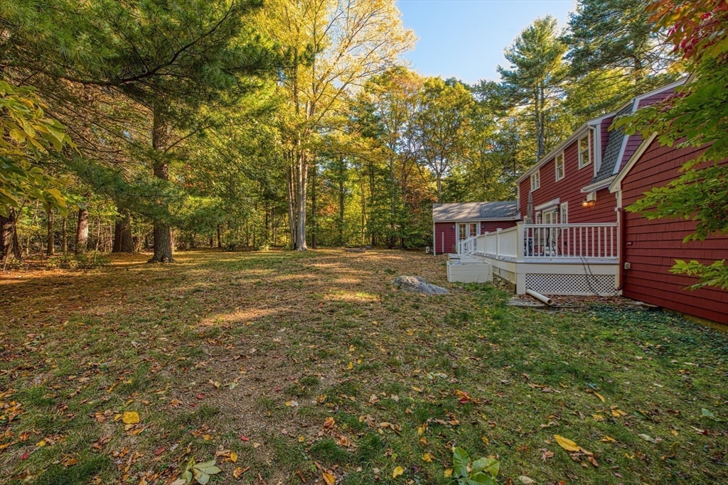 Beautifully updated 4-bedroom, 2-bath home featuring gleaming hardwood floors throughout and a stunning FULLY RENOVATED cabinet-packed cherry kitchen with high-end stainless appliances and granite counters. The adjacent dining area opens to a deck overlooking a private, tree-lined yard—perfect for entertaining! The inviting layout includes a formal living room and a cathedral-ceiling family room with a cozy gas fireplace. A flexible space off the kitchen is ideal as a dining room or home office. The MAIN LEVEL BEDROOM and full bath offer convenience for guests or multigenerational living. Upstairs you will find three spacious bedrooms and another full bath. Enjoy a 2-car garage, a dry basement perfect for storage or future expansion, and a great location close to highway access, commuter rail station, award winning public schools, Lake Massapoag and Sharon town center—a perfect blend of comfort, flexibility, and style in one beautiful home!