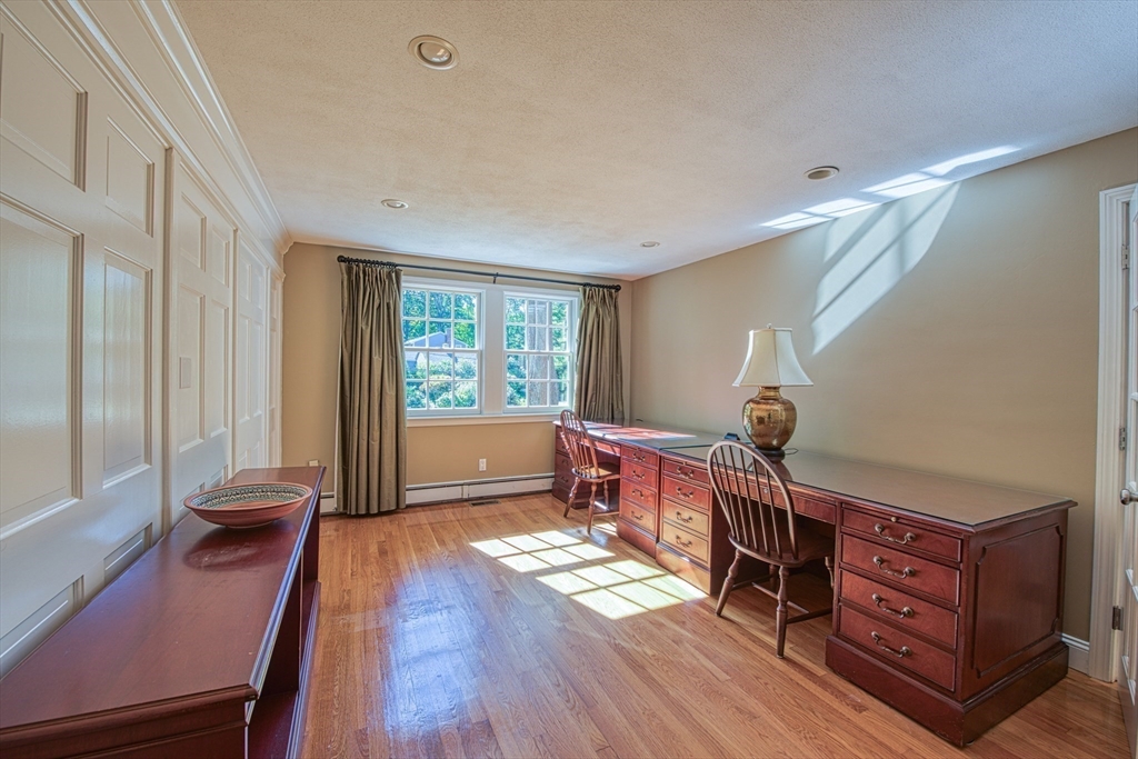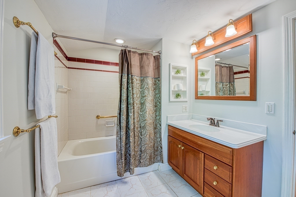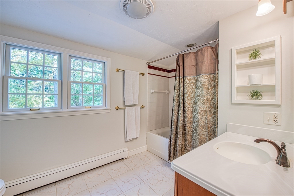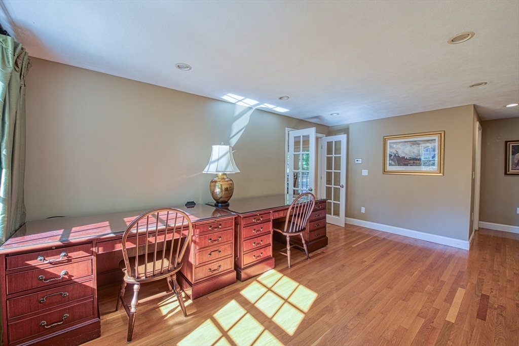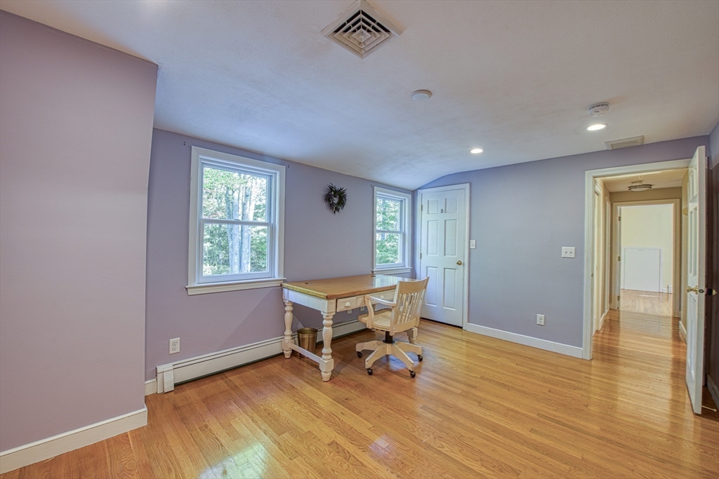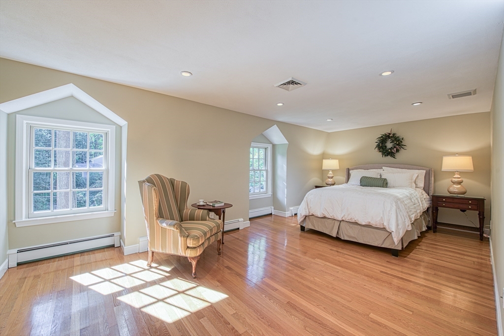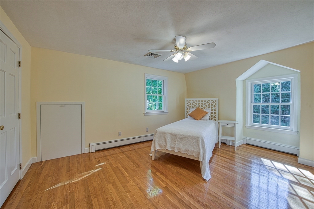 Beautifully updated 4-bedroom, 2-bath home featuring gleaming hardwood floors throughout and a stunning FULLY RENOVATED cabinet-packed cherry kitchen with high-end stainless appliances and granite counters. The adjacent dining area opens to a deck overlooking a private, tree-lined yard—perfect for entertaining! The inviting layout includes a formal living room and a cathedral-ceiling family room with a cozy gas fireplace. A flexible space off the kitchen is ideal as a dining room or home office. The MAIN LEVEL BEDROOM and full bath offer convenience for guests or multigenerational living. Upstairs you will find three spacious bedrooms and another full bath. Enjoy a 2-car garage, a dry basement perfect for storage or future expansion, and a great location close to highway access, commuter rail station, award winning public schools, Lake Massapoag and Sharon town center—a perfect blend of comfort, flexibility, and style in one beautiful home!