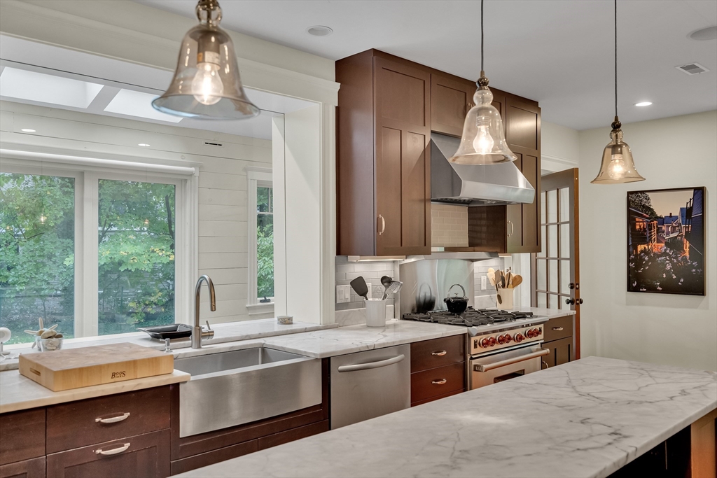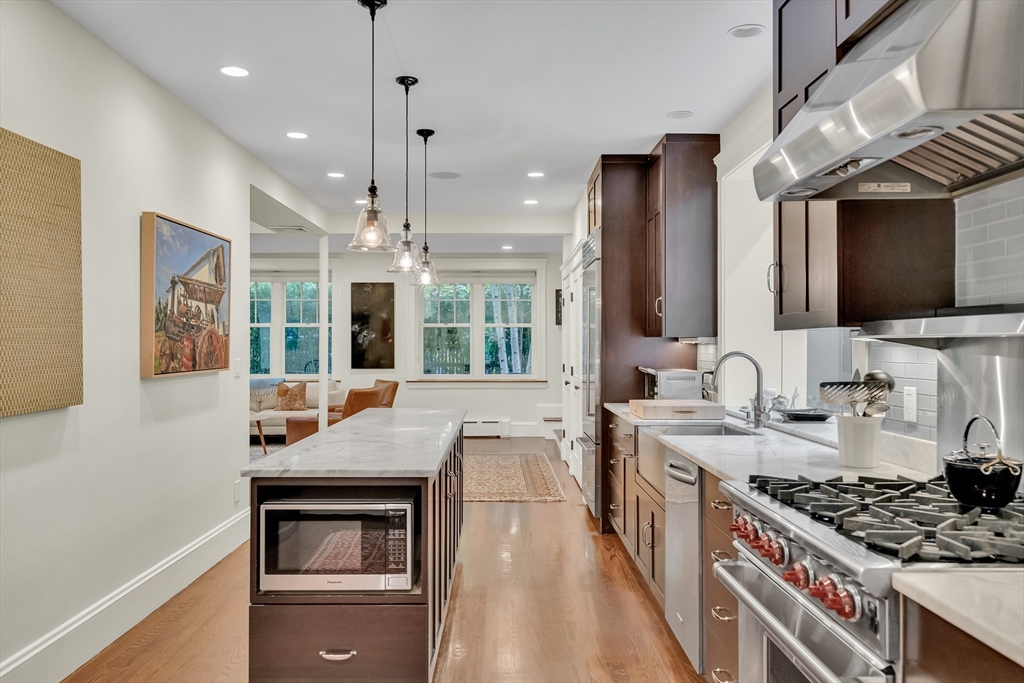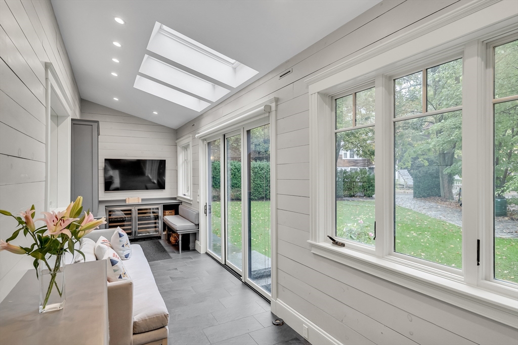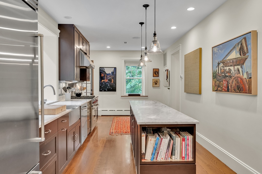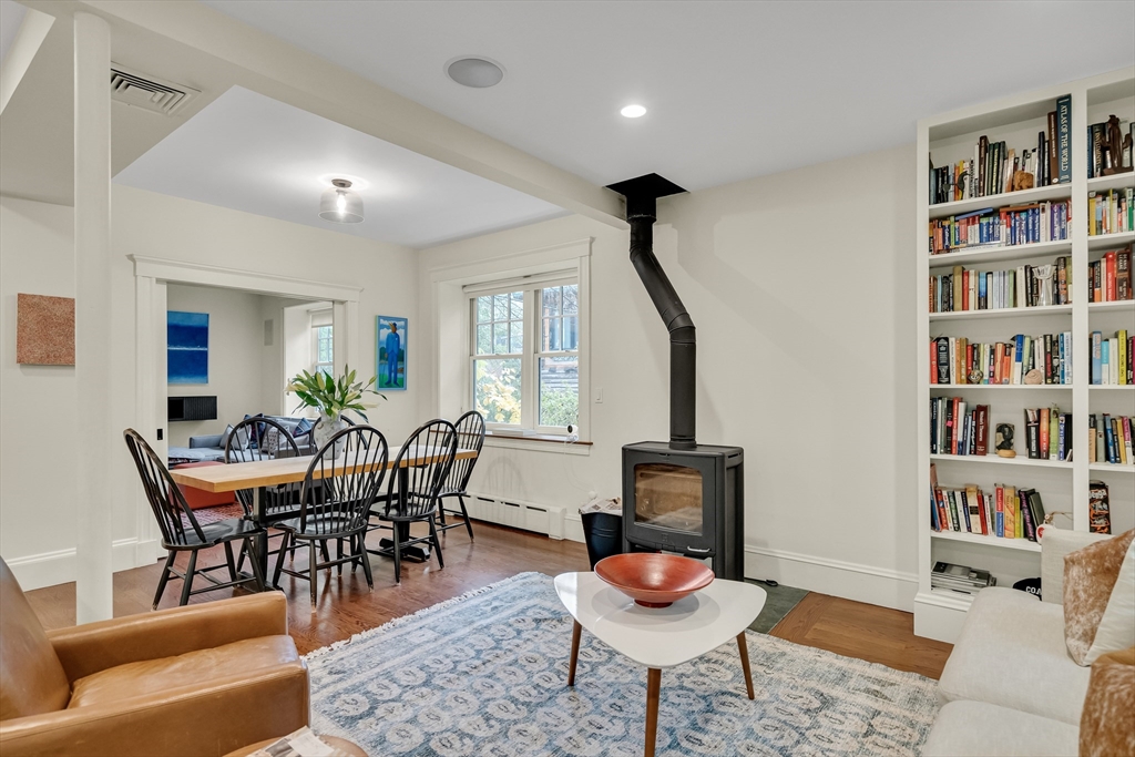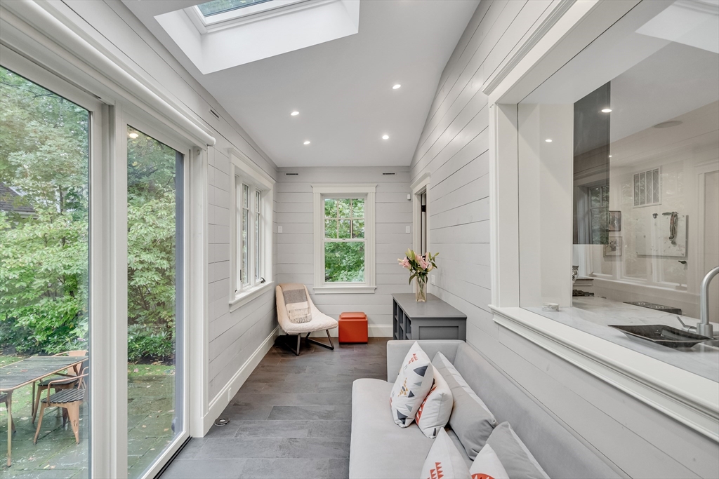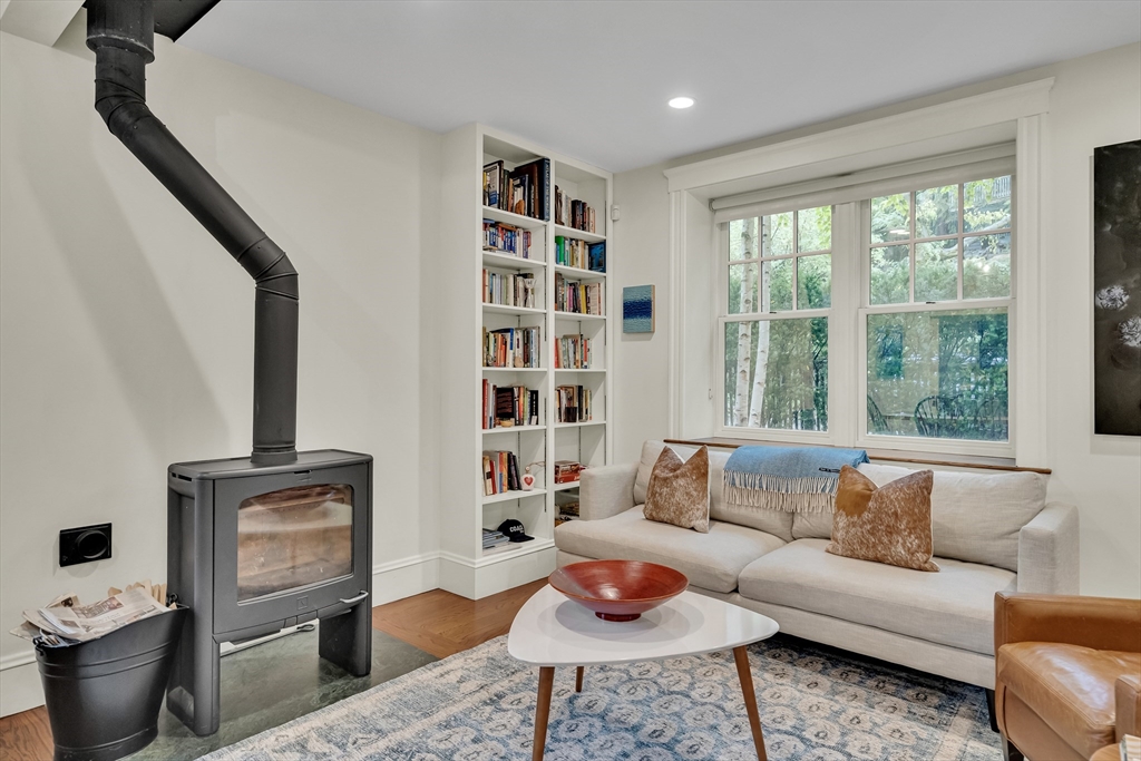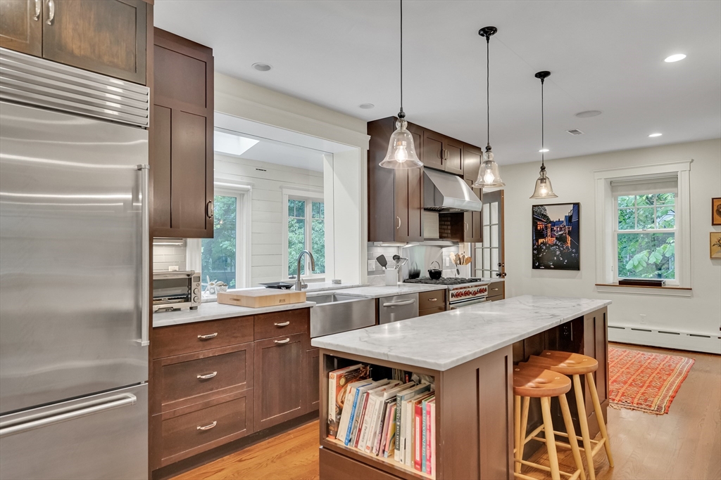 Discover a harmonious mix of style and practicality in this renovated Brookline residence set on a peaceful, tree-lined street. This unique home spans two floors, featuring four bedrooms and two bathrooms. The Chef’s Kitchen includes a subzero refrigerator, Wolf range, Carrara marble countertops, and a generous central island. A versatile sunroom boasts custom built-in storage and twin sub-zero wine fridges, leading directly to a professionally landscaped, irrigated double lot. The living room has a working wood-burning stove with soap stone inlay, and offers custom built-in shelving, cubbies, and storage throughout. The first floor showcases soaring 10-foot ceilings, while gleaming hardwood flooring extends across all living areas. Additional amenities include central air conditioning and two off-street parking spaces. Enjoy the vibrant lifestyle that Brookline provides—recently recognized as the "No.1 Place to Live for Quality of Life in the U.S." by Travel and Leisure.