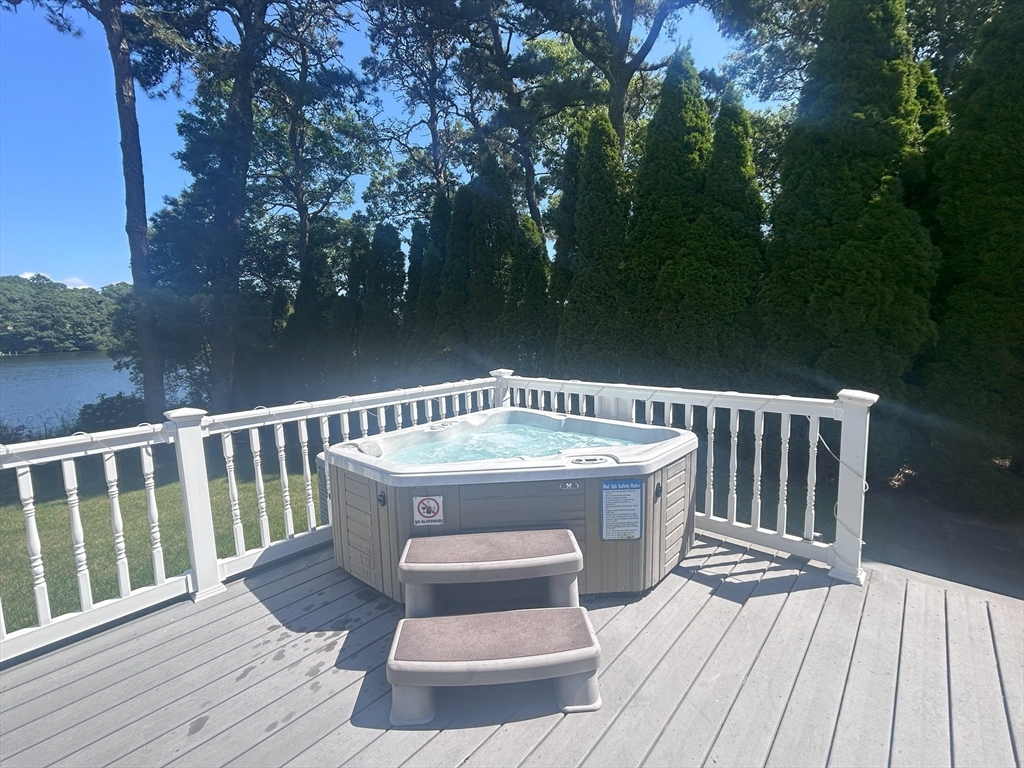 Located in Bourne, this one-level home on Queen Sewell Pond offers beautiful water views & recreation. Queen Sewell Pond is an 18-acre freshwater pond, make memories swimming, kayaking & fishing from your personal dock or the sandy beach nearby. Enjoy a large, flat, grassy backyard & fire pit area, bring the s'mores! The 35-foot deck offers space for outdoor living including a 2-person hot tub. Primary suite at the rear of the home offers privacy w/ its own bathroom & an office space(or could be converted to a WIC). The eat-in kitchen centers the home & leads to a living room w/ easy access to the deck & water views through sliding doors. The gas stove in the living room offers a cozy vibe. The main bathroom is roomy w/ a separate shower & jacuzzi tub. A convenient utility room offers storage & stackable washer/dryer. 2 sheds, outdoor shower, generator. Close to the Cape Cod Canal & Main St. Bourne & it's many amenities. Easy access "over the bridge" to Cape Cod.