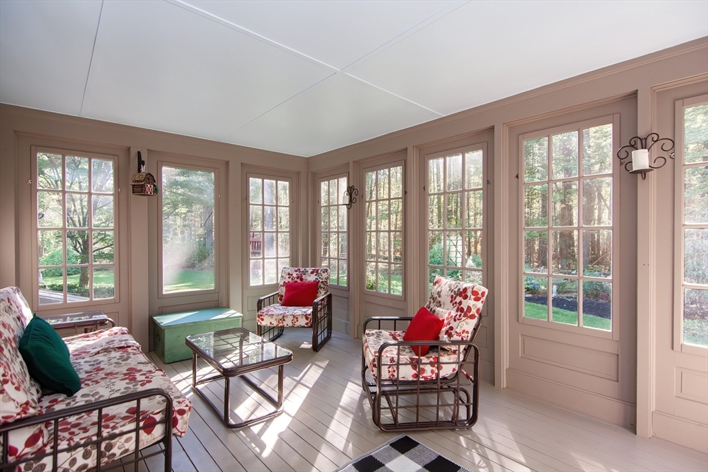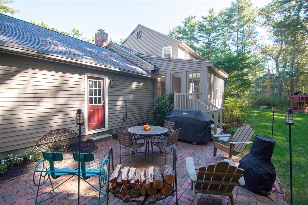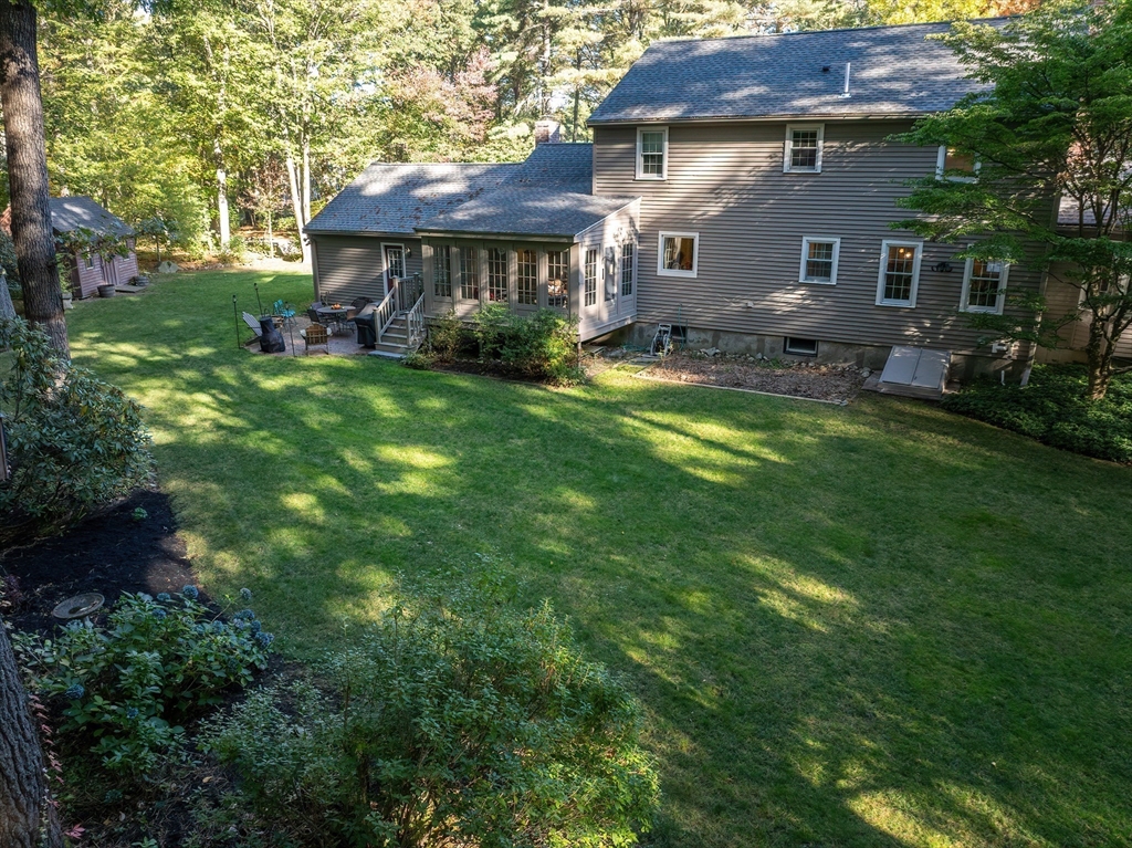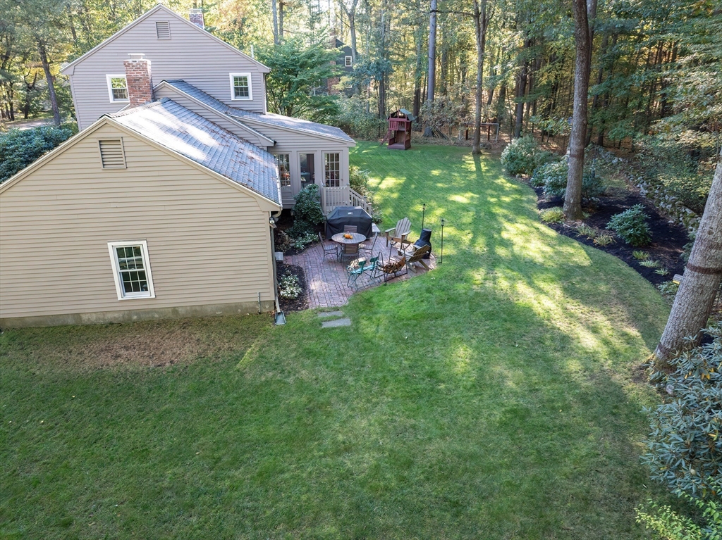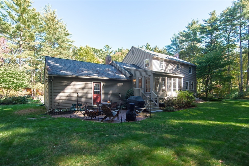 RARE FIND!!! This Classic Colonial is tucked away in a North Sudbury neighborhood cul-de-sac on the border of Concord. Relax in the beautifully landscaped level yard with stone walls, brick patio, custom 12x16 shed and lovely gardens that look out onto protected woods and nature. The interior features a traditional floor plan with an elegant office with cathedral ceilings, front to back fireplaced living room, formal dining room, eat-in kitchen, half bath and fireplaced family room which opens to a 3 season porch as well as a 2-car attached garage. The second floor boasts 4 bedrooms and 2 full bathrooms. The lower level has a spacious finished playroom. Close to schools, rail trail, quaint shops, restaurants, rich history and access to major routes and commuter rail.