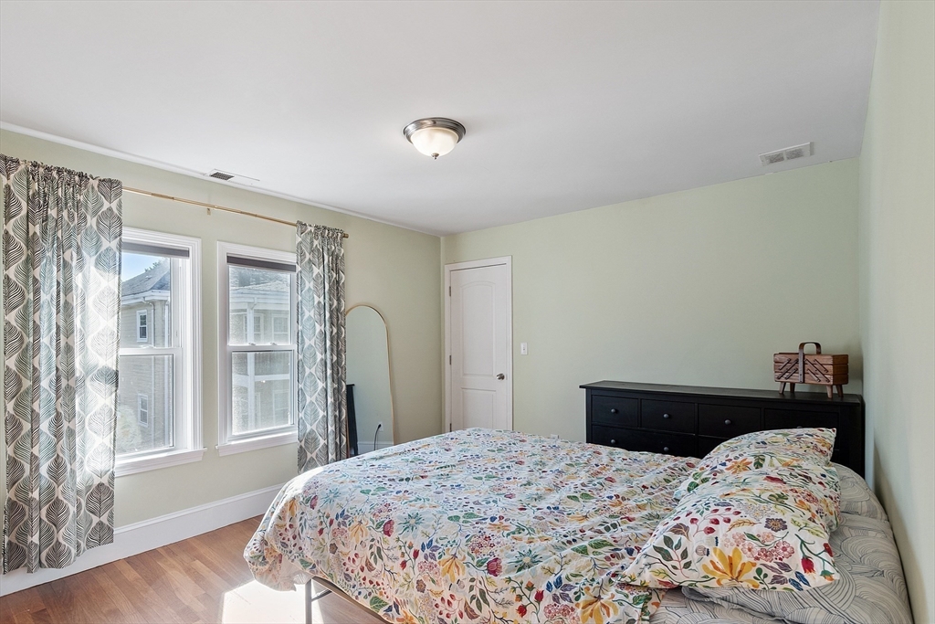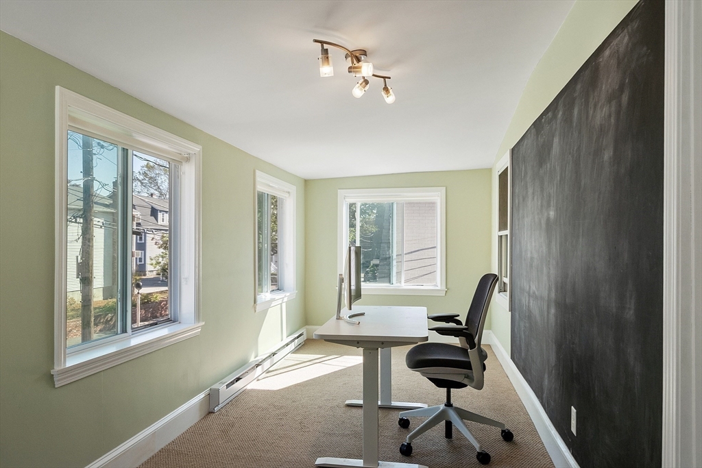 Sunny and spacious well maintained 2nd floor condo in a desirable location on the Cambridge line. Updated and renovated, this 8 room, 3 bedroom, 1 bath unit with central air features an open living and dining room with French doors leading to a sunroom with electric heat, perfect for work, play or exercising and a kitchen with island, stainless steel appliances, gas cooking and plenty of cabinets for storage. 3 nicely sized bedrooms. Fantastic 13'x16' family room with an abundance of windows and natural light. Mostly hardwood floors, recessed lighting. Shared covered porch and yard. Laundry and storage in exclusive basement space. One garage parking space and one driveway space behind in tandem. 2012 roof, furnace/HVAC and hot water tank. Close to Grove St park, #73 bus to Harvard Sq/Station, shops, restaurants and easy commute to Cambridge and Boston.