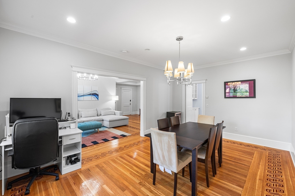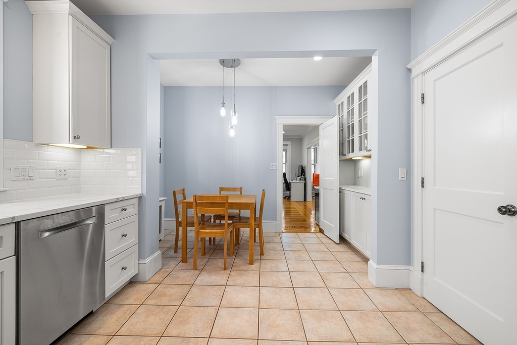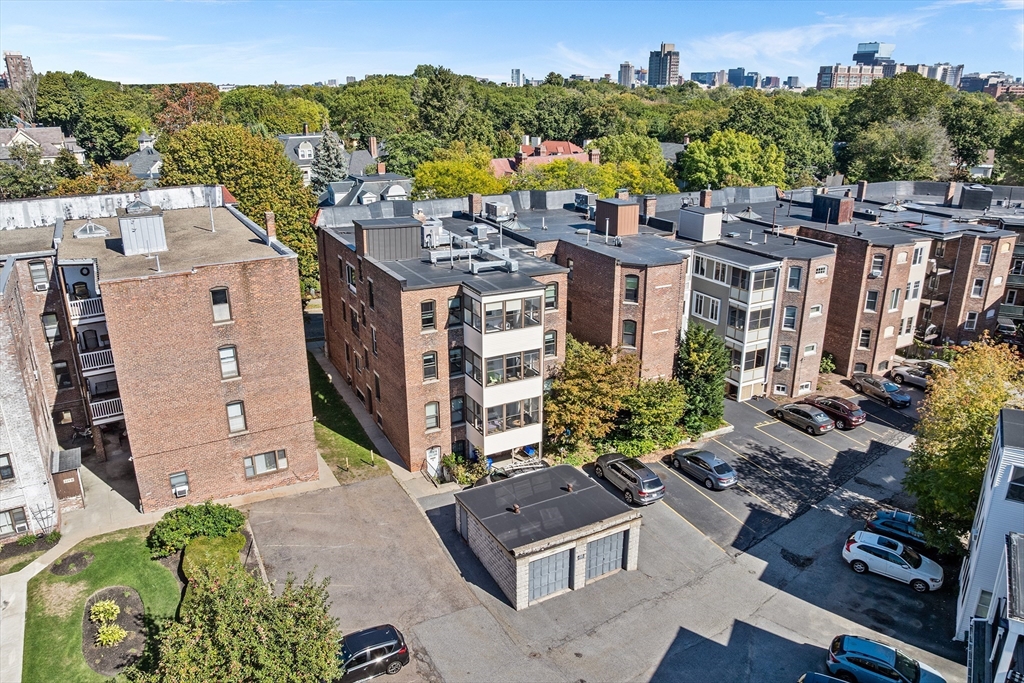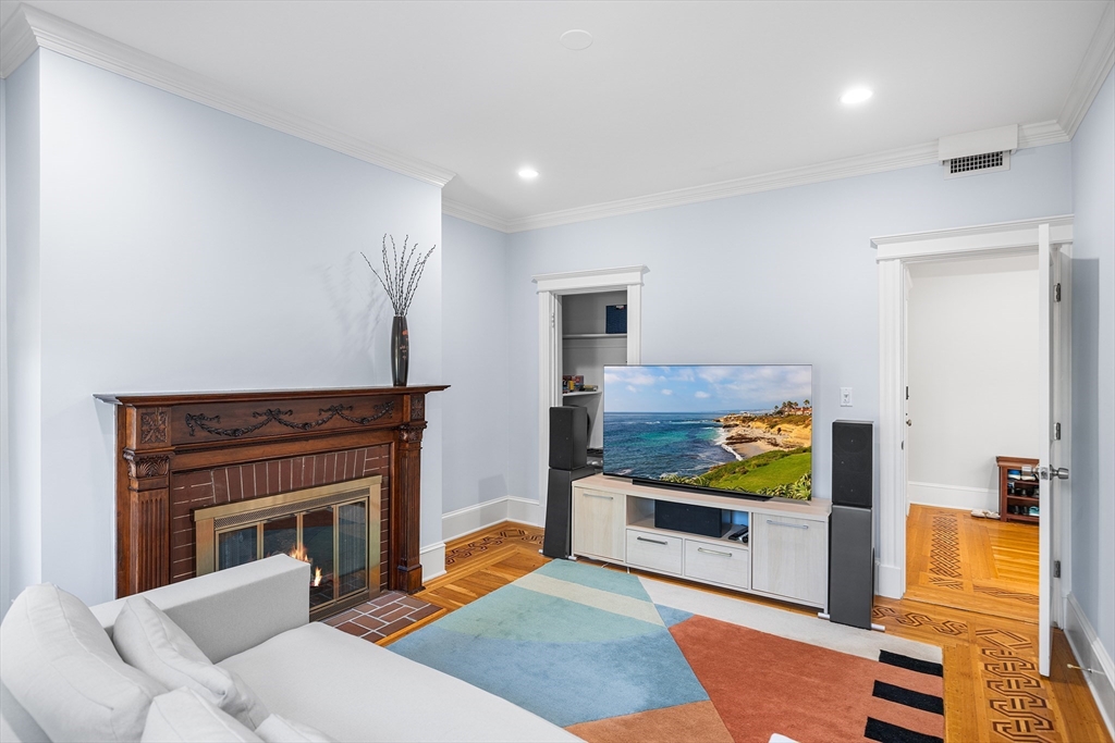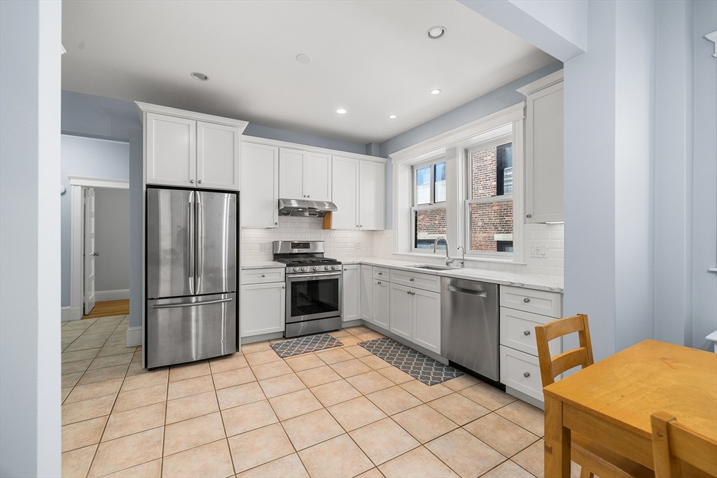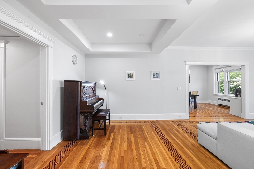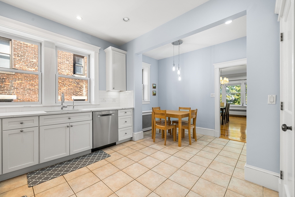 Tucked away on tree-lined Browne Street near Coolidge Corner, this rare and expansive floor-through 4-bedroom home includes an exclusive 2-car garage plus an additional off-street space—three dedicated parking spots in total. A gracious foyer opens to sunlit, generously scaled rooms, including a fireplaced family room and oversized living and dining areas. The updated eat-in kitchen features new appliances, stone countertops, and ample storage. A private hallway leads to four bedrooms, two full baths, and a peaceful three-season porch ideal for a home office or reading nook. With central air, high ceilings, large private storage in the basement, and original architectural details, this home blends classic charm with modern comfort. Set in a well-maintained, 100% owner-occupied building with a newer roof, boiler, and updated electrical. Just moments to the B & C lines, top schools, local parks, and Coolidge Corner's shops and restaurants—this is Brookline living at its best!