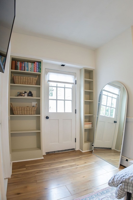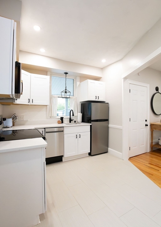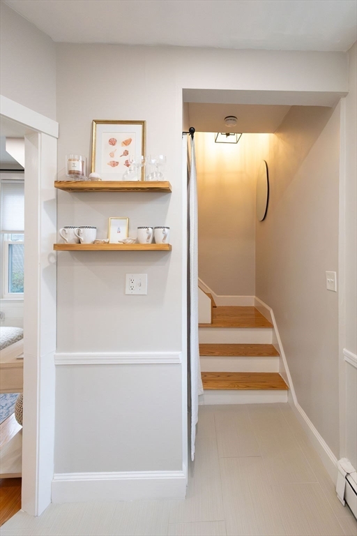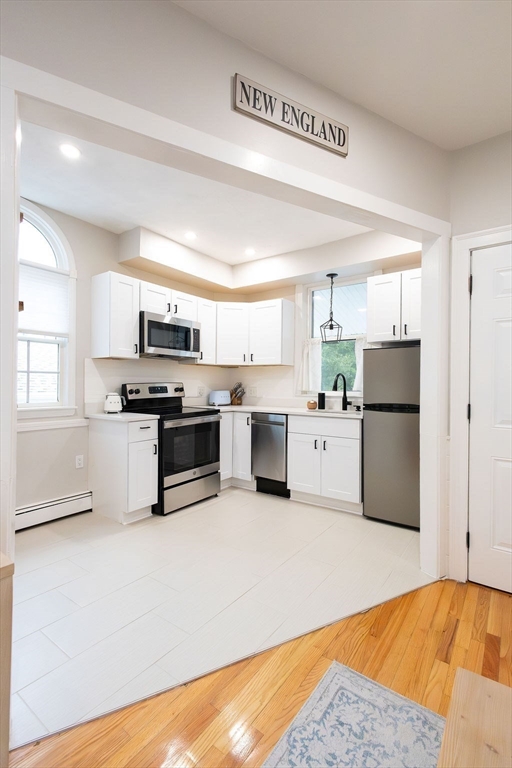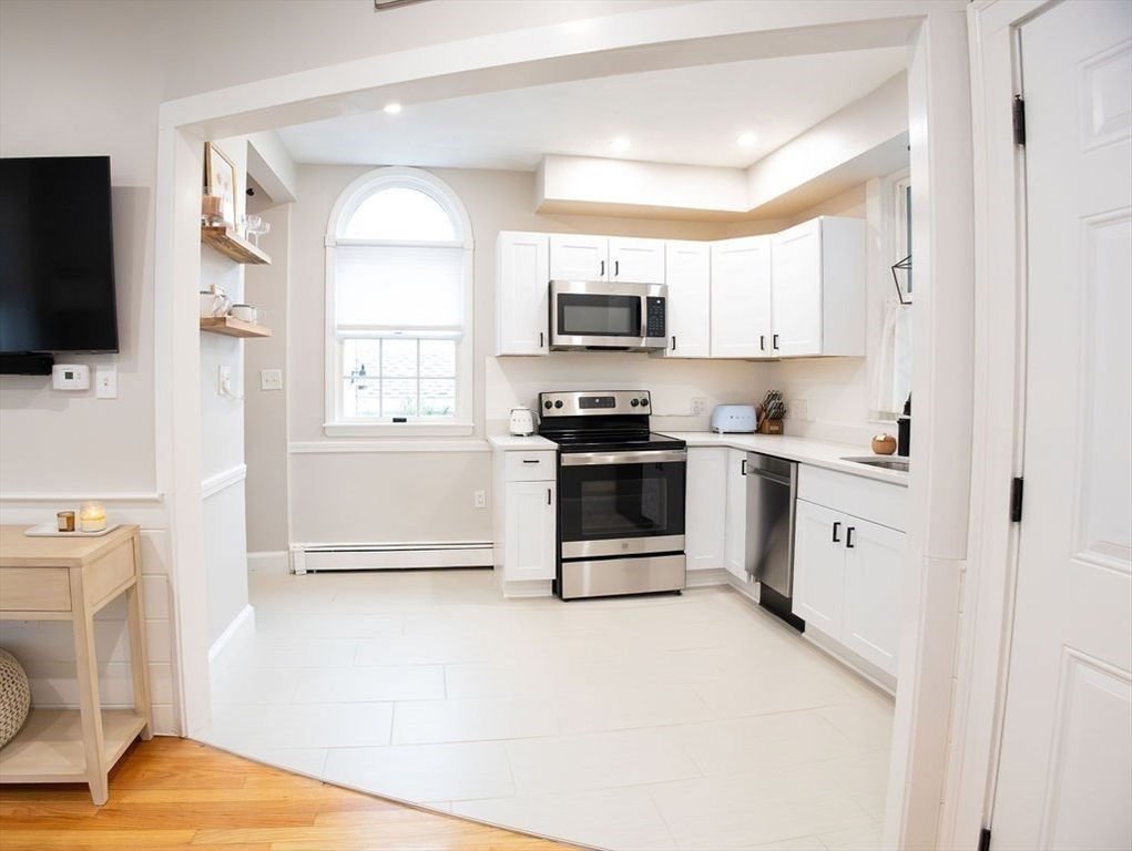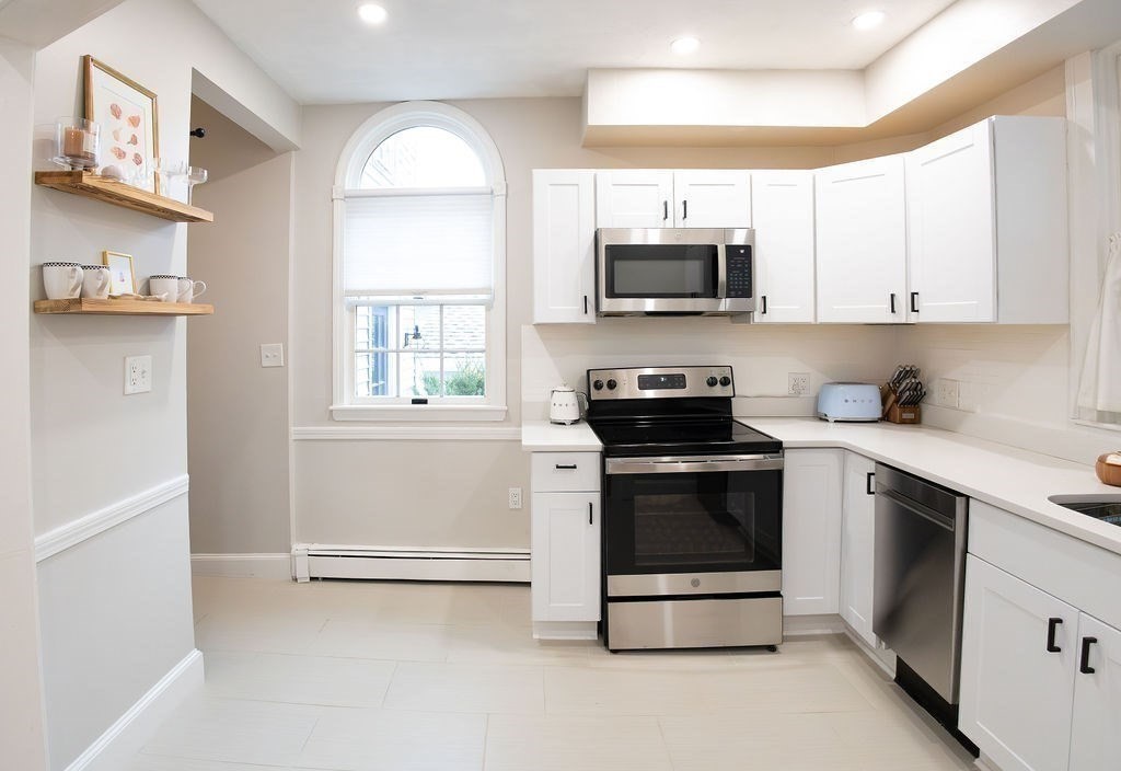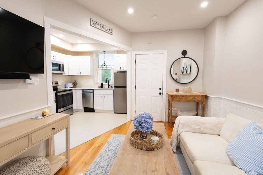 Beautifully updated one-bedroom townhome-style condo, situated along the rail trail leading straight to vibrant downtown and picturesque waterfront. The bright, modern kitchen features sleek white cabinetry, quartz countertops, and stainless steel appliances, opening to a sunny, south-facing living area with newer windows that flood the space with natural light. Hardwood floors run throughout the home. Upstairs, you’ll find a remodeled bath with a tiled shower and a spacious bedroom complete with a walk-in closet. Private balcony—perfect for morning coffee or take in the fireworks during Newburyport’s famous Yankee Homecoming. Ample on-street parking plus one deeded spot, a fenced side yard with a garden, and a nearly private covered porch entry. The HOA fee incl heat, hot water, water, and sewer, small pets welcome. This charming and efficient home offers a combination of location, comfort, and value—ready for you to move in and enjoy everything Newburyport has to offer!