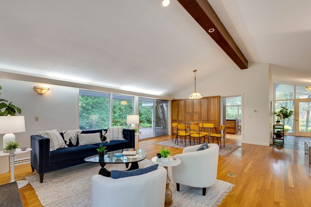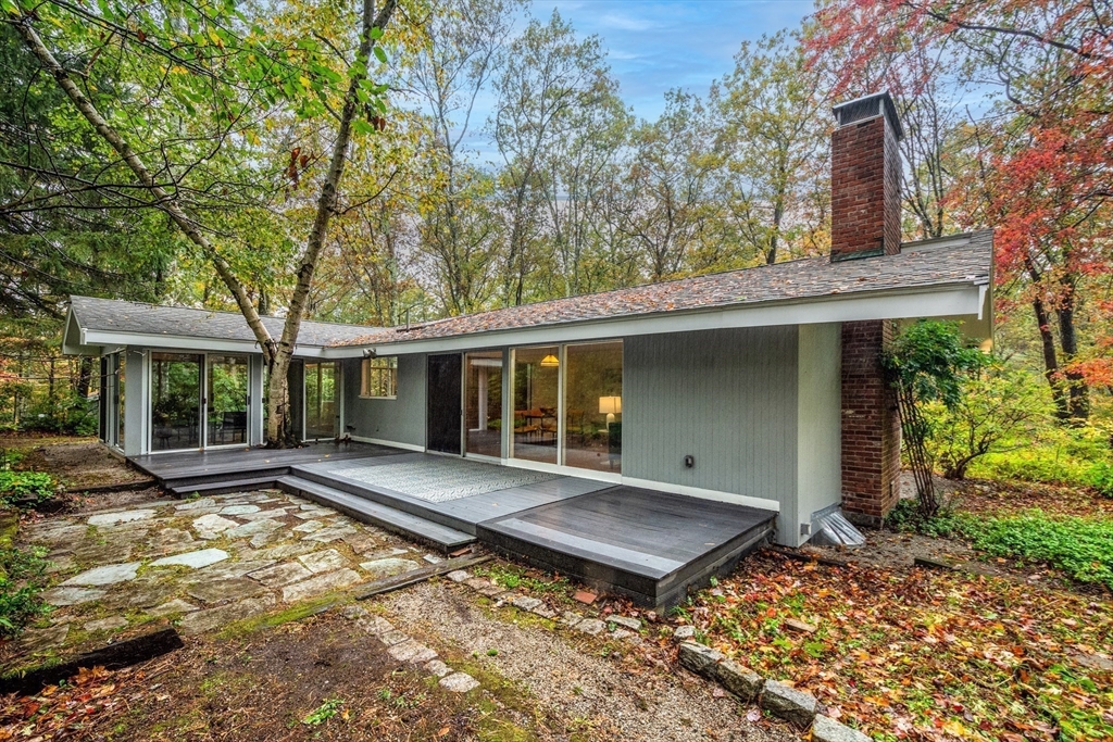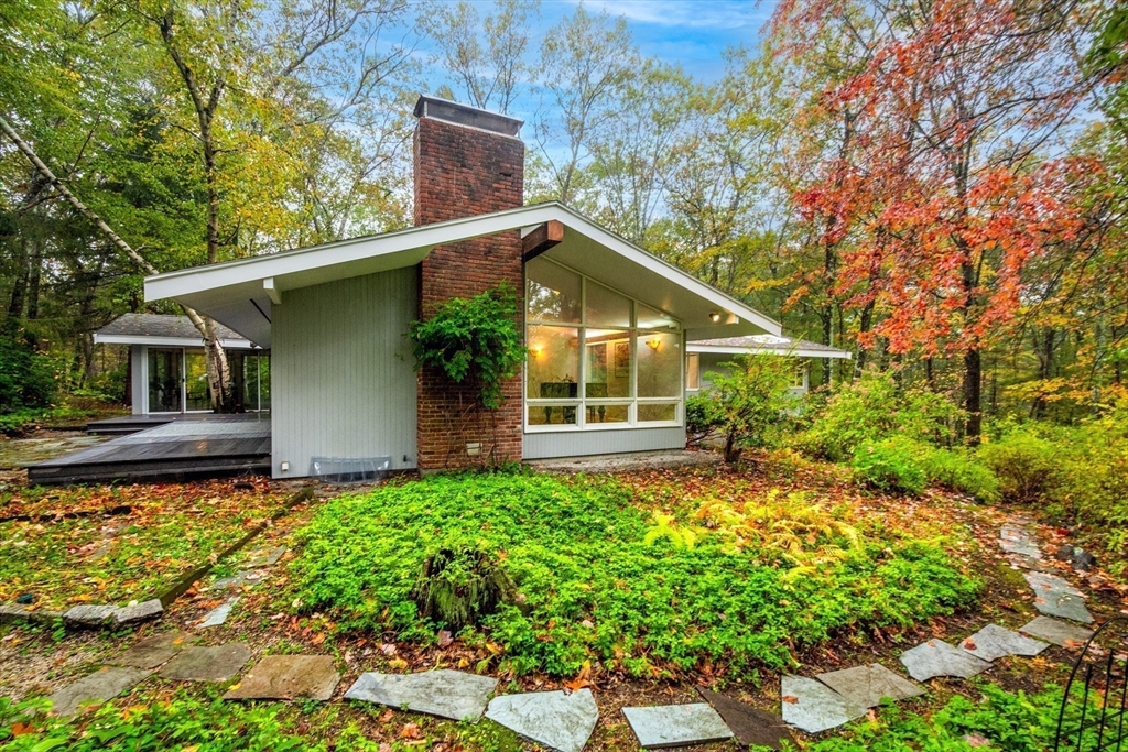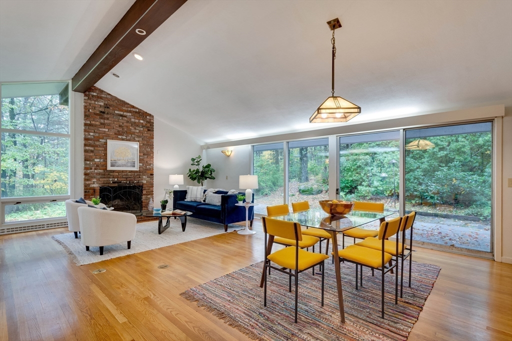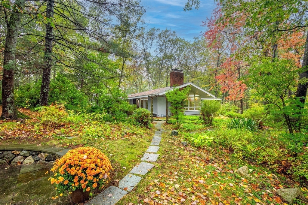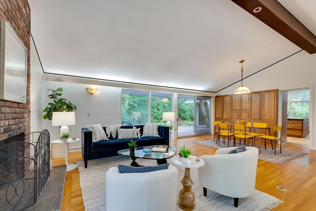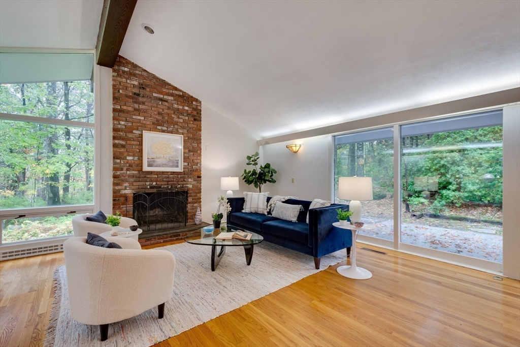 Located in the historic Brown's Wood neighborhood and designed by architect Stanley Meyers, this striking Mid-Century Modern residence has soaring cathedral ceilings, walls of glass, and an open floorplan. The main level offers effortless single-floor living, while the lower level with separate entrance provides flexible space for a private office, fitness area, or au pair opportunity. A floor-to-ceiling brick fireplace anchors the living area for cozy winter evenings, while a three-season sunroom/porch and adjoining deck invite relaxed outdoor living. Surrounded by lush perennial gardens, stone paths through the woodlands, and a private patio, this home offers an exceptional connection to nature. Additional highlights include a two-car garage and forced air heating by gas. Deeded access to the nearby coveted Valley Pond Swim and Boat Club enhances the community experience. All within easy reach of Lincoln’s town center, expansive network of trails, as well as major commuting routes.