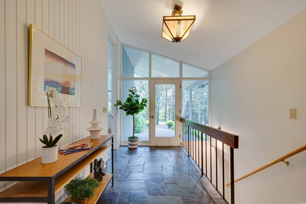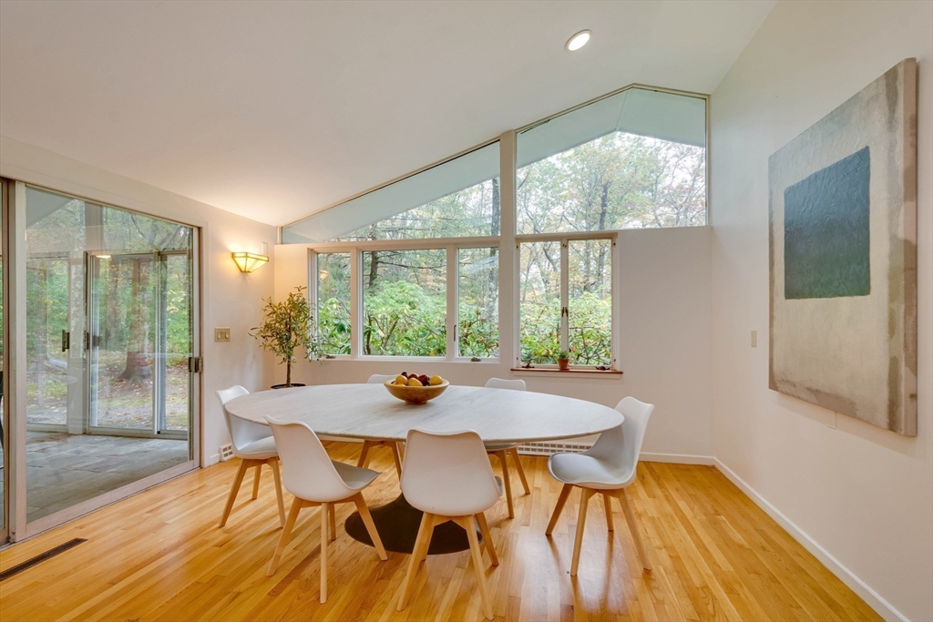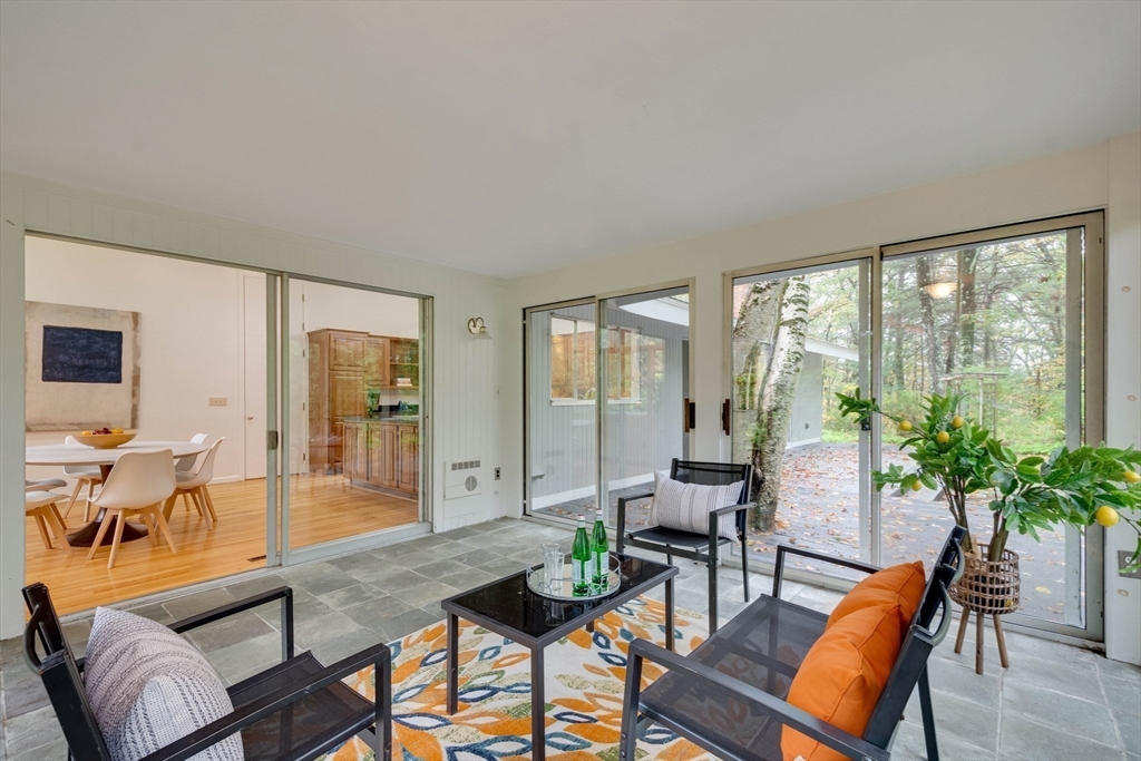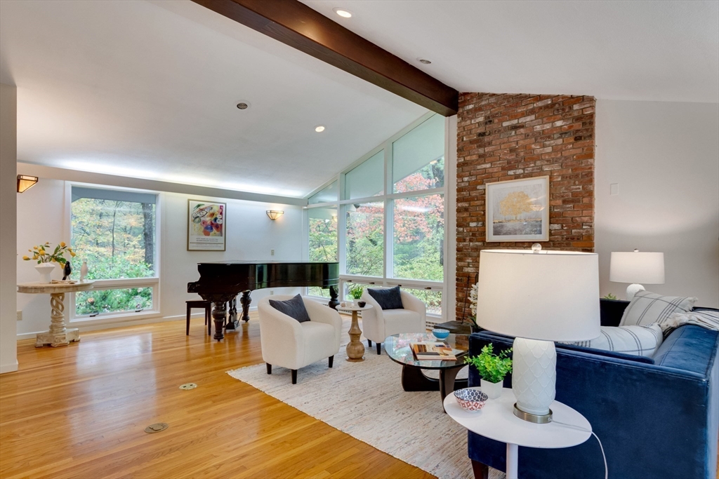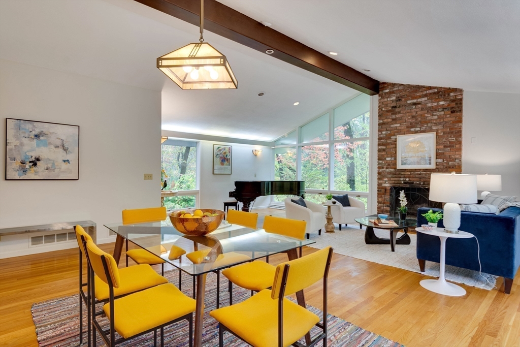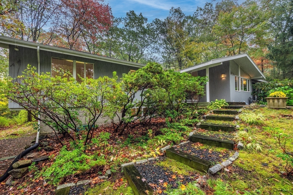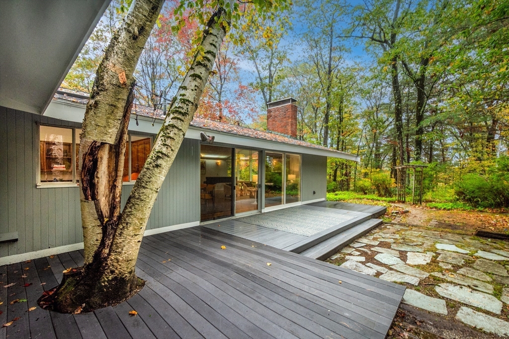 Located in the historic Brown's Wood neighborhood and designed by architect Stanley Meyers, this striking Mid-Century Modern residence has soaring cathedral ceilings, walls of glass, and an open floorplan. The main level offers effortless single-floor living, while the lower level with separate entrance provides flexible space for a private office, fitness area, or au pair opportunity. A floor-to-ceiling brick fireplace anchors the living area for cozy winter evenings, while a three-season sunroom/porch and adjoining deck invite relaxed outdoor living. Surrounded by lush perennial gardens, stone paths through the woodlands, and a private patio, this home offers an exceptional connection to nature. Additional highlights include a two-car garage and forced air heating by gas. Deeded access to the nearby coveted Valley Pond Swim and Boat Club enhances the community experience. All within easy reach of Lincoln’s town center, expansive network of trails, as well as major commuting routes.