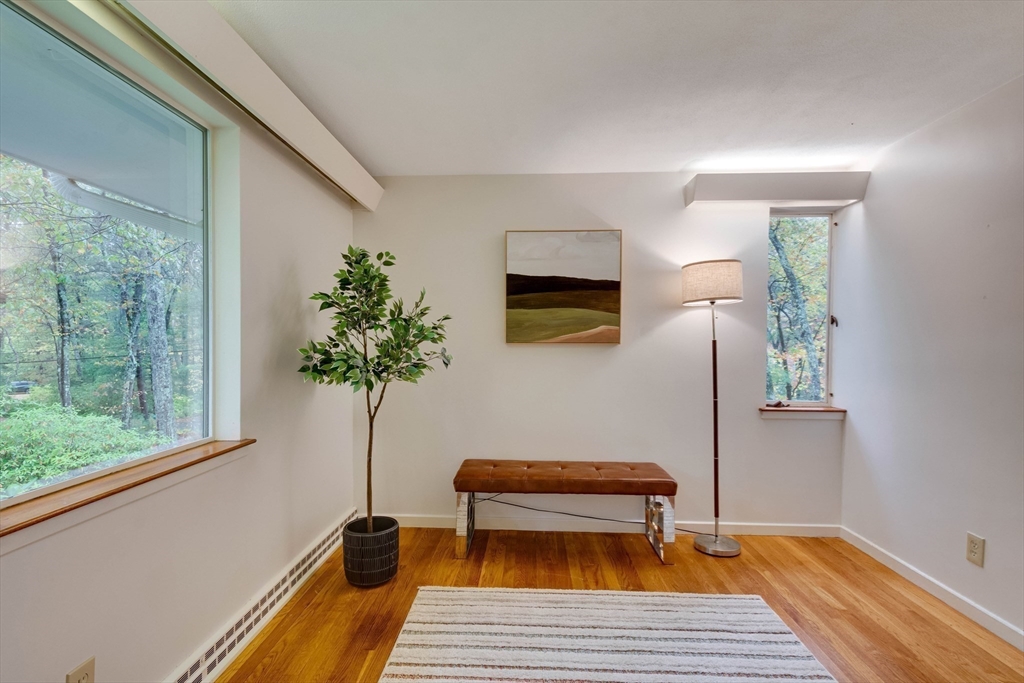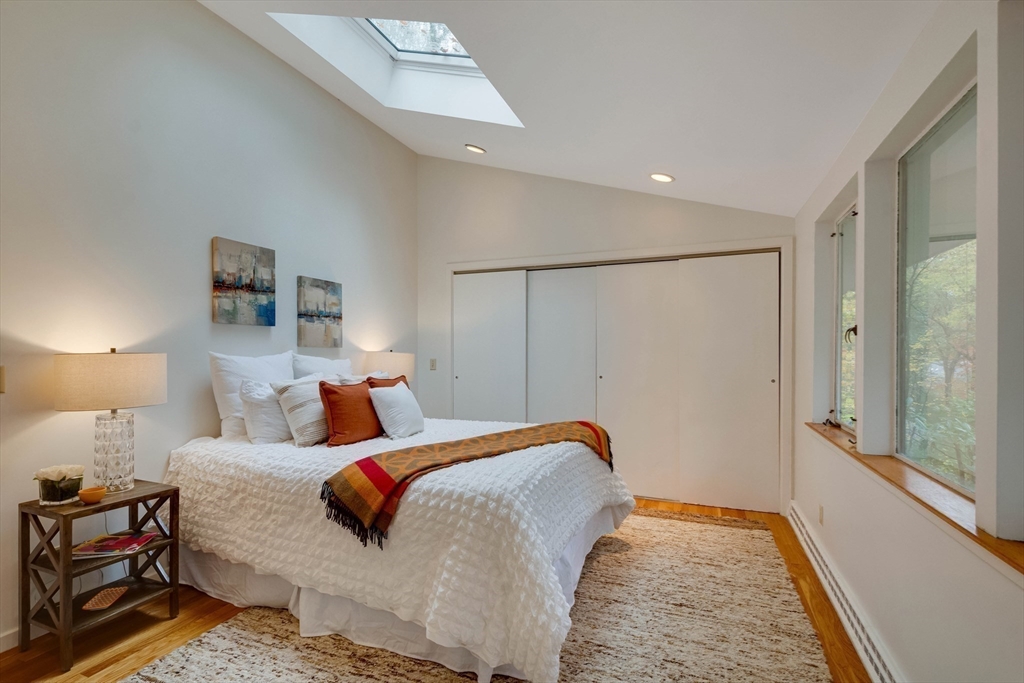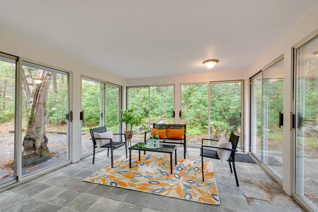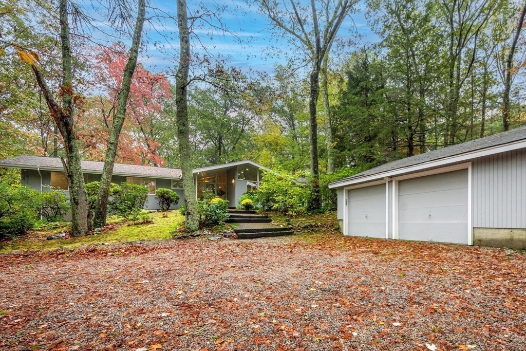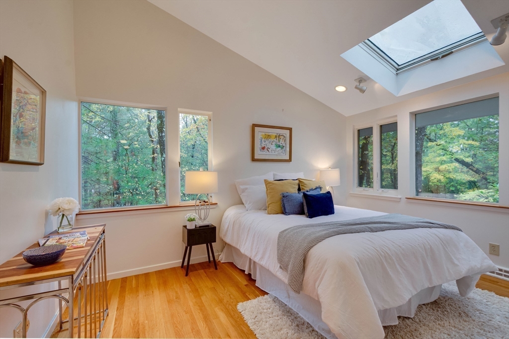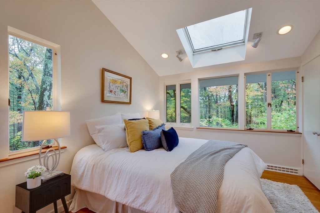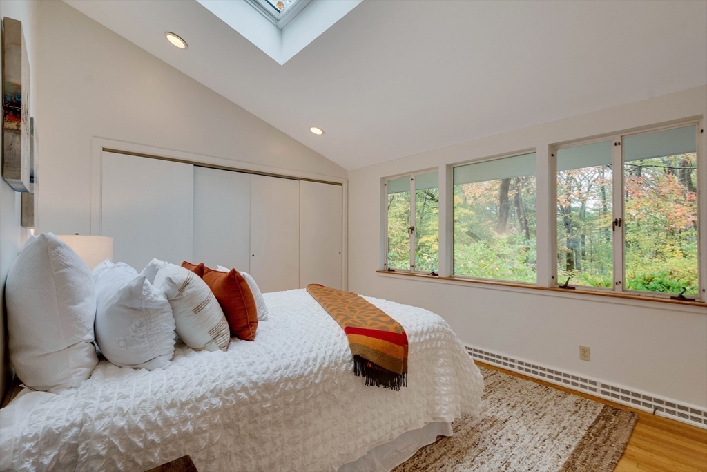 Located in the historic Brown's Wood neighborhood and designed by architect Stanley Meyers, this striking Mid-Century Modern residence has soaring cathedral ceilings, walls of glass, and an open floorplan. The main level offers effortless single-floor living, while the lower level with separate entrance provides flexible space for a private office, fitness area, or au pair opportunity. A floor-to-ceiling brick fireplace anchors the living area for cozy winter evenings, while a three-season sunroom/porch and adjoining deck invite relaxed outdoor living. Surrounded by lush perennial gardens, stone paths through the woodlands, and a private patio, this home offers an exceptional connection to nature. Additional highlights include a two-car garage and forced air heating by gas. Deeded access to the nearby coveted Valley Pond Swim and Boat Club enhances the community experience. All within easy reach of Lincoln’s town center, expansive network of trails, as well as major commuting routes.