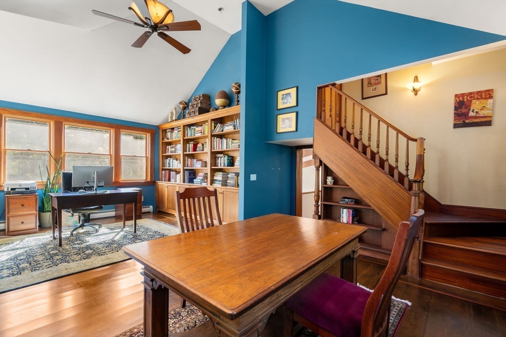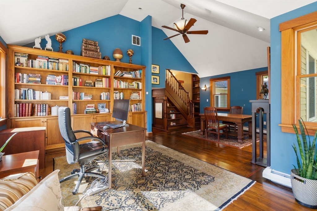 Set in a popular neighborhood this carefully crafted home offers a contemporary style and beautiful views from the private 3+ acres of land yet boasts a walk to all location. High ceilings, spacious rooms, open floor plan and walls of glass allow natural light to beam throughout. There are three finished floors of living space including an aupair/inlaw. Move in ready this home recently went through extensive renovations offering a natural flow for entertaining or just enjoying with family and friends. Expanded kitchen with large island, dining room, family room with vaulted ceiling has access to the back deck. There is a guest room/office, full bath, laundry room, mudroom, heated garage complete first floor. Second floor hosts the spacious primary with loft and spa like bath, good sized additional bedrooms, custom library with builtins. The lower level has a rec room, full gym, guest bedroom, full bath and kitchenette that opens to a patio and manicured back yard. Not to be missed.
