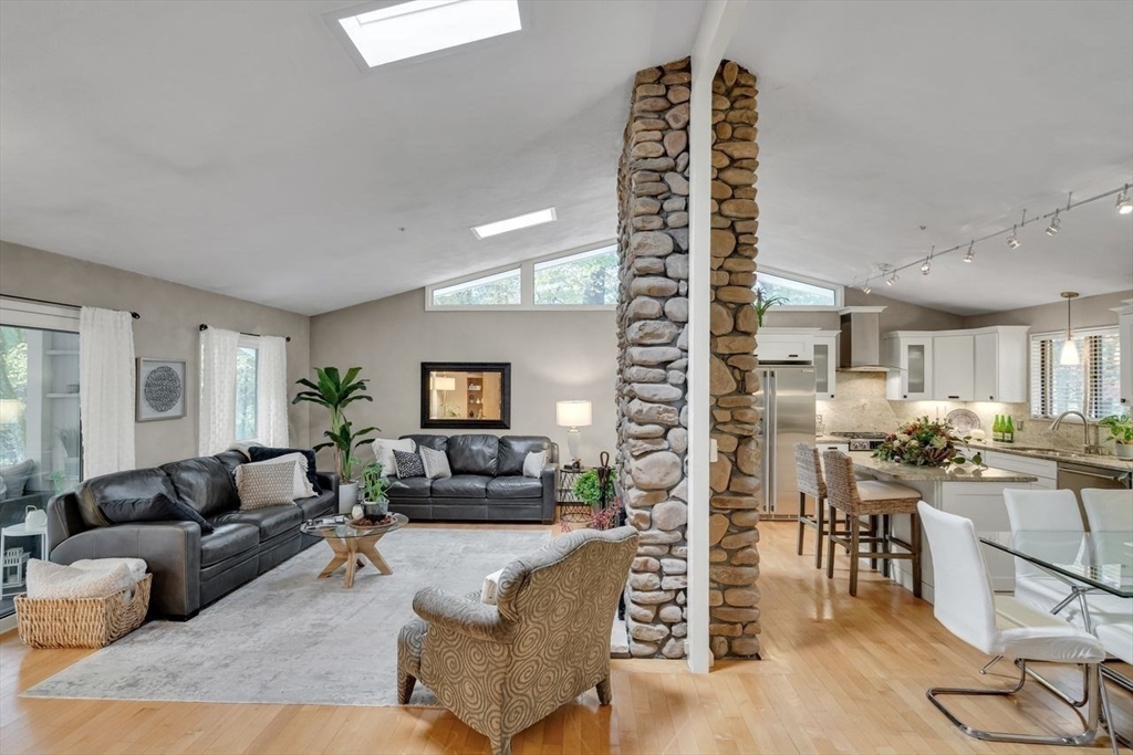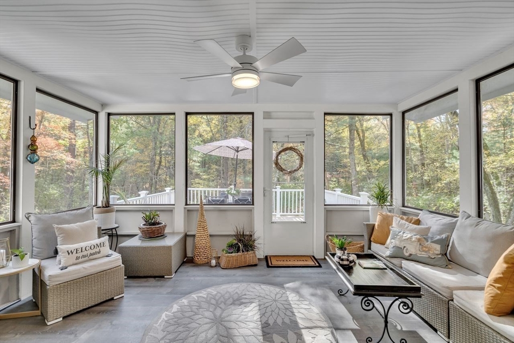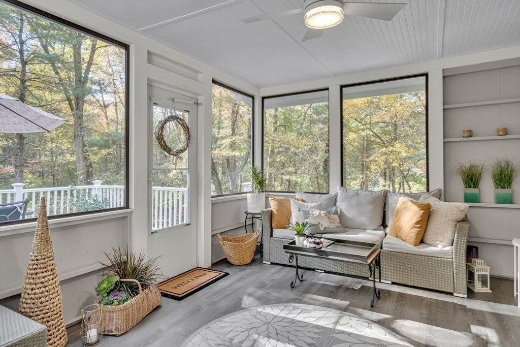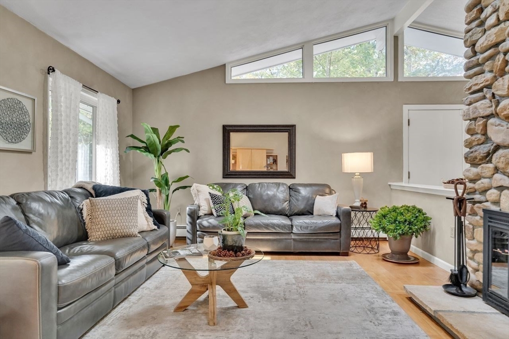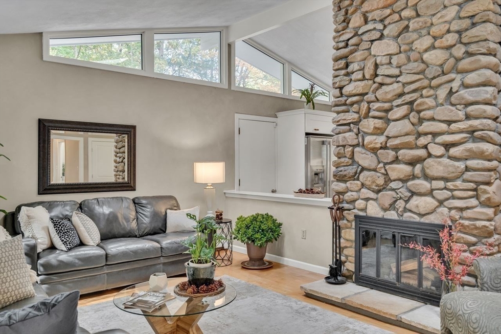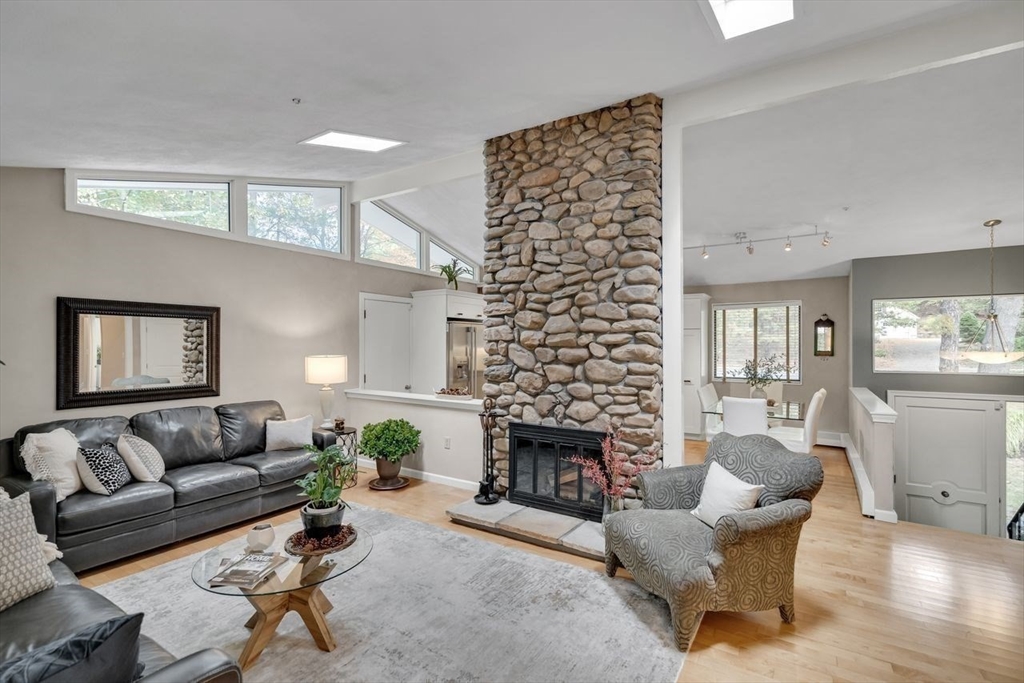Welcome to 6 Westward Circle, a stunning home in one of North Reading’s most sought-after neighborhoods, located at the back entrance of Hood Elementary School. This meticulously maintained property is perfect for families and entertaining. Inside, you'll find an updated kitchen with a charming dining area, and a spacious living room with a cathedral ceiling and a floor-to-ceiling river rock wood-burning fireplace. French doors lead to a large screened-in porch, ideal for outdoor gatherings. Outside, a newer attached porch overlooks 1.25 acres of landscaped yard bordering conservation land—great for barbecues and sunset dinners. The main level features a spacious primary bedroom with a spa-like ensuite, plus three additional bedrooms and two full updated bathrooms. The huge family room with another fireplace and walk-out slider adds space and convenience. Recent updates include a Brand new Septic tank, heating, and electrical. More than a house, It's a place where memories are made.