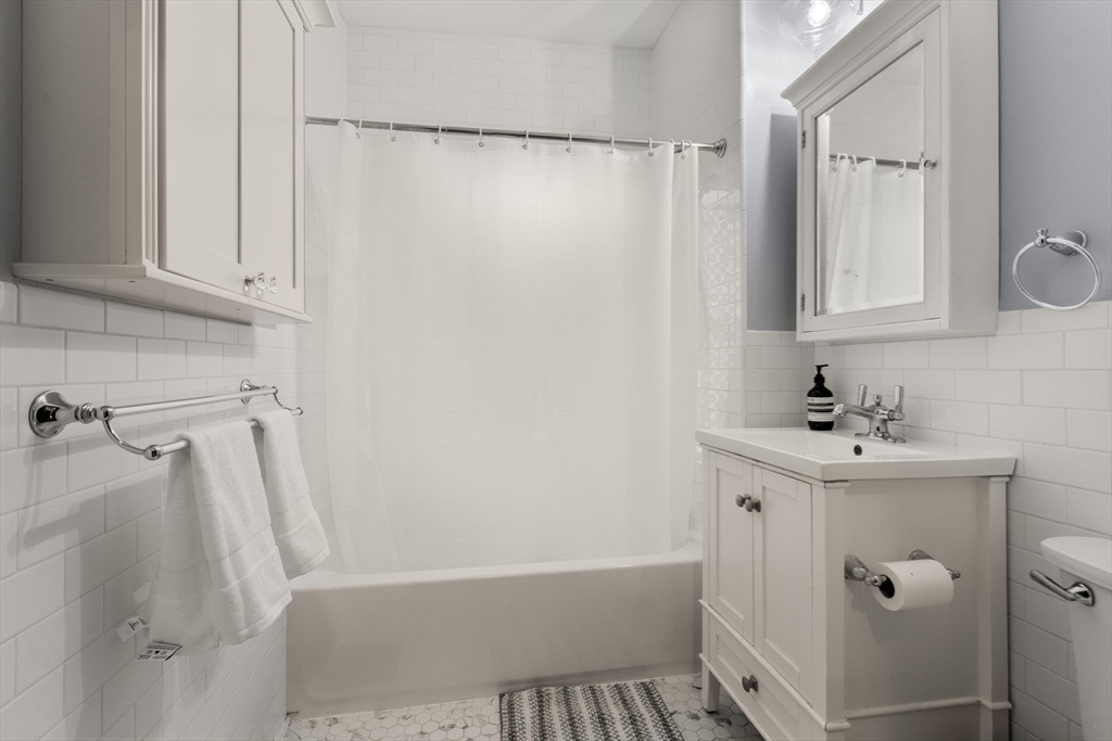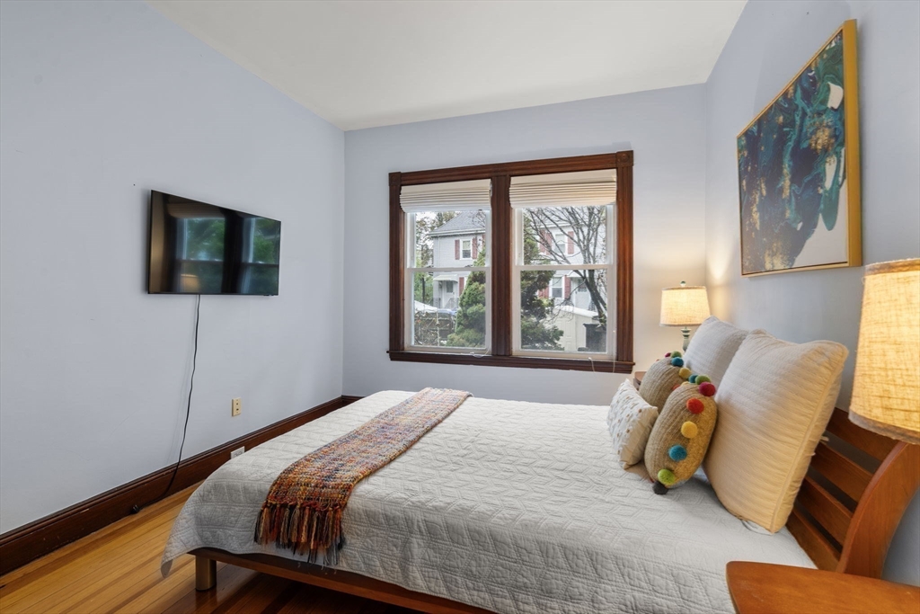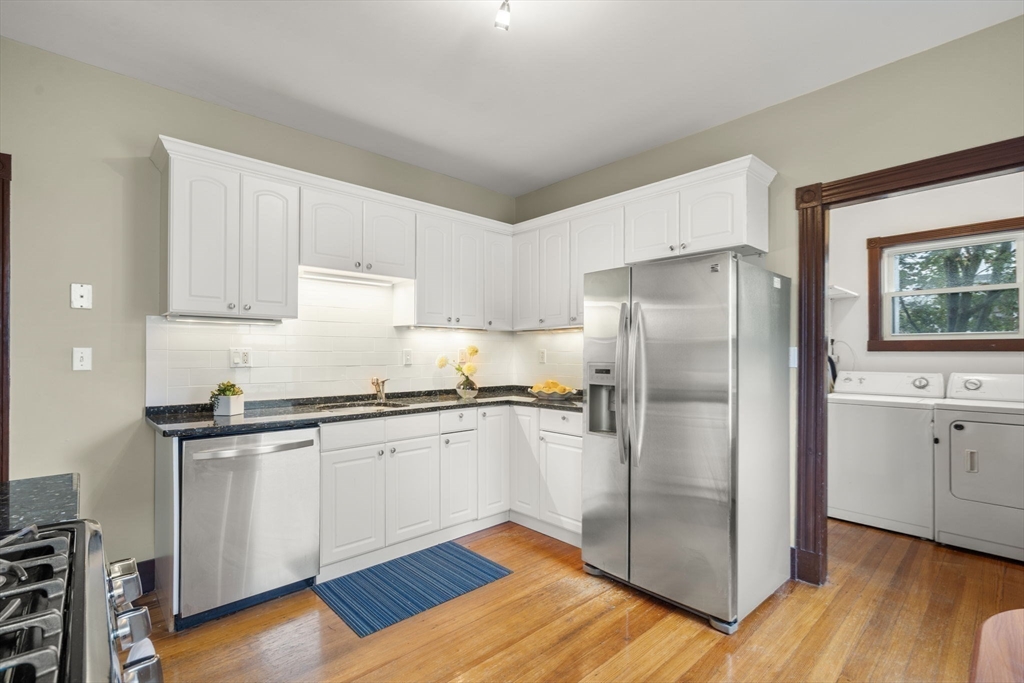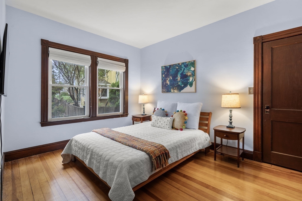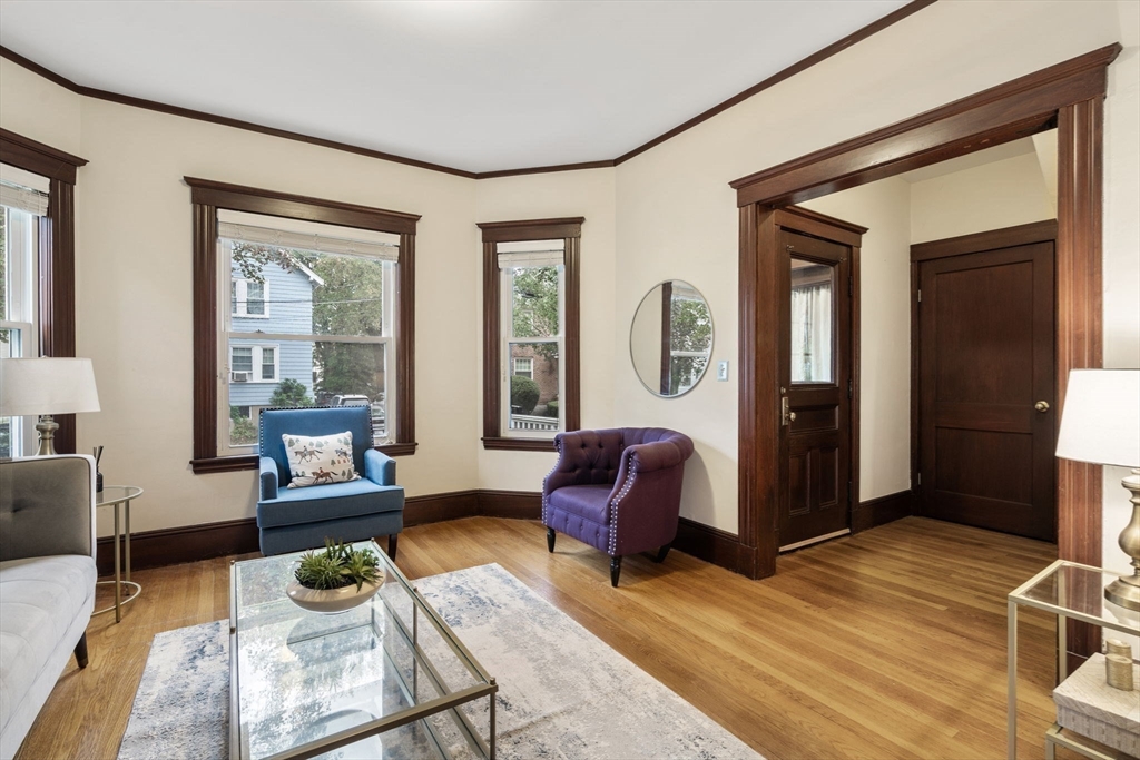Located on a quiet, tree-lined street in Belmont's popular Waverly Sq neighborhood, this bright 2-3 bedroom, 1.5 bathroom condominium offers the perfect balance of generous living space, modern updates and handsome period details. The flexible, open floor plan features a welcoming foyer that leads to a gracious living room with bay windows, a formal dining room with vintage built-ins and a renovated, eat-in kitchen with white cabinets and granite. Two large, sun-filled bedrooms are flanked by a tastefully renovated bath. A bonus room, currently used as a sunny office could serve as a 3rd bedroom. Featuring high ceilings, hardwood floors, guest 1/2 bath, central air and in-unit laundry. Enjoy the convenience of two, unencumbered, off-street parking spaces and a grassy shared backyard. This well-maintained, two-family property has had numerous infrastructure upgrades and offers ample basement storage. Walk to commuter rail, bus, shops and eateries. Close to major routes, schools & parks.