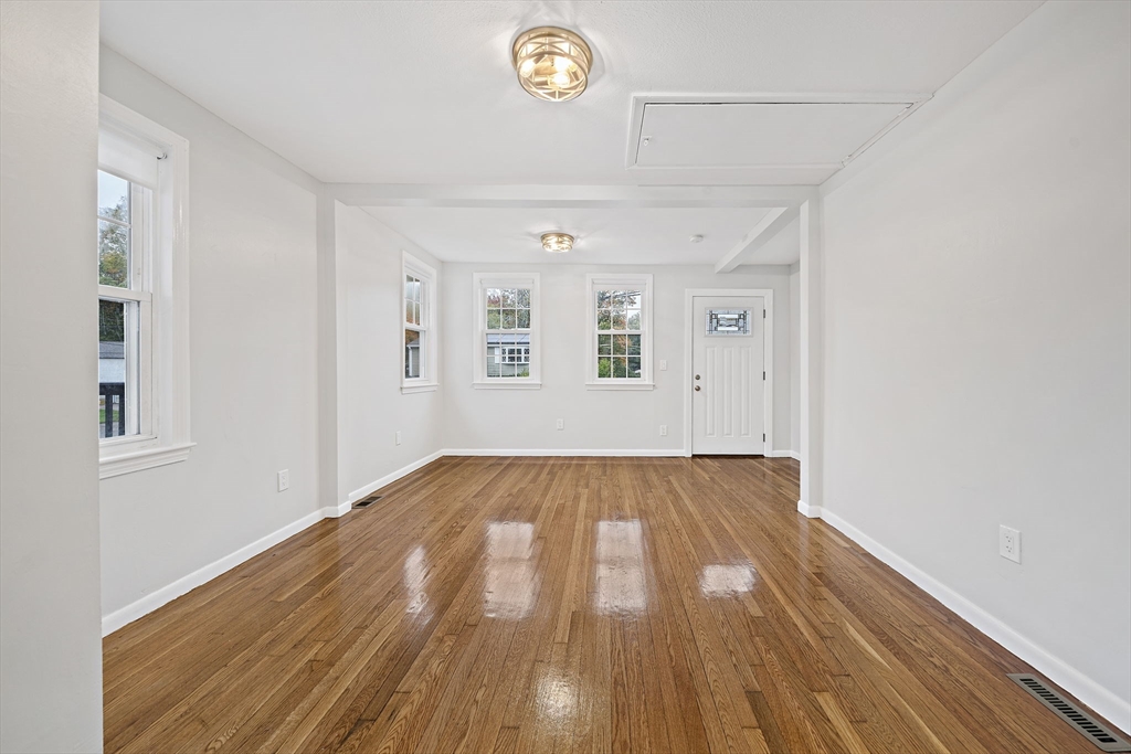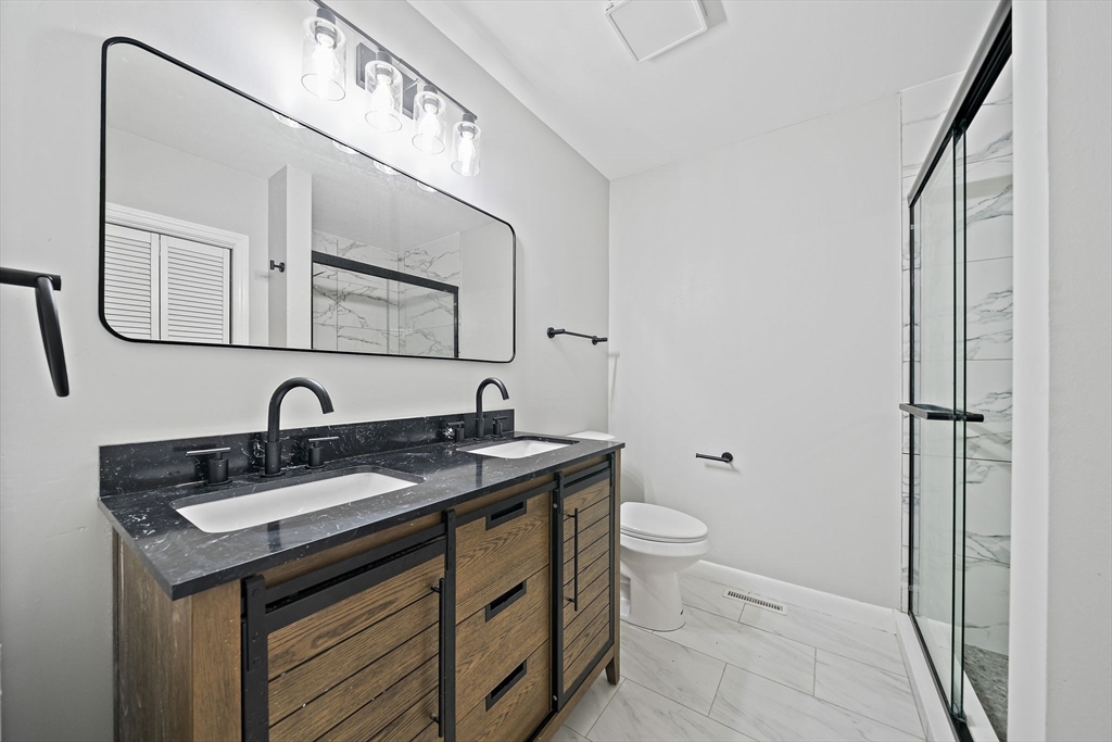 Open House SAT 10/18 & SUN 10/19 From 12-1:30! Recently renovated generously-sized 5 bedroom, 4 full bath Colonial on corner lot in a convenient side street location! Has all brand new Vinyl Siding! First floor features shining hardwood floors throughout. Spacious main suite w/ walk-in closet & beautiful new full bath w/tiled shower stall! New kitchen has quartz counters, island w/ pendant lighting, tile backsplash. Open dining rm steps up to the bright family rm w/ double picture windows & recessed lighting. Second floor features renovated full bath w/ tile flr & tiled shower w/ tub plus 2 good-sized bedrooms w/ gleaming hardwood floors. The lower level is partially finished w/ an additional bedroom, full bath & play room. Furnace is brand new; roof was redone in 2023; fresh interior paint; new exterior & interior doors; front walkway redone; double driveways; FHA x Gas w/ Central Air; fenced yard; front & rear decks; new lights, switches & outlets; newer windows. Must See!!