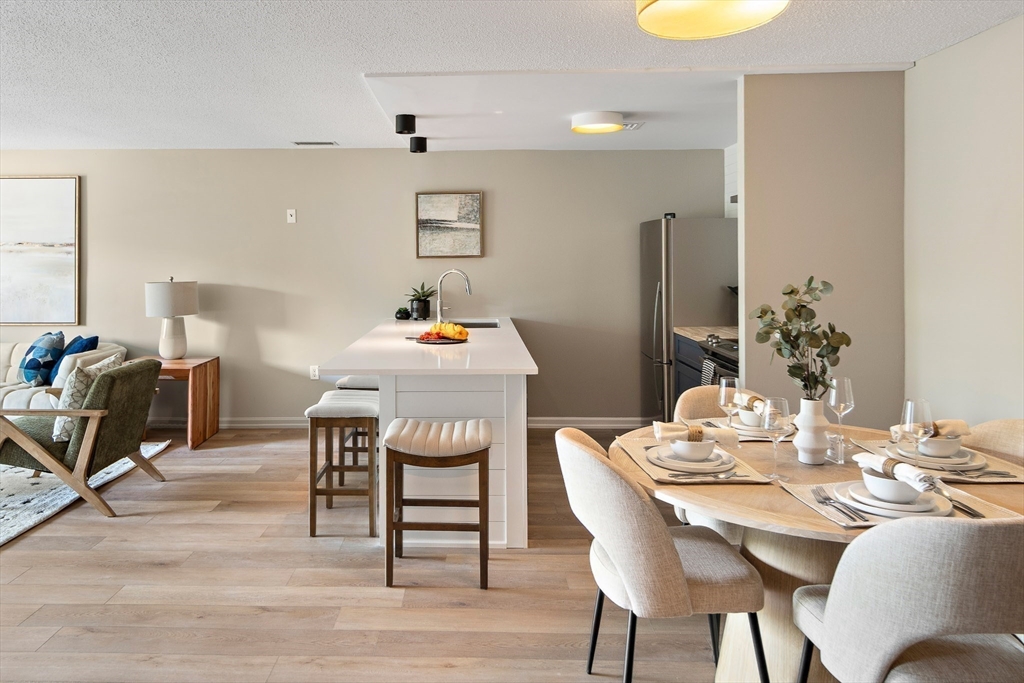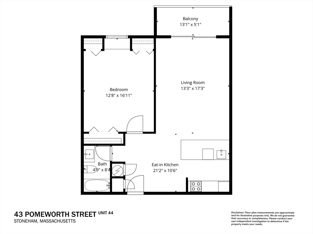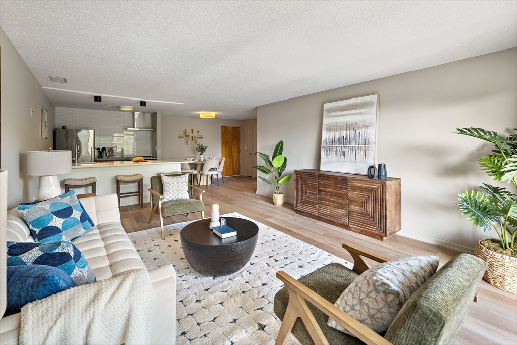 Top-Floor 1 bedroom condominium in elevator building near Stoneham Center. This modern flat features an open floor plan which includes newly a renovated kitchen with an oversized peninsula providing ample workspace and casual dining. The stainless-steel appliances, externally-vented exhaust hood, quartz counters and tile backsplash complete the contemporary look. The oversized bedroom includes three large closets with additional storage under the built-in window seat. The modern bathroom features a wall-hung vanity, soaking tub and Dutch Marmoleum flooring. All-new wide-plank flooring throughout adds additional modern sophistication. A sunny private balcony has completely unobstructed views and overlooks the Tri-Community Greenway walking/biking path and fields. Facing south, the home is drenched in sunlight throughout the day. Additional private storage closet located on the first floor. Short walk to shopping and dining and easy commuting with Interstate 93 and 95 minutes away.