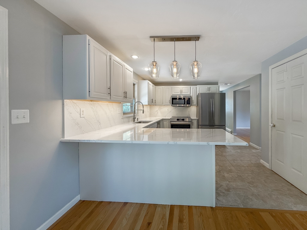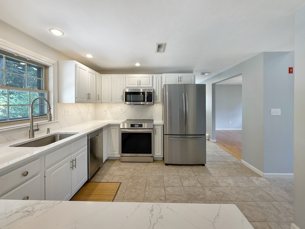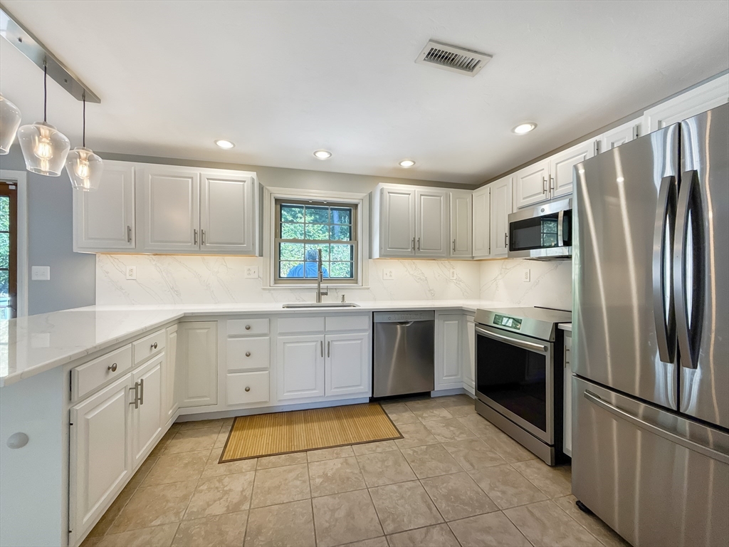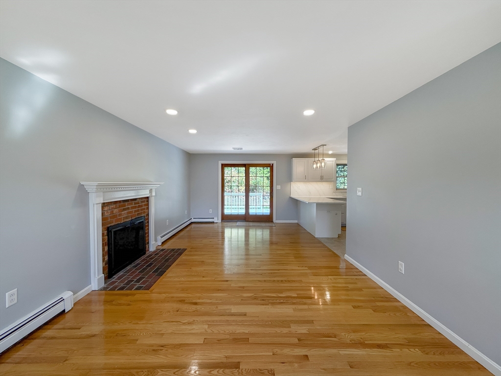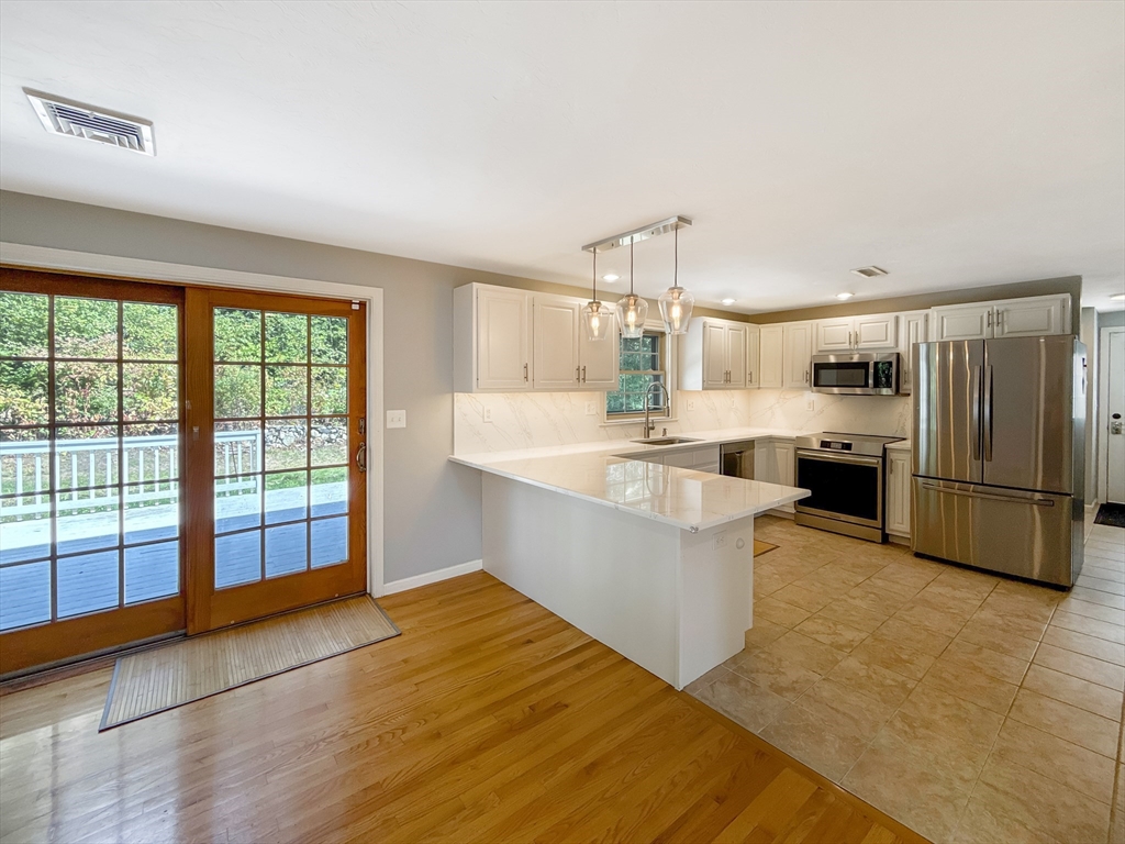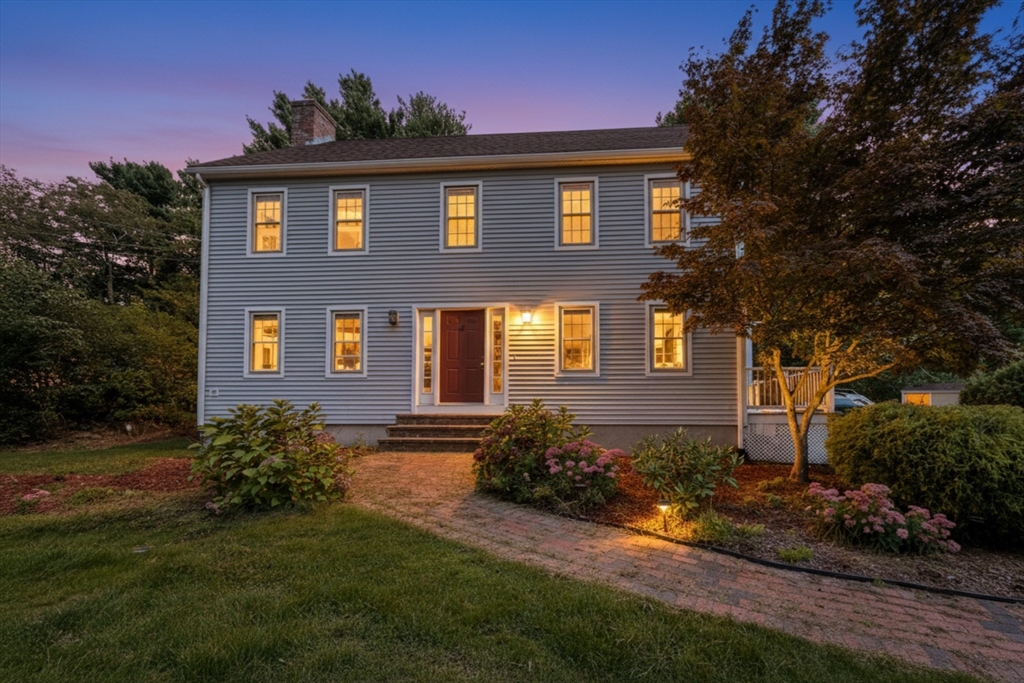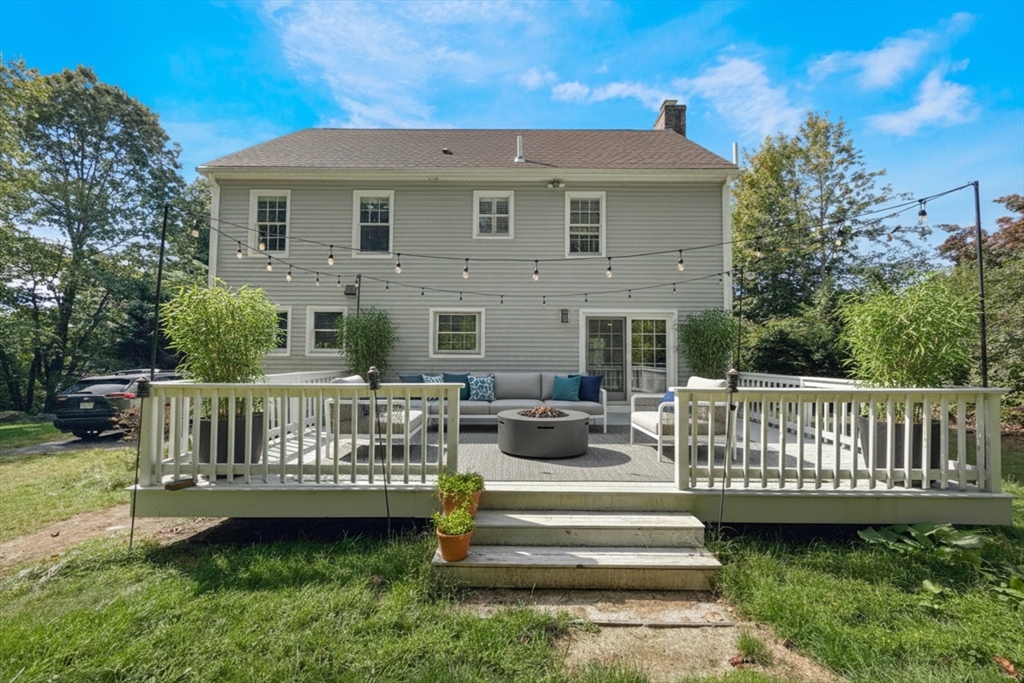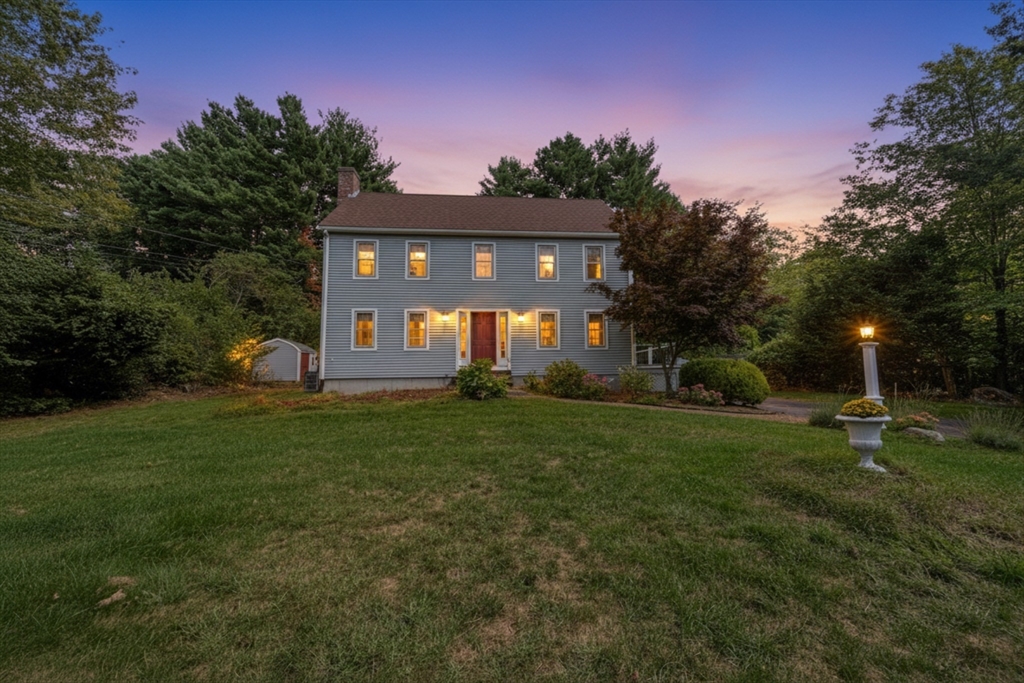 Discover the charm of this 3 bedroom, 1.5 bath Colonial with approx. 1,632 sq. ft. of living area. Open floor plan connects kitchen, dining, and living areas. Kitchen offers updated cabinetry, calacatta-style cathedral quartz countertops with full-height backsplash and integrated peninsula, Moen motion-sensor faucet, new induction stove with built-in air fryer, stainless appliances, and walk-in pantry. French door slider opens to TREX deck. Features CertainTeed siding with gutters, BOSCH 4-ton HVAC with automatic oil backup, hardwood floors, recessed lighting, fireplace, and starburst chandelier over staircase. Walk-out lower level provides storage and expansion potential. Includes generator inlet with transfer switch on panel. Sits well back from road providing privacy, paved drive, and landscaped yard.