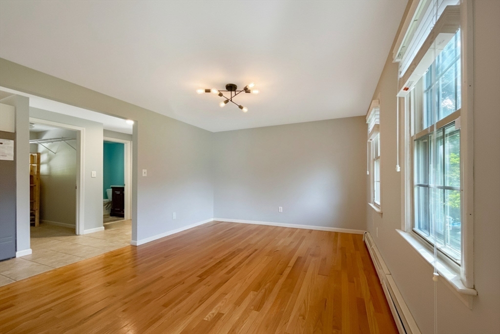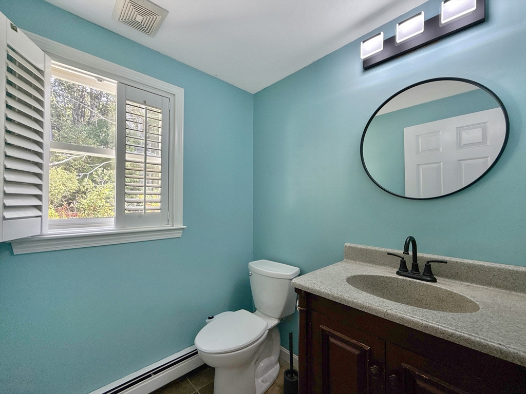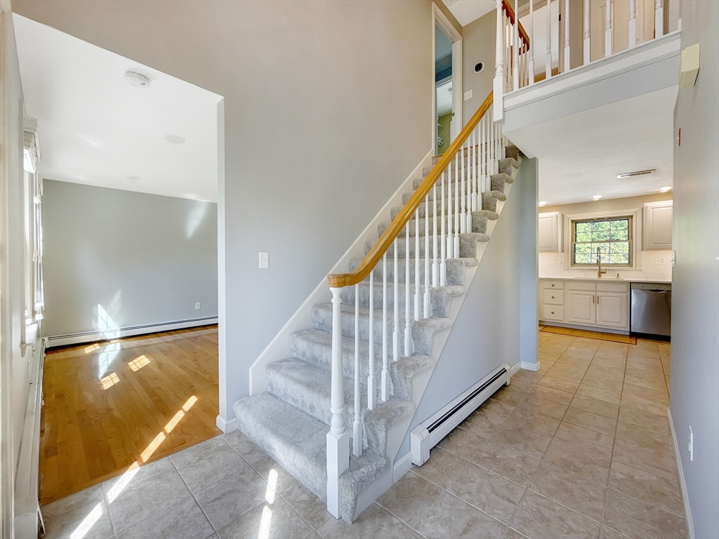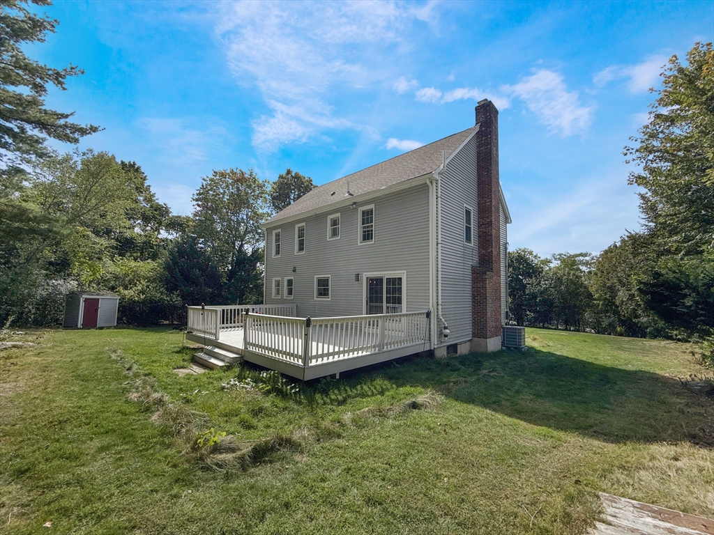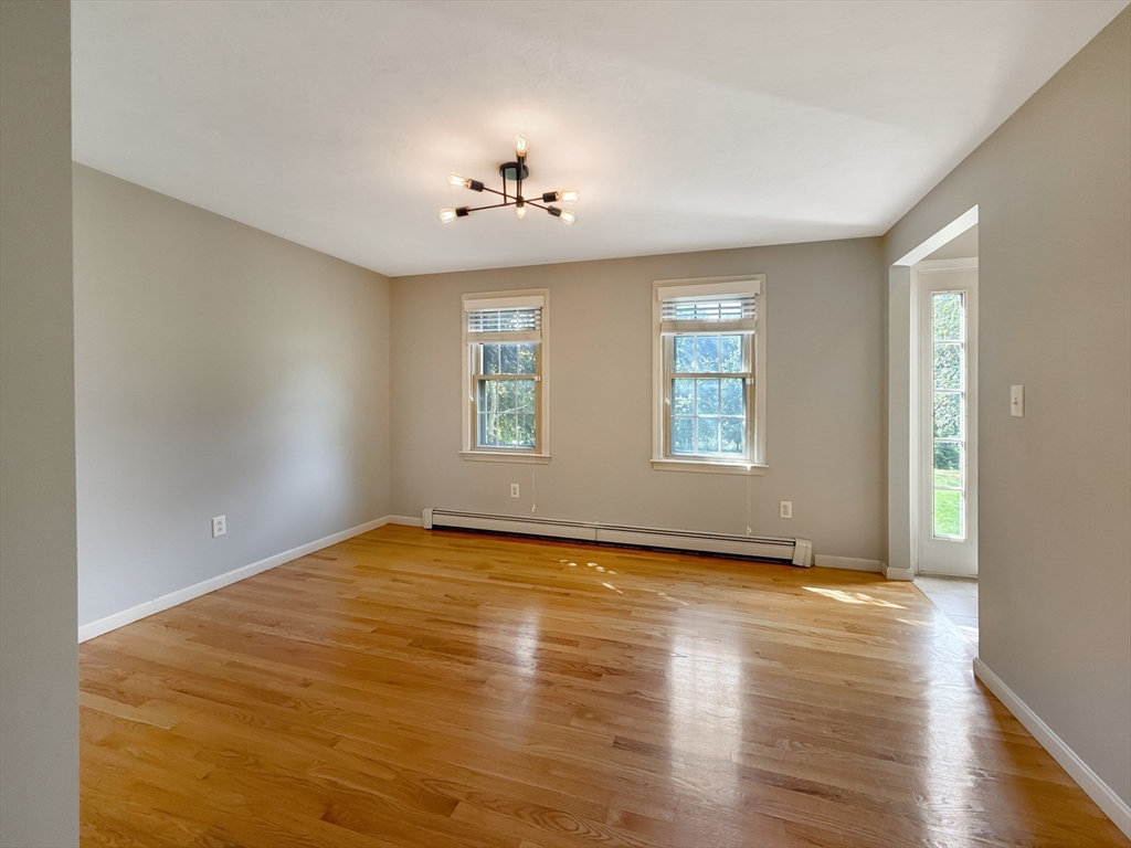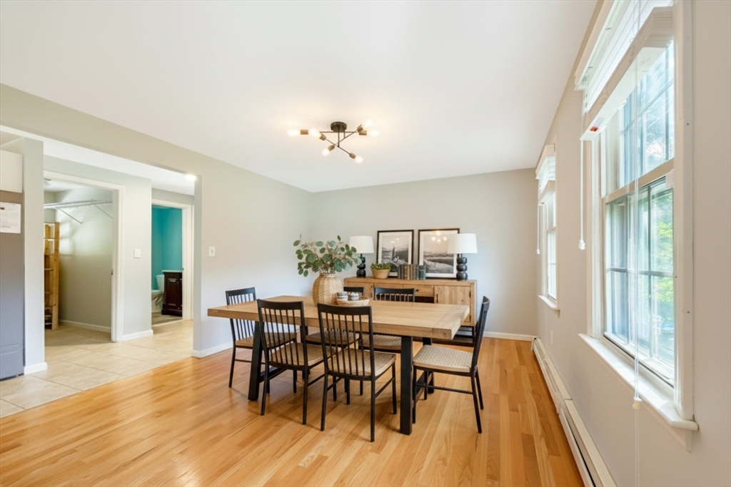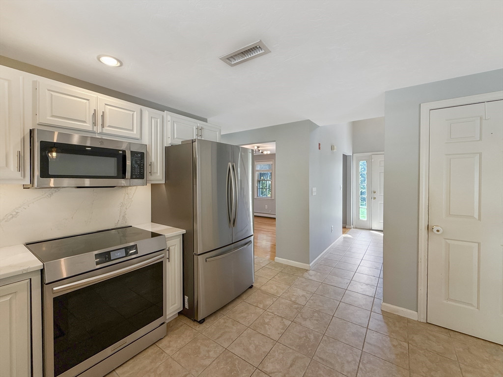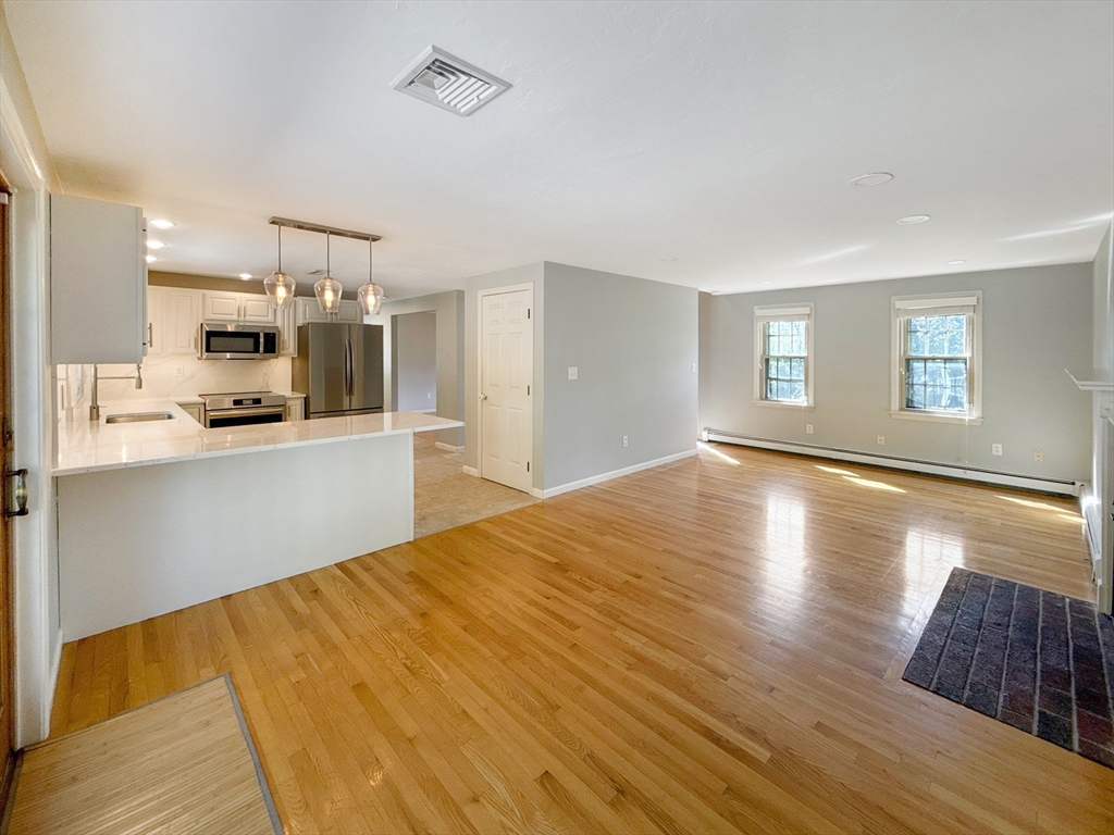 Discover the charm of this 3 bedroom, 1.5 bath Colonial with approx. 1,632 sq. ft. of living area. Open floor plan connects kitchen, dining, and living areas. Kitchen offers updated cabinetry, calacatta-style cathedral quartz countertops with full-height backsplash and integrated peninsula, Moen motion-sensor faucet, new induction stove with built-in air fryer, stainless appliances, and walk-in pantry. French door slider opens to TREX deck. Features CertainTeed siding with gutters, BOSCH 4-ton HVAC with automatic oil backup, hardwood floors, recessed lighting, fireplace, and starburst chandelier over staircase. Walk-out lower level provides storage and expansion potential. Includes generator inlet with transfer switch on panel. Sits well back from road providing privacy, paved drive, and landscaped yard.