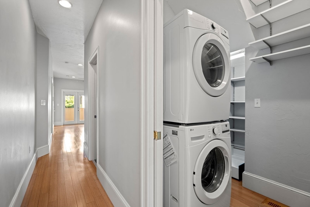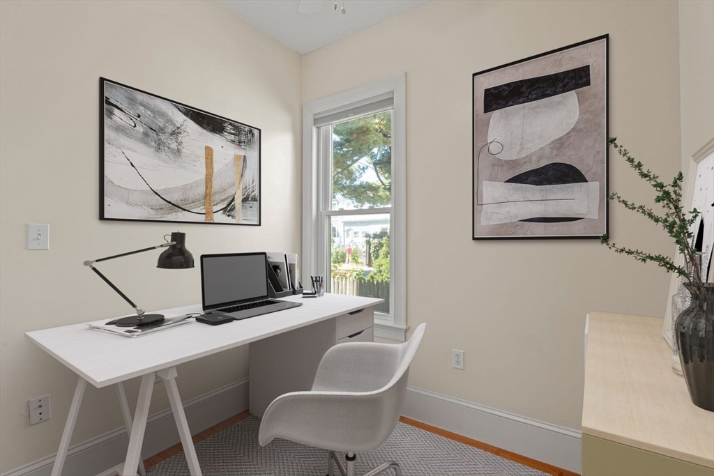 Spacious two bedroom - two bathroom with garage parking & a private entrance on a quiet residential street. Sunny eat in kitchen with lots of storage, primary bedroom with ensuite bathroom, second bedroom or office and a generously sized living room. Other details include in-unit laundry, hardwood floors, central AC & a large private porch off the kitchen. A heated driveway leading to the oversized deeded garage space, an extra large storage room in the basement and a shared yard with raised garden beds complete this pet-friendly, 8-unit, self managed association. Walking distance to restaurants, a city park & public transportation with easy access to MIT, Central, Kendall & Inman Square's.