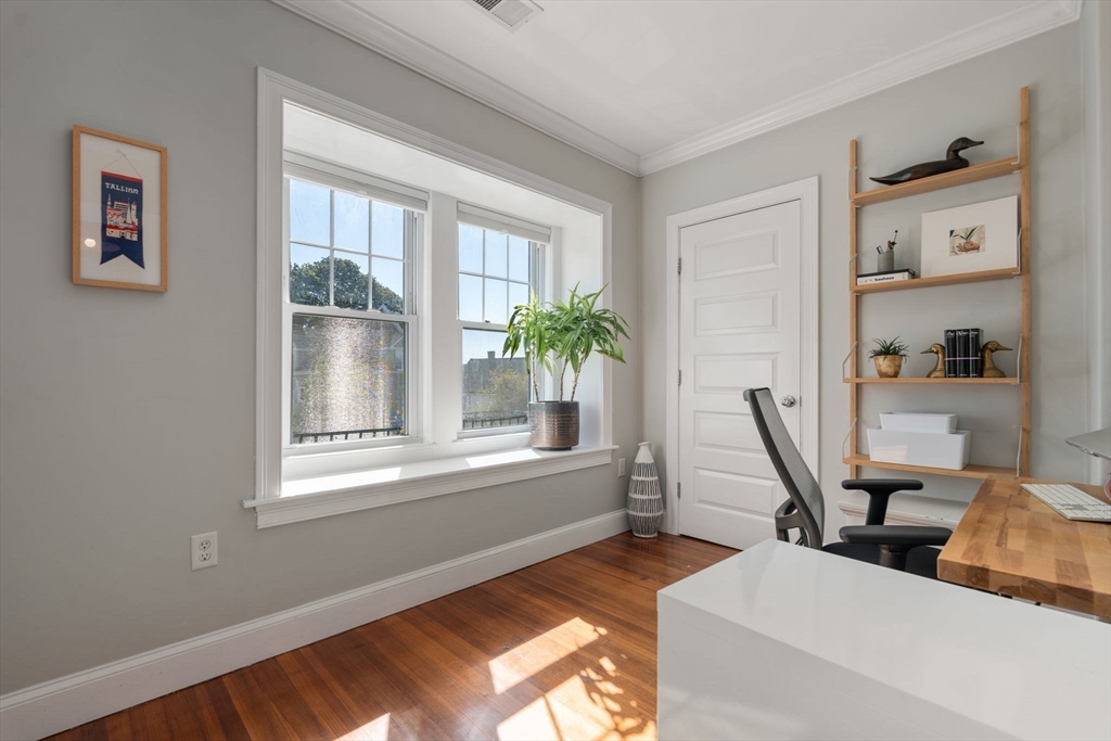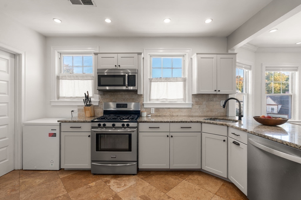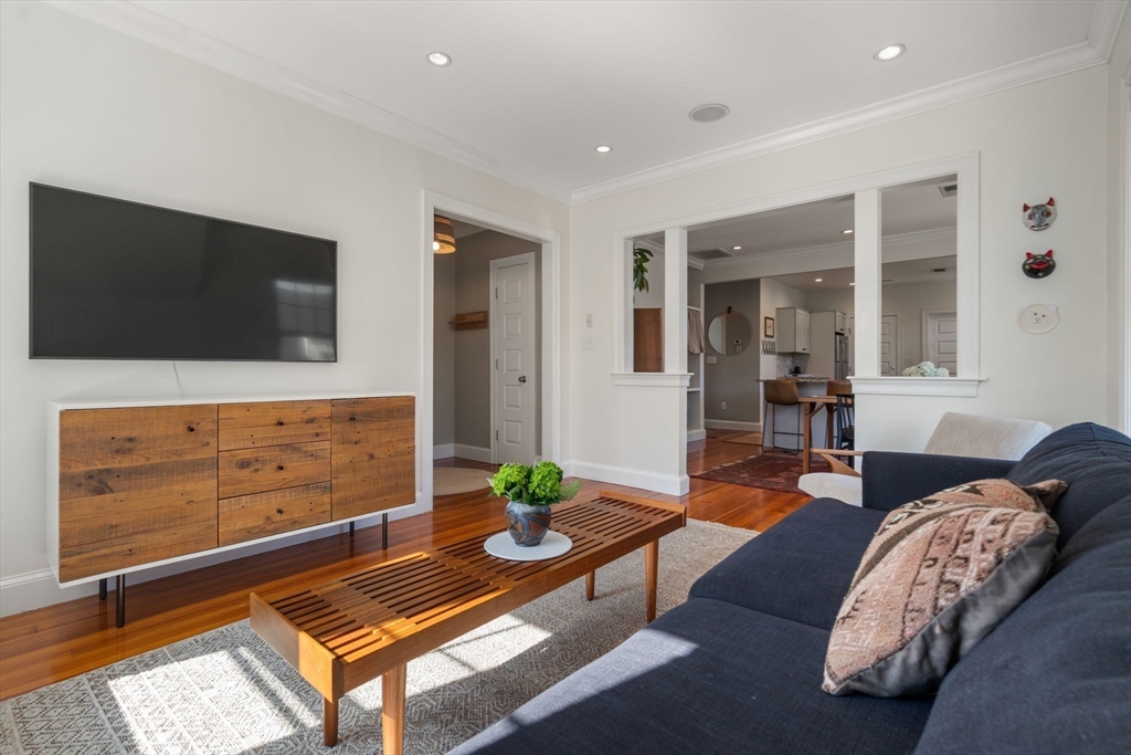Tucked in the heart of Roslindale Village, this top-floor 3-bedroom condo perfectly balances everyday ease with neighborhood charm. Wake up to sunlight streaming through the open-concept living space, sip morning coffee on your private deck, and enjoy easy access to local cafés, shops, restaurants and the commuter rail. The inviting layout connects a stylish kitchen, dedicated dining area, and airy living room - ideal for hosting friends or relaxing at home. Built-in bluetooth speakers set the scene for any occasion while central air, in-unit laundry, off-street parking, an abundance of storage in the unfinished attic, as well as extra storage in the basement make daily life effortless. With thoughtful details and a vibrant location, this home delivers the best of city living with a warm, neighborhood feel. Available for January 15th move in. Reach out today for a tour!