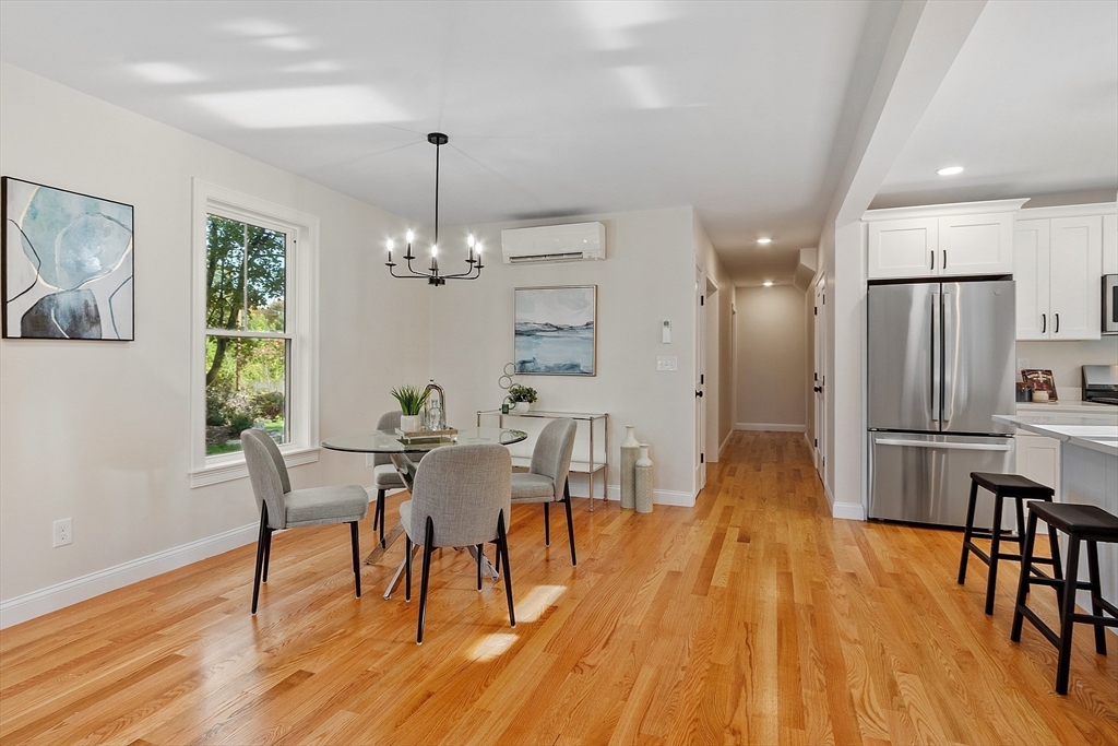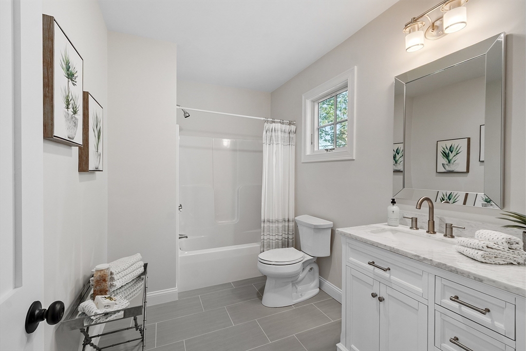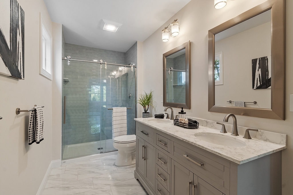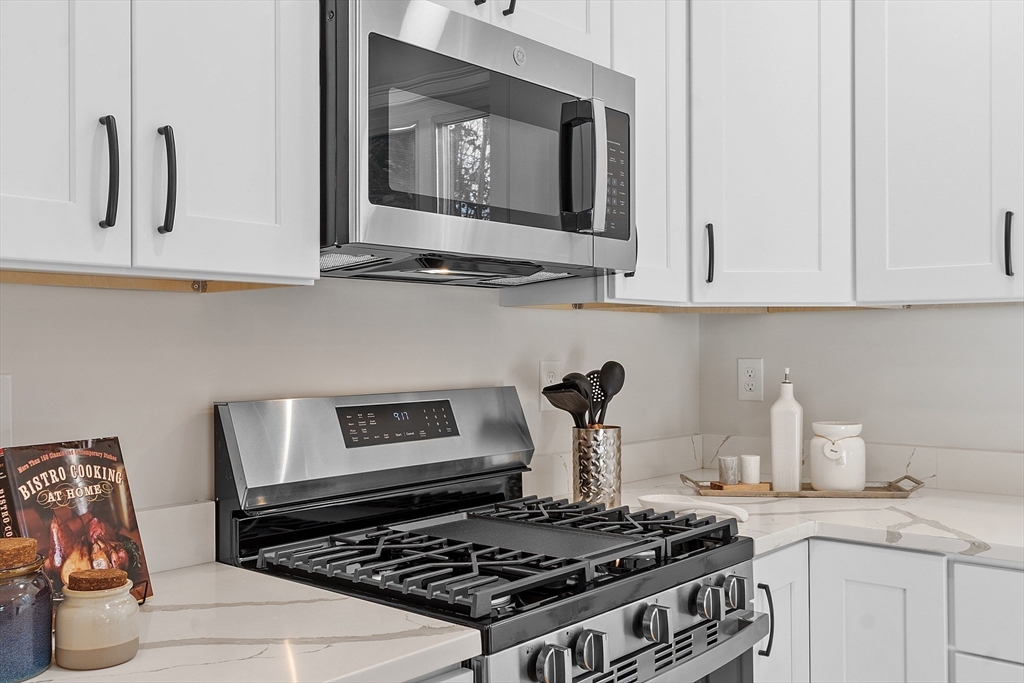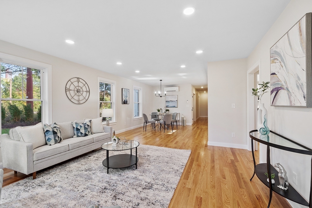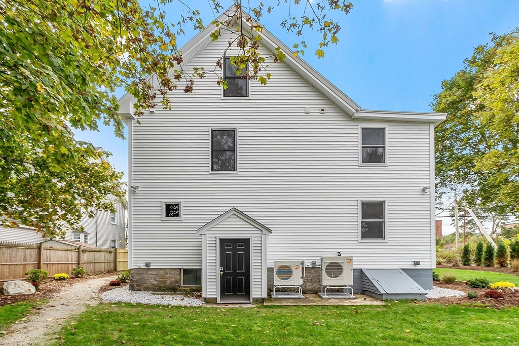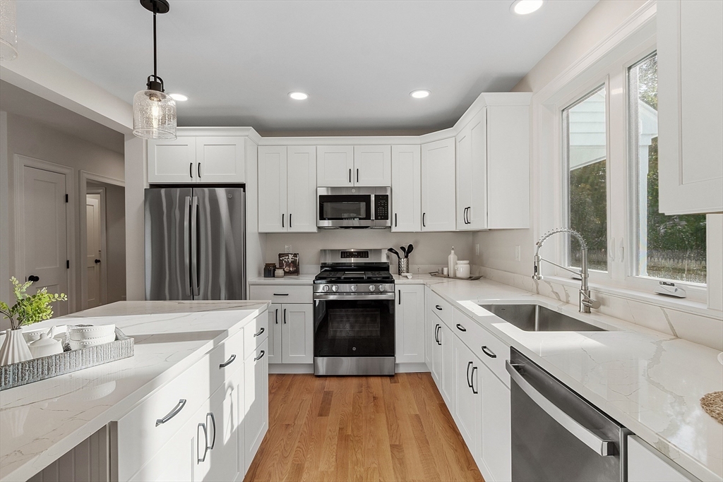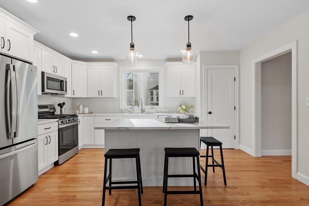 A fully reimagined two-family home transformed into two distinct condominium residences, each with its own private entrance, separate living spaces, and modern design. Occupying the first and second floors, this 3-bed, 2.5-bath home offers 1,760 sq. ft. of open-concept living. Sunlight fills the living and dining areas that flow into a designer kitchen with white shaker cabinetry, quartz counters, and GE stainless appliances. The first-floor primary suite features two his and hers closets and spa-inspired bath with tiled shower, glass shower door and double vanity. A stylish half bath and laundry add convenience. Upstairs, two bedrooms share a full bath. Rebuilt from the studs with new roof, siding, windows, plumbing, electrical, and Mitsubishi mini-splits. Full basement, private landscaped entry, shared 2-car garage, and two parking spaces complete this modern, comfortable North Chelmsford home.