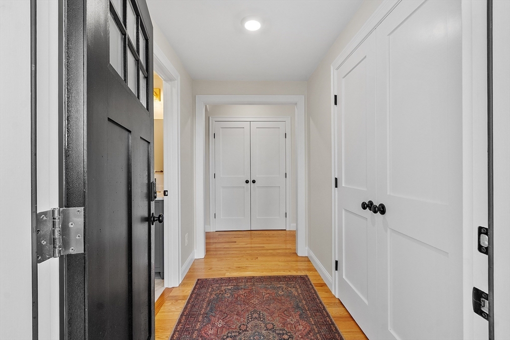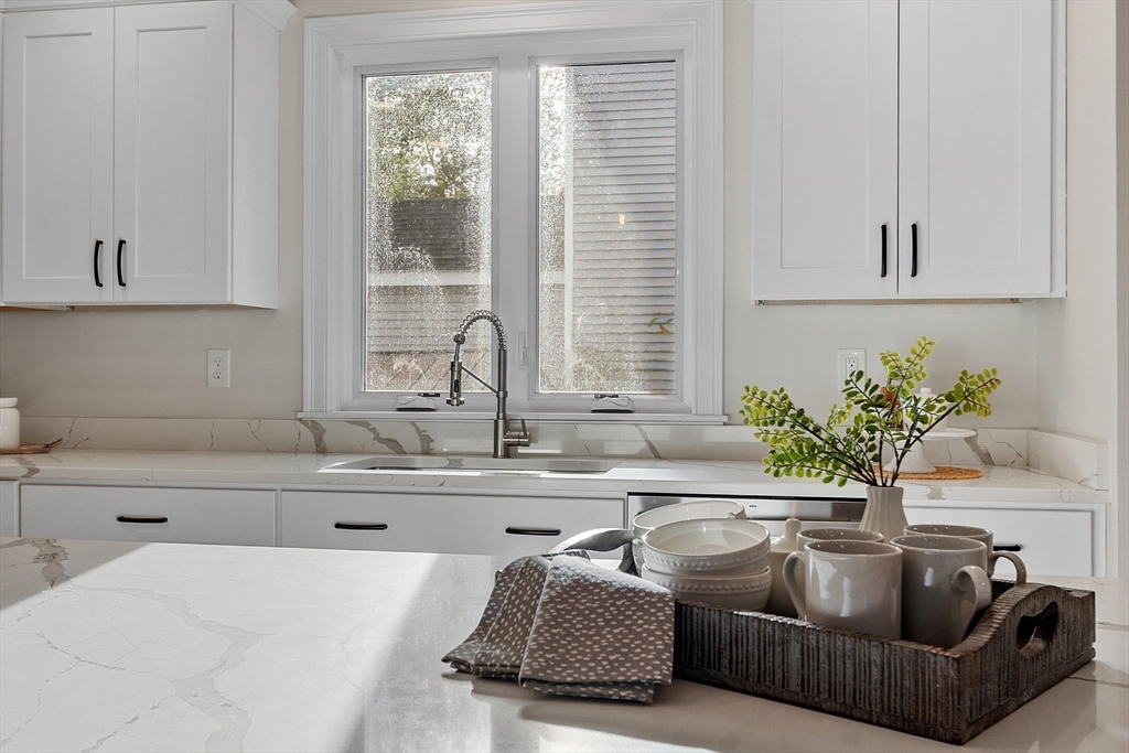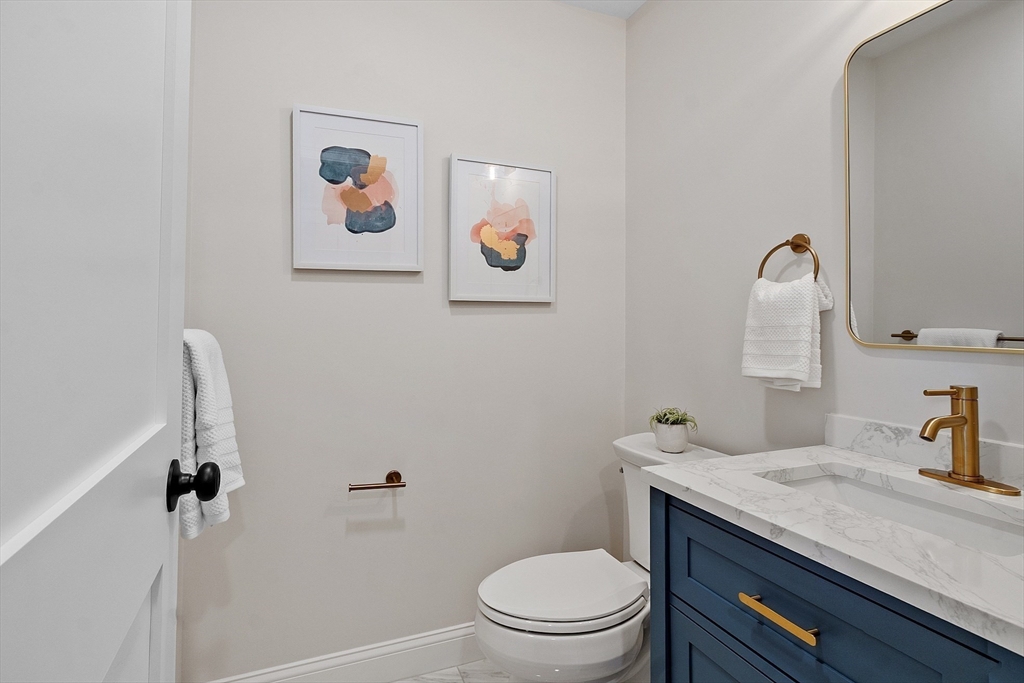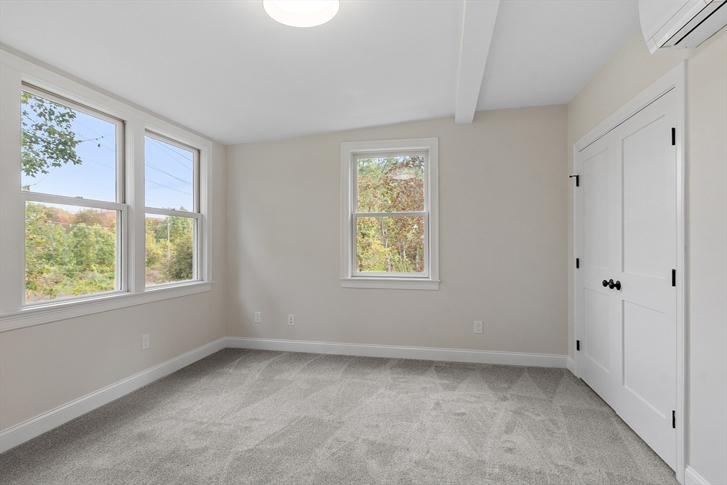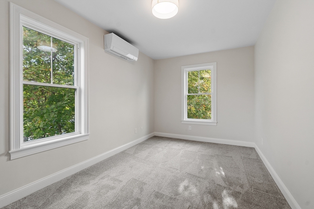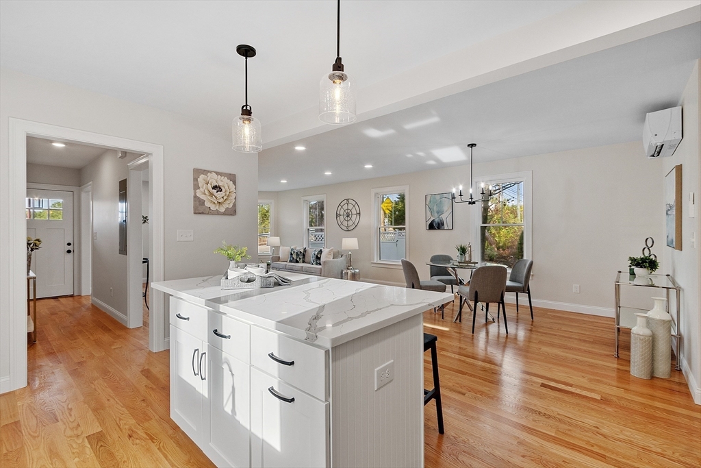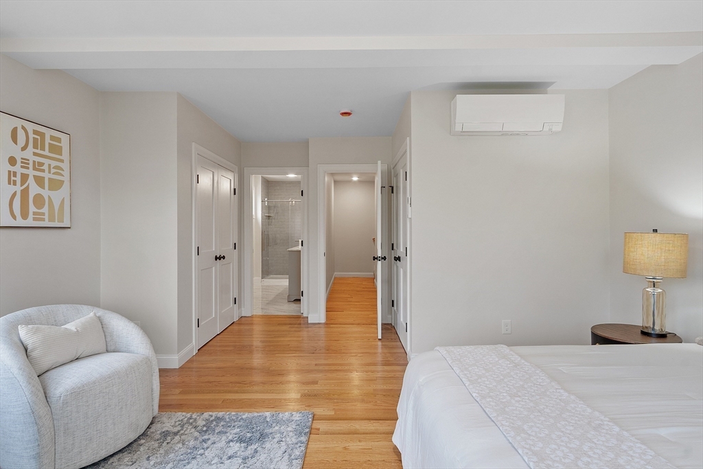 A fully reimagined two-family home transformed into two distinct condominium residences, each with its own private entrance, separate living spaces, and modern design. Occupying the first and second floors, this 3-bed, 2.5-bath home offers 1,760 sq. ft. of open-concept living. Sunlight fills the living and dining areas that flow into a designer kitchen with white shaker cabinetry, quartz counters, and GE stainless appliances. The first-floor primary suite features two his and hers closets and spa-inspired bath with tiled shower, glass shower door and double vanity. A stylish half bath and laundry add convenience. Upstairs, two bedrooms share a full bath. Rebuilt from the studs with new roof, siding, windows, plumbing, electrical, and Mitsubishi mini-splits. Full basement, private landscaped entry, shared 2-car garage, and two parking spaces complete this modern, comfortable North Chelmsford home.