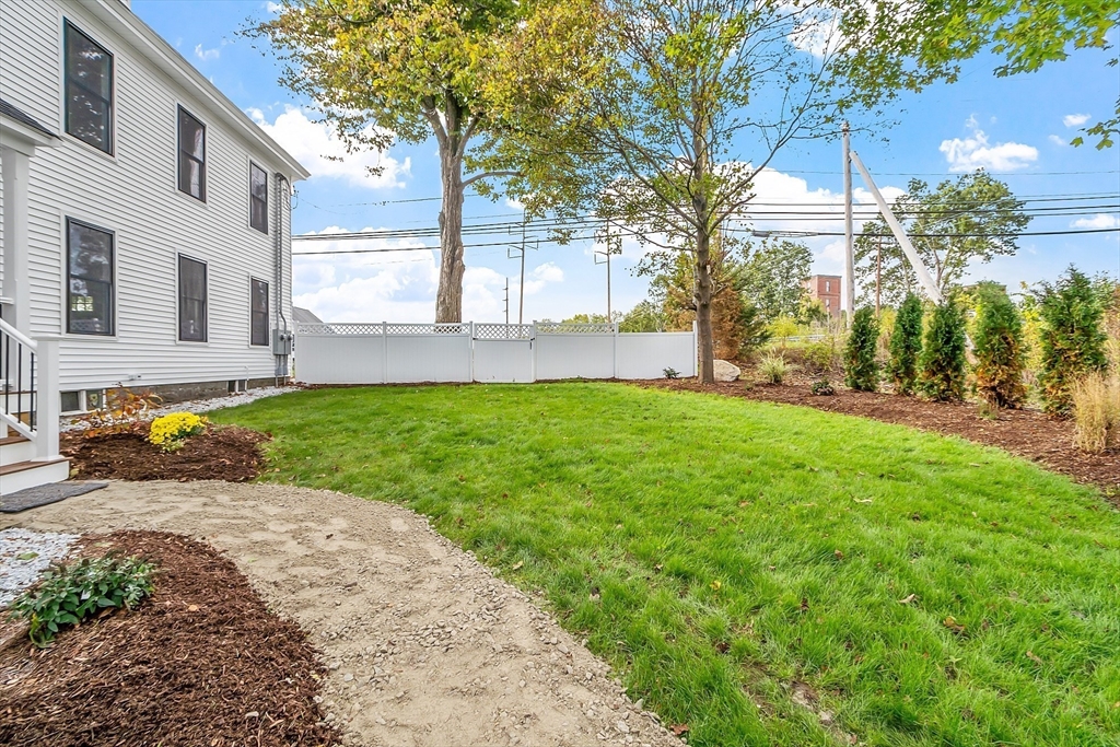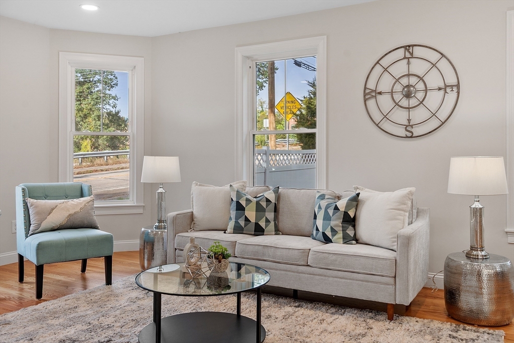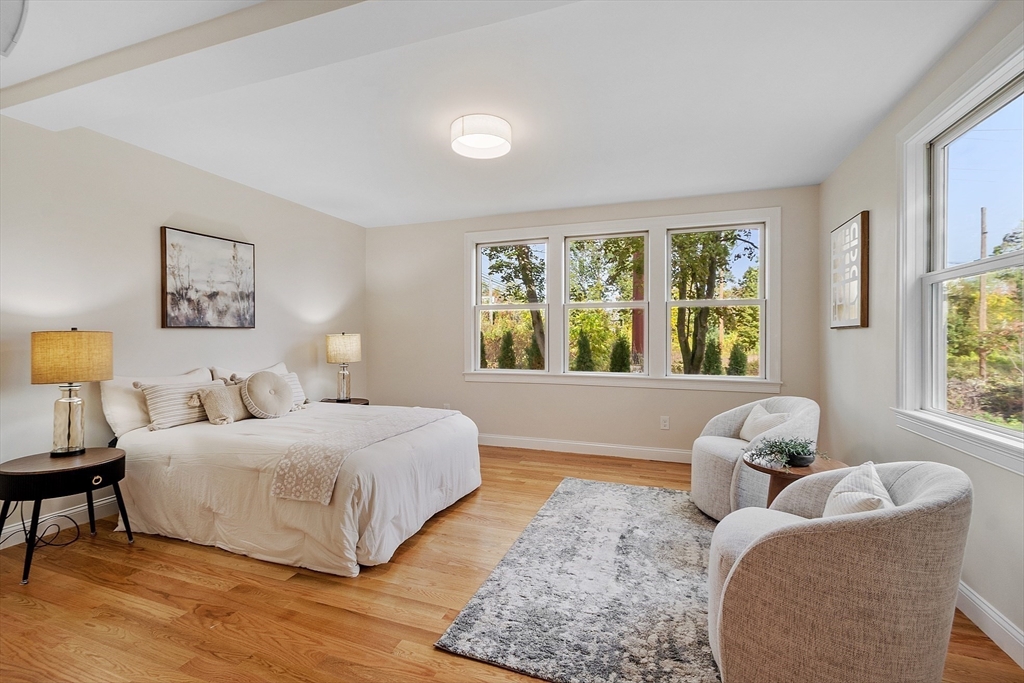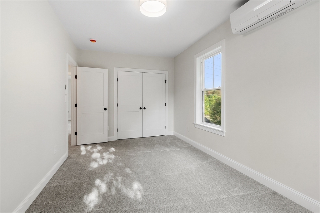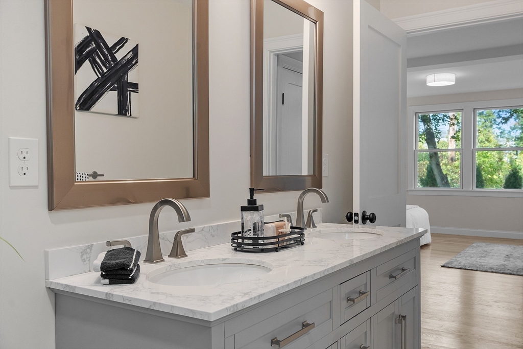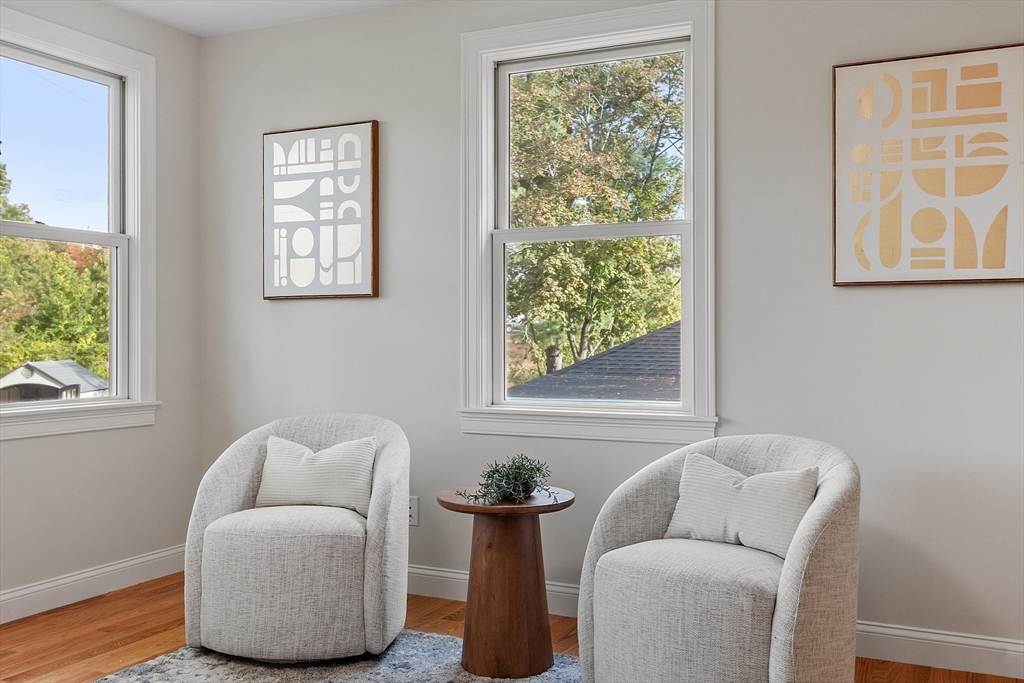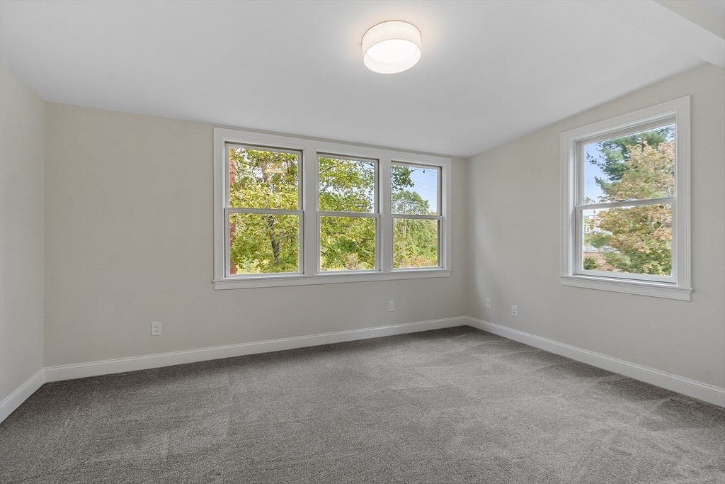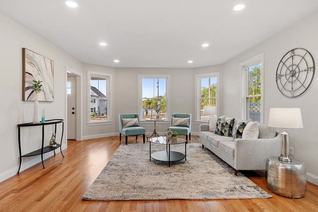 A fully reimagined two-family home transformed into two distinct condominium residences, each with its own private entrance, separate living spaces, and modern design. Occupying the first and second floors, this 3-bed, 2.5-bath home offers 1,760 sq. ft. of open-concept living. Sunlight fills the living and dining areas that flow into a designer kitchen with white shaker cabinetry, quartz counters, and GE stainless appliances. The first-floor primary suite features two his and hers closets and spa-inspired bath with tiled shower, glass shower door and double vanity. A stylish half bath and laundry add convenience. Upstairs, two bedrooms share a full bath. Rebuilt from the studs with new roof, siding, windows, plumbing, electrical, and Mitsubishi mini-splits. Full basement, private landscaped entry, shared 2-car garage, and two parking spaces complete this modern, comfortable North Chelmsford home.