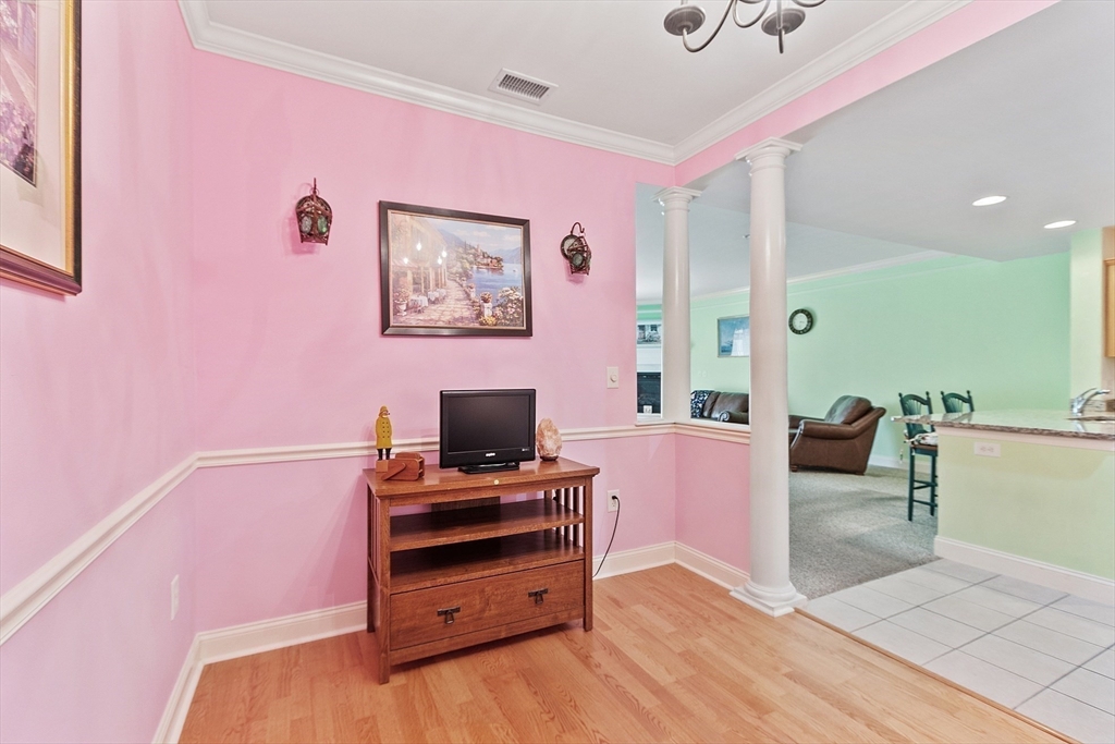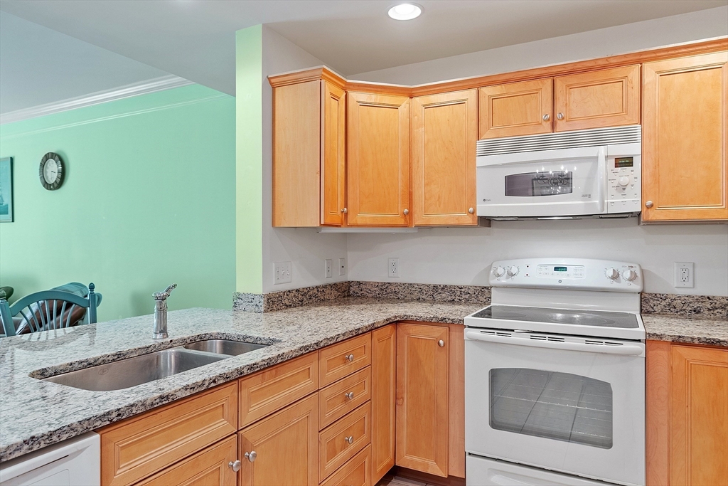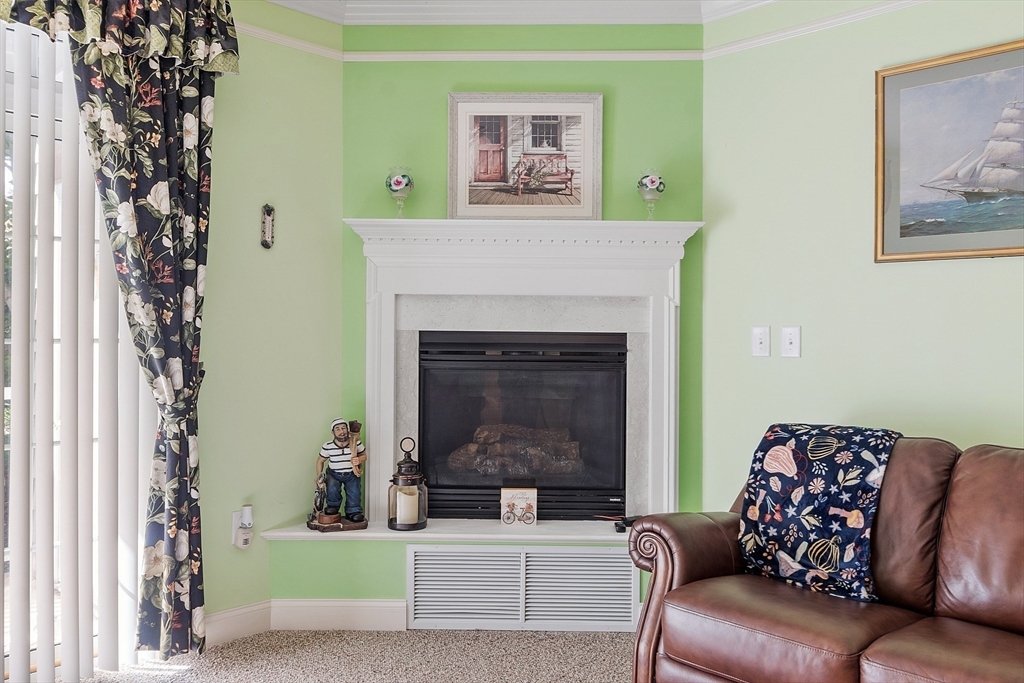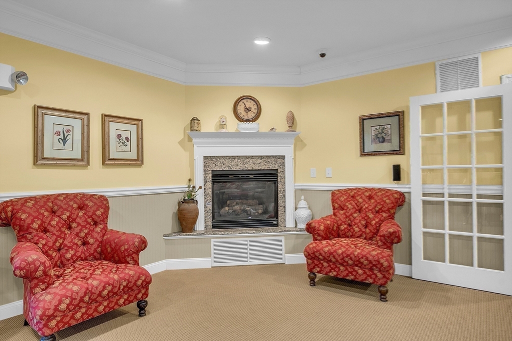 Welcome to Emerald Court, a highly sought after 55+ community offering comfort, convenience and carefree living. This desirable first floor unit is ideally located near the clubhouse and just steps from the elevator leading to the heated garage. Inside, you'll find a spacious open-concept layout featuring a gas fireplace in the living room, a slider to your private balcony, crown moldings, and a flexible dining room or den area. The granite kitchen includes a breakfast bar - perfect for casual dining or entertaining. The large bedroom offers a walk in closet, full bath w-walk in shower and convenient in unit laundry. Additional highlights include elevator access and a dedicated owners storage area on the same level as the unit. Emerald Court residents enjoy a beautiful landscaped setting with plenty of guest parking and wonderful amenities such as community room with library, fitness center, conference room and kitchen. Come see why so many people are proud to call Emerald Court home!