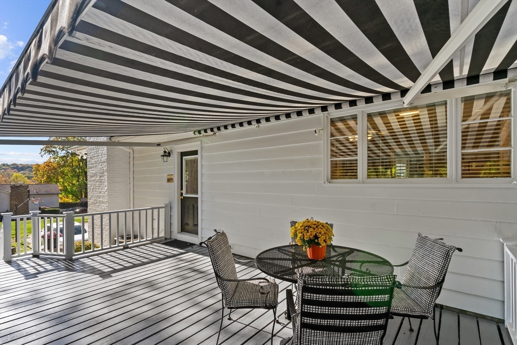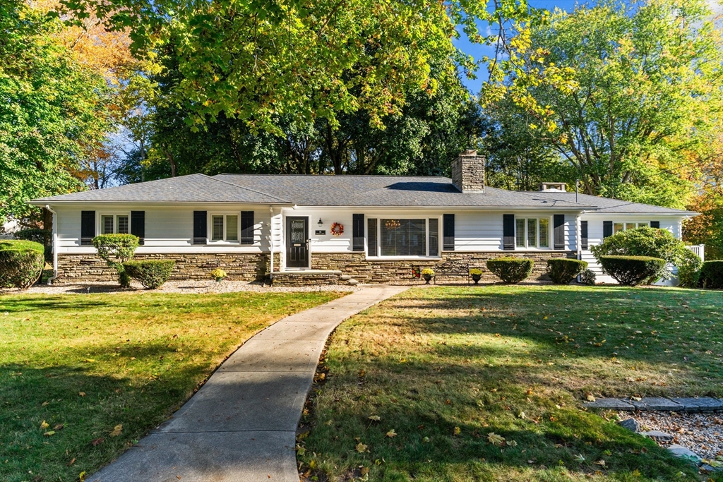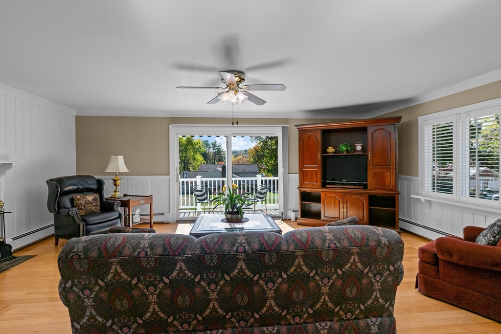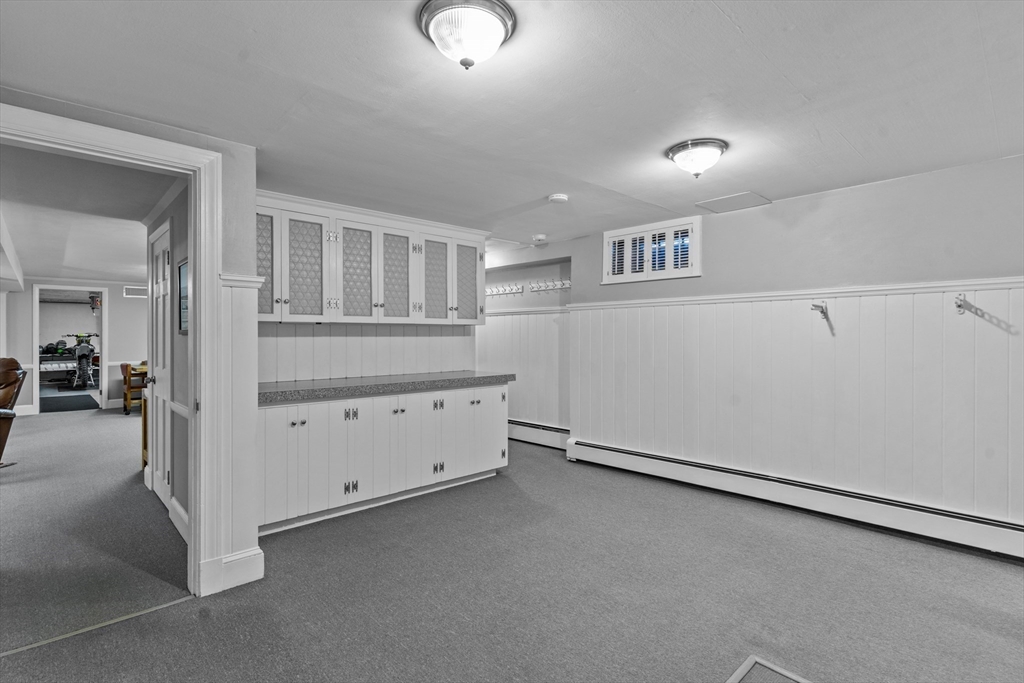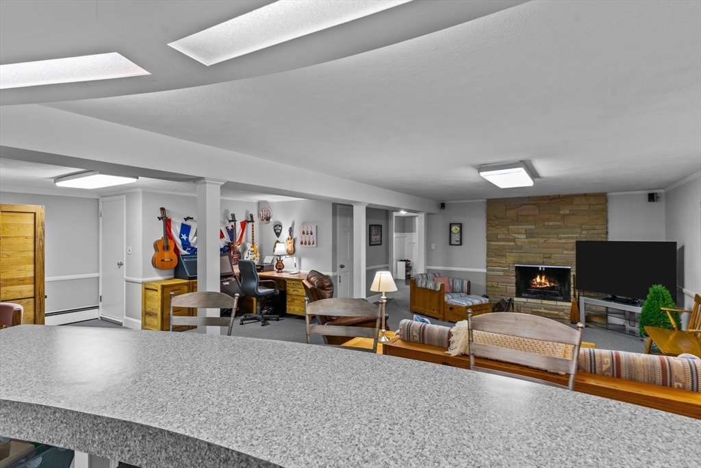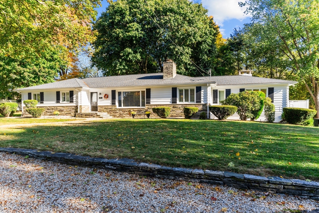 North Smithfield. One level Ranch near MA line.Quality craftsmanship is evident throughout and noted in the compound moldings and woodwork. Everything has been updated by the current owners. The roof, windows, flooring, heating system, water heater, oil tank have all been updated/replaced and bathrooms were remodeled. The home is spacious and elegant with 8' high ceilings, 3 fireplaces, 3-4 bedrooms, and 3 1/2 bathrooms. For growing families there is space for everyone on main level and in partially finished basement. The basement has a 1/2 bath, living area, and wet bar, laundry room, and access to 2-car heated garage and 1000 SF of unfinished area. The main level features a beautiful room with fireplace, built-in shelves, private balcony, and full bath for use as a guest suite, in-law living area or library. The kitchen is spacious with lots of storage & work area. Off the kitchen is rear deck and steps to flat yard for pool and more. Connected to water. Gas available in street.