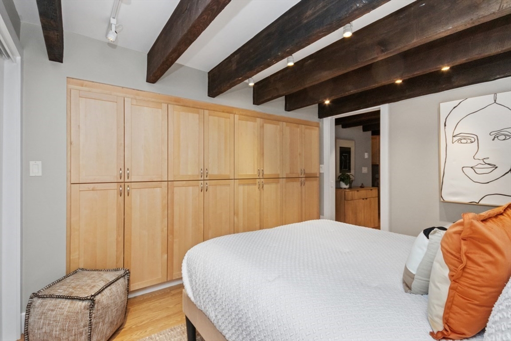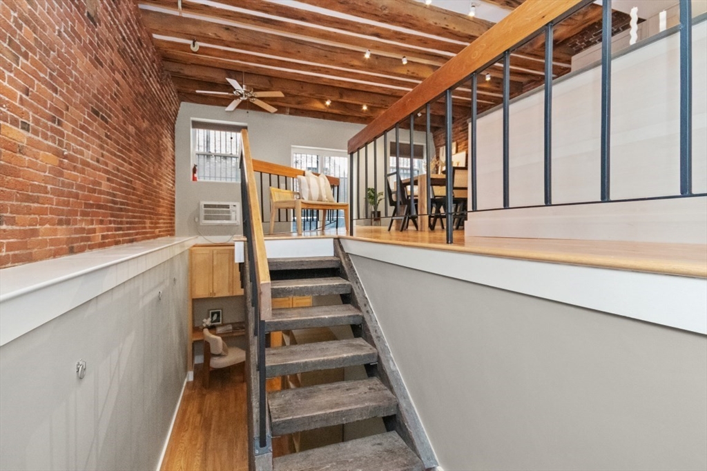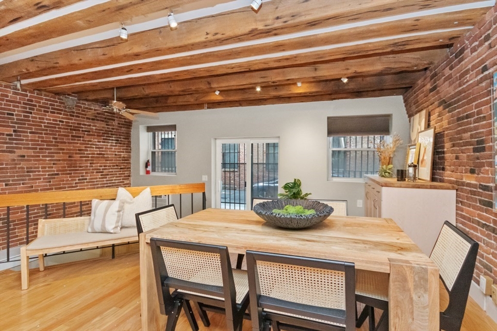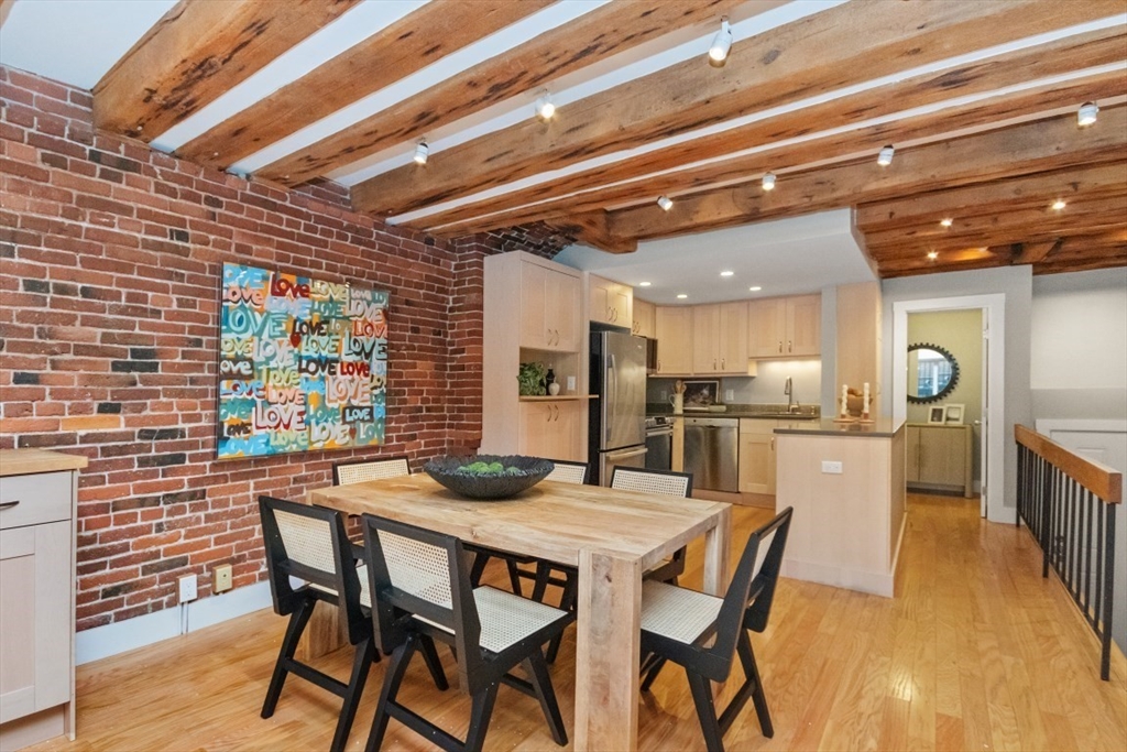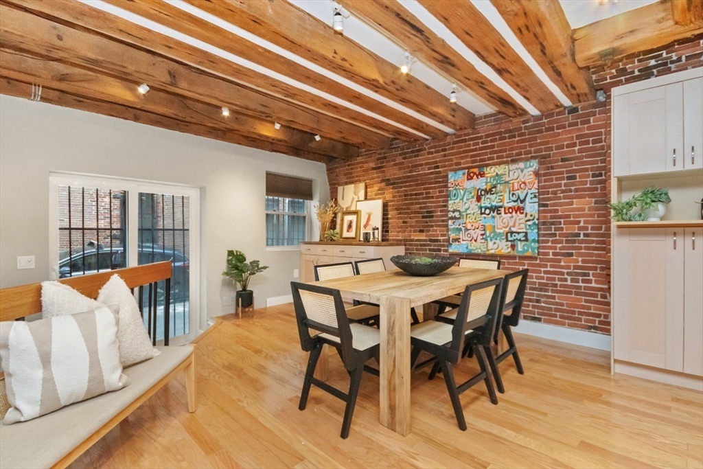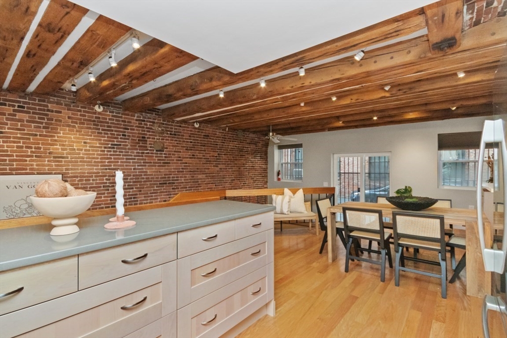 Beautiful Boston Waterfront duplex condo featuring exposed brick and beams. This loft like home is one of the largest 1 bedrooms on the market in the North End at 908 square feet and is ideal with main level offering open/updated kitchen and dining areas with hardwood floors and brick accent walls. Kitchen features newer appliances, induction stove and Silestone countertops. Direct access through sliders to beautiful North End Alley. Full bath completes the top floor. Downstairs you'll find another living space with a built-in work from home space and large bedroom with loads of closets/built ins for storage. Boutique building, self-managed, owner occupied, and pet friendly and convenient in-building laundry. On The Waterfront in The North End minutes from Faneuil Hall and surrounded by the Seaport District, Greenway, North/South Station, downtown Boston, and all major transportation points. Taxes do not reflect residential exemption ($3984.21)