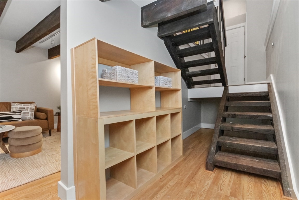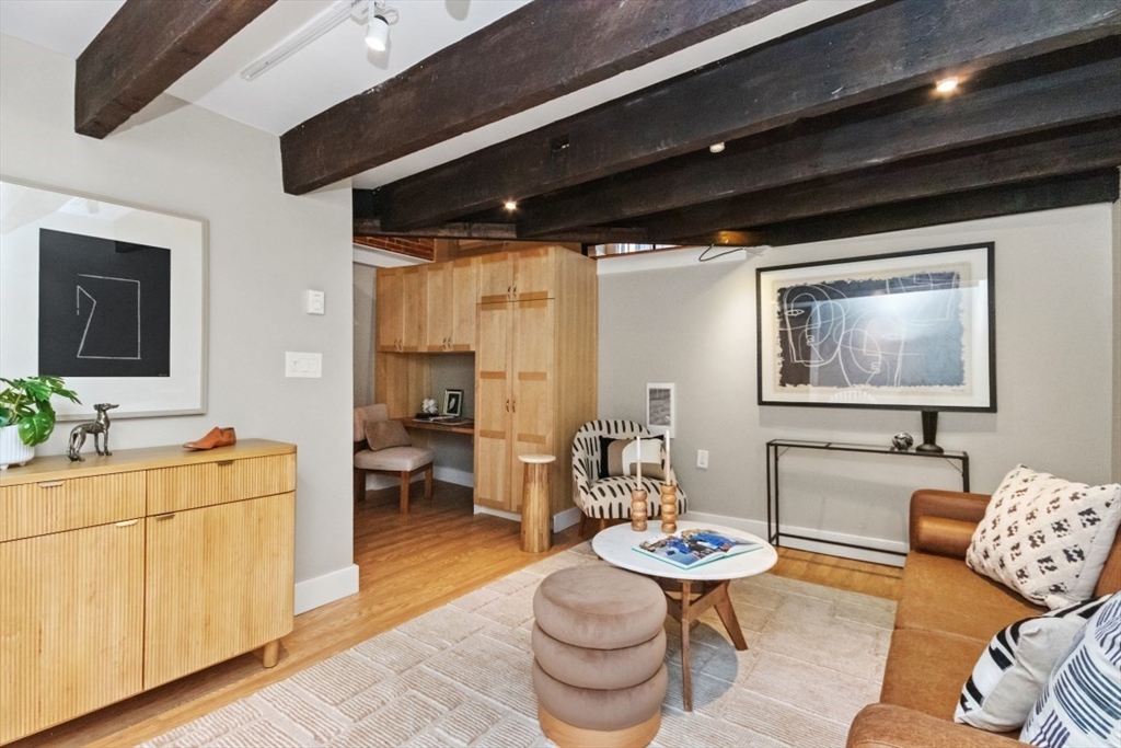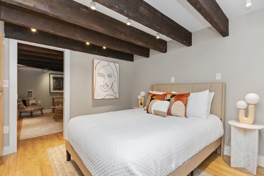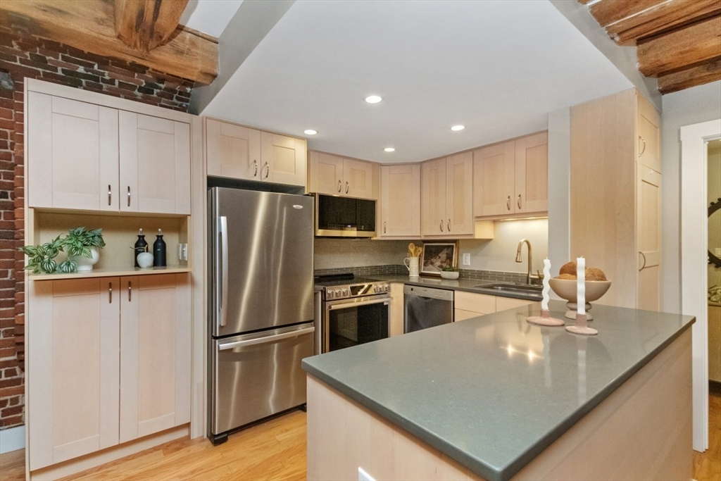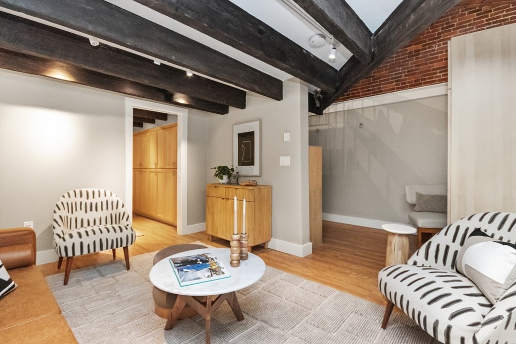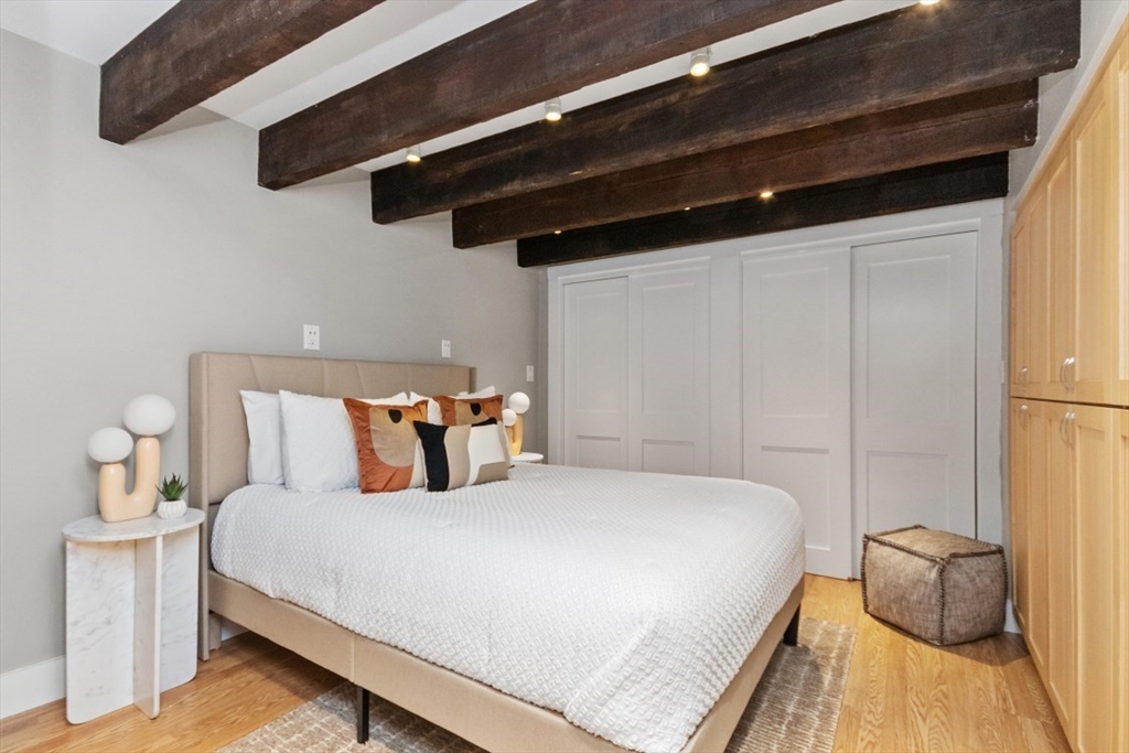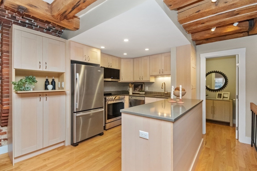 Beautiful Boston Waterfront duplex condo featuring exposed brick and beams. This loft like home is one of the largest 1 bedrooms on the market in the North End at 908 square feet and is ideal with main level offering open/updated kitchen and dining areas with hardwood floors and brick accent walls. Kitchen features newer appliances, induction stove and Silestone countertops. Direct access through sliders to beautiful North End Alley. Full bath completes the top floor. Downstairs you'll find another living space with a built-in work from home space and large bedroom with loads of closets/built ins for storage. Boutique building, self-managed, owner occupied, and pet friendly and convenient in-building laundry. On The Waterfront in The North End minutes from Faneuil Hall and surrounded by the Seaport District, Greenway, North/South Station, downtown Boston, and all major transportation points. Taxes do not reflect residential exemption ($3984.21)