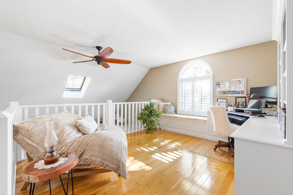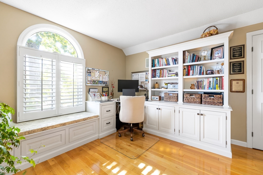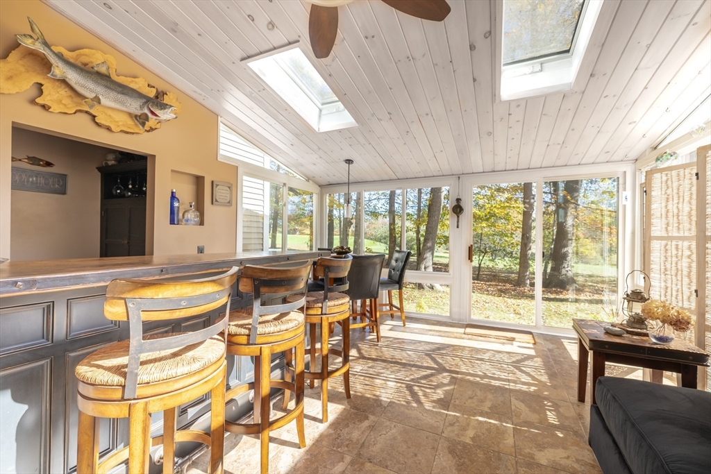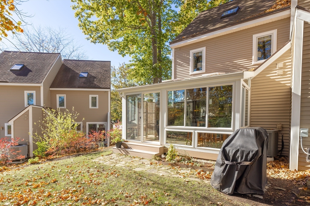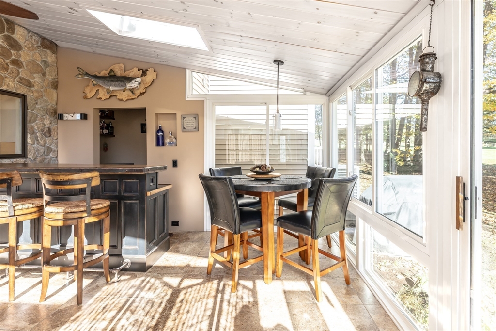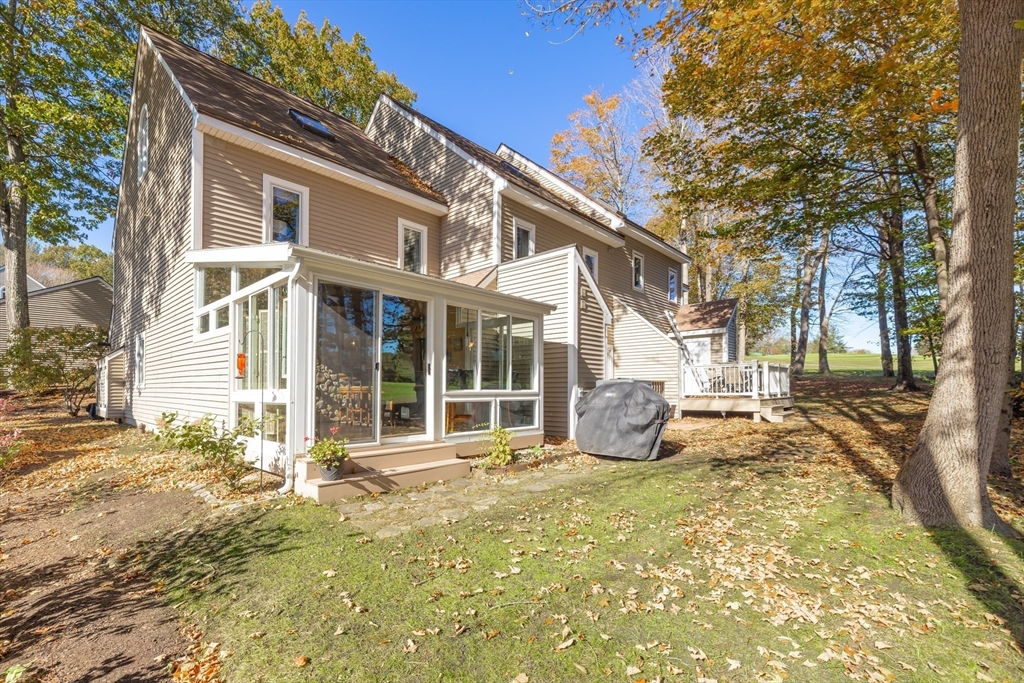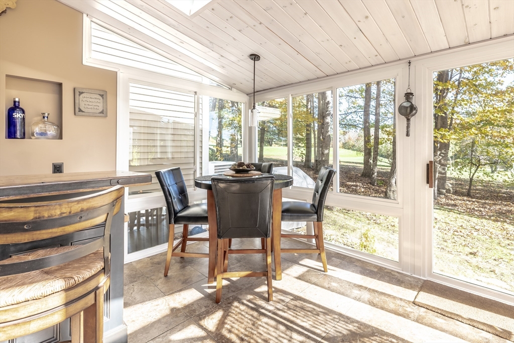 Welcome to your dream home at Fairview Woods on Pine Ridge Golf Course! This inviting end unit is brimming with quality upgrades throughout. Step inside to a bright and airy layout featuring a custom kitchen equipped with exquisite quartzite counters and top-of-the-line Bosch stainless steel appliances. Unwind in the expansive main family room with pellet stove that efficiently warms the entire unit. The highlight of this home is the 3-season sunroom with radiant heated floor, wet bar, and a stunning natural stone accent wall, overlooking the lush grounds on the 4th hole. Hardwood floors flow seamlessly throughout the entire home. The 2nd floor has two generous size bedrooms, along with a full bath and laundry. The 3rd floor loft area doubles as an office with custom-built bookcases, cabinetry, desk, and window seat, offering a quiet retreat. Less than 10 minutes to shopping, restaurants, MA Pike, Rt 290, & 395. Experience refined living with the perfect blend of style and convenience!