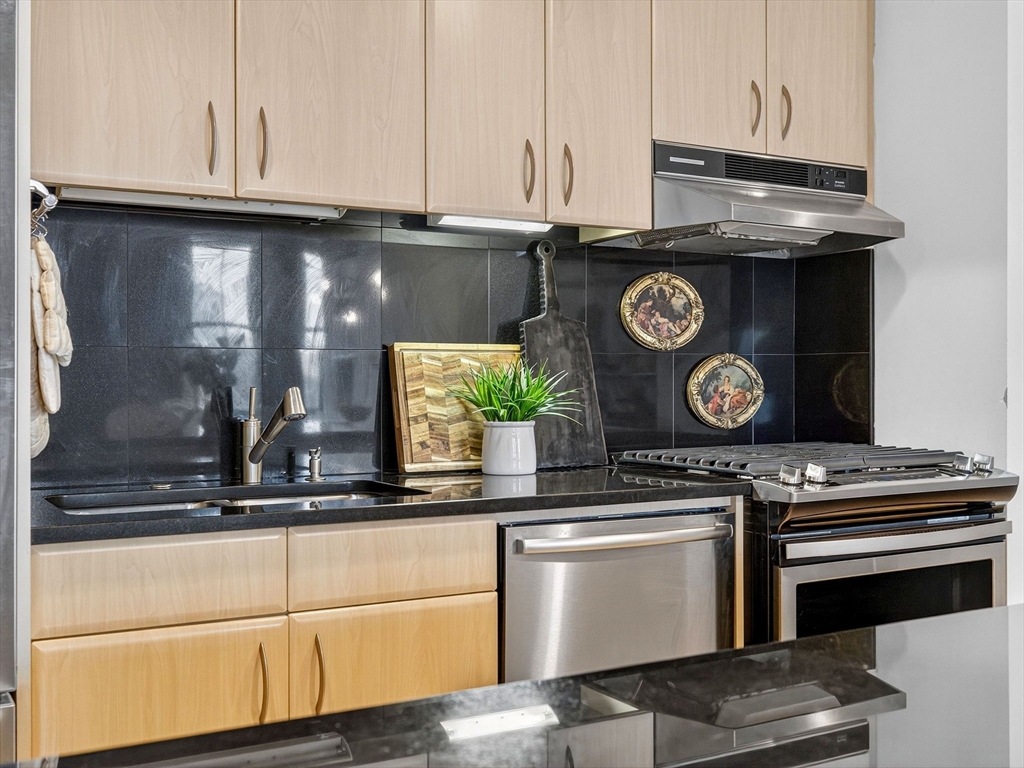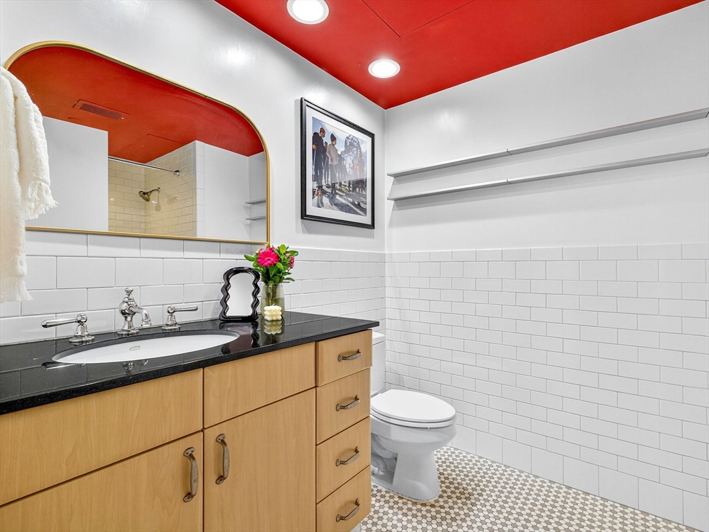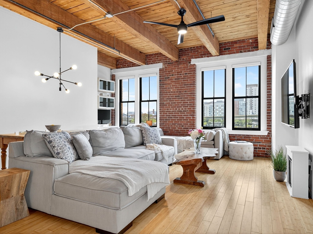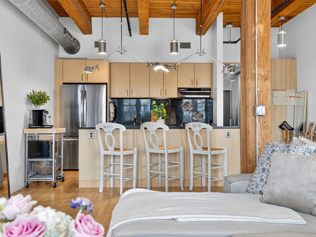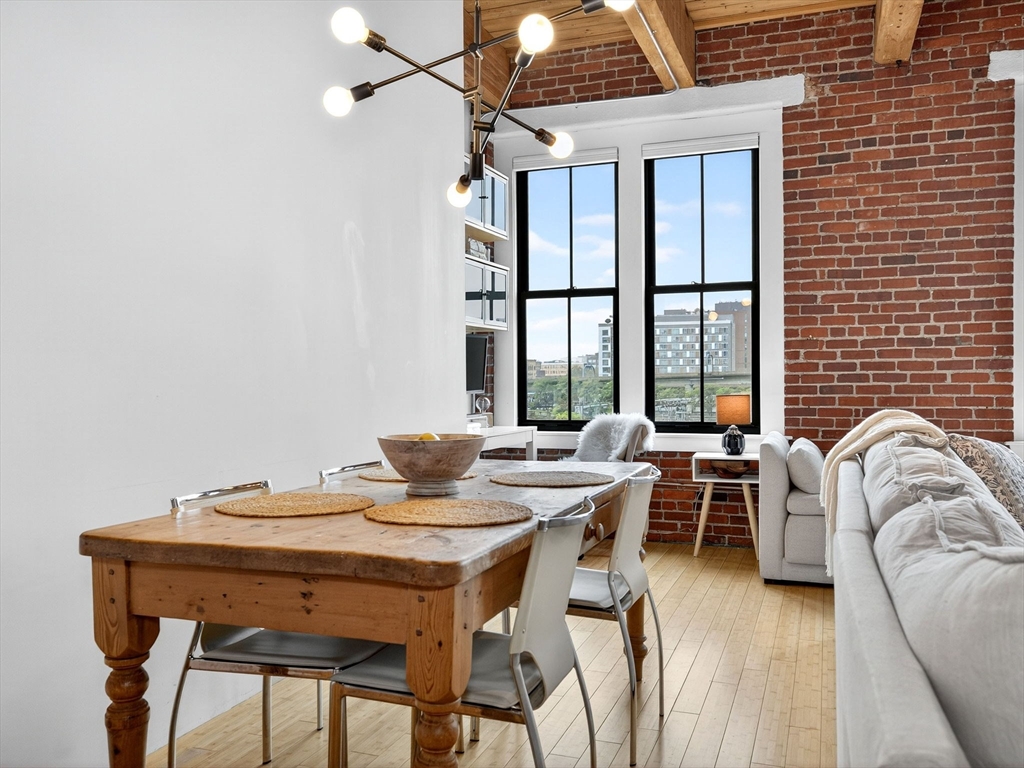 Experience style and sophistication in this stunning brick-and-beam home at the coveted Court Square Press. This classic industrial residence features an open-concept kitchen with sleek modern cabinetry, stone countertops, stainless steel appliances, and ample storage. Soaring ceilings and oversized windows fill the space with natural light, highlighting its distinctive character. The spacious living area allows for an office nook, dining table, and full seating setup. The bathroom offers hexagonal tile flooring, subway-tiled walls, granite vanity, and a soaking tub. Hardwood floors throughout and in-unit washer/dryer. Enjoy full-service living with 24/7 concierge, fitness center, rooftop pool and terrace with sweeping views of the city, grilling stations, media room, and on-site management. Prime location near the Seaport and across from the Broadway T.