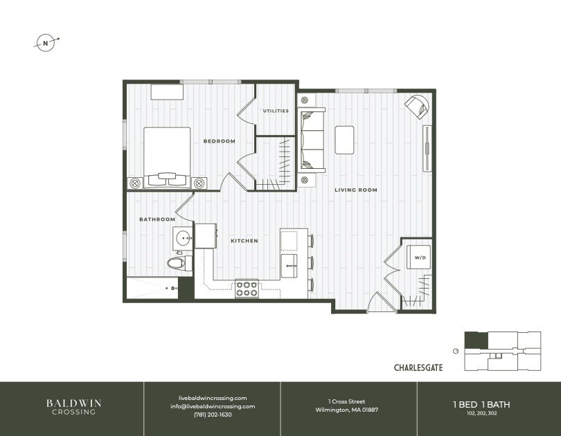 Welcome to Unit 102 at Baldwin Crossing—a beautifully designed one-bedroom, one-bath home in Wilmington’s newest boutique condominium community. This first-floor residence features a bright, open layout with oversized transom windows, a chef-inspired kitchen with quartz countertops, stainless steel appliances, and sleek cabinetry. Enjoy in-unit laundry, central air, elevator access, deeded parking, and secure building entry. Ideally located across from Yentile Farm Park, residents can enjoy trails, recreation, and green space right outside their door. With local dining, shopping, the commuter rail, and Routes I-93 and I-95 nearby, Baldwin Crossing offers the perfect blend of modern design, convenience, and community—a rare opportunity to own new construction in Wilmington.