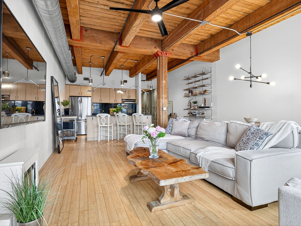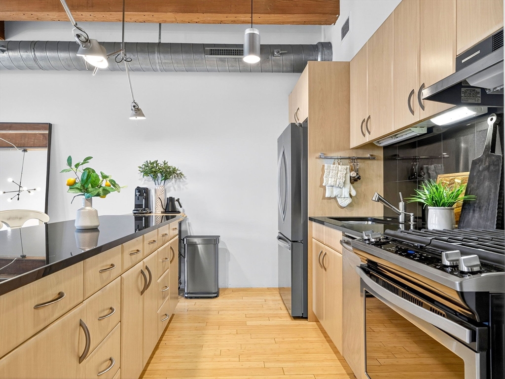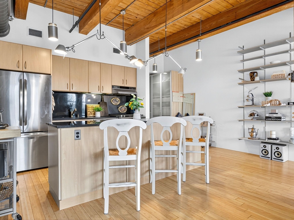 Experience style and sophistication in this stunning brick-and-beam home at the coveted Court Square Press. This classic industrial residence features an open-concept kitchen with sleek modern cabinetry, stone countertops, stainless steel appliances, and ample storage. Soaring ceilings and oversized windows fill the space with natural light, highlighting its distinctive character. The spacious living area allows for an office nook, dining table, and full seating setup. The bathroom offers hexagonal tile flooring, subway-tiled walls, granite vanity, and a soaking tub. Hardwood floors throughout and in-unit washer/dryer. Enjoy full-service living with 24/7 concierge, fitness center, rooftop pool and terrace with sweeping views of the city, grilling stations, media room, and on-site management. Prime location near the Seaport and across from the Broadway T.