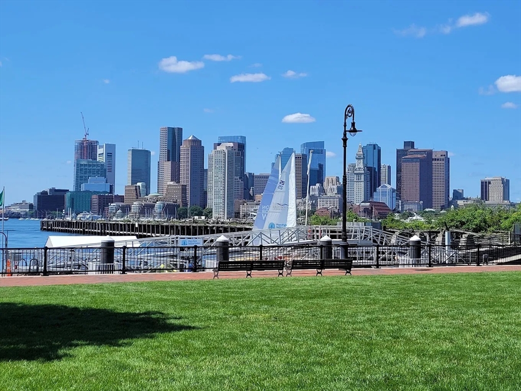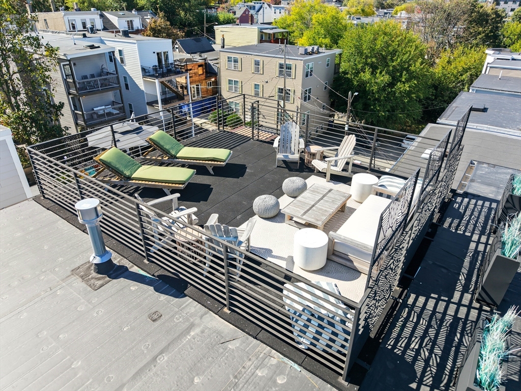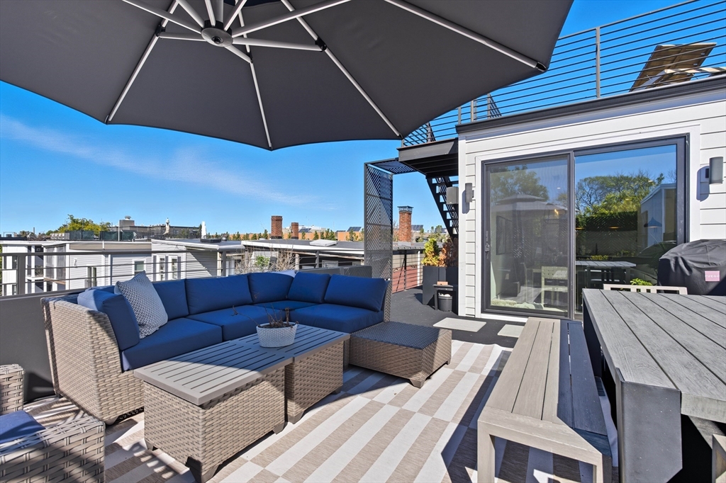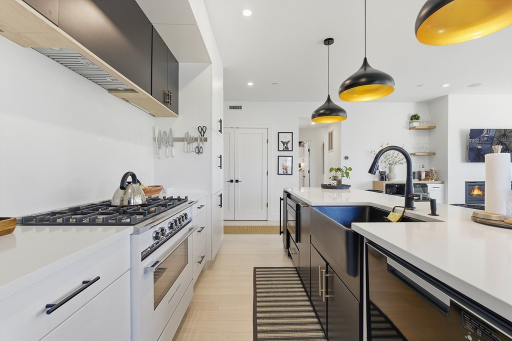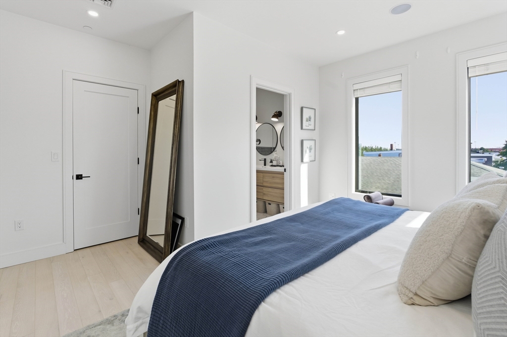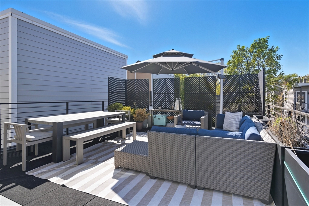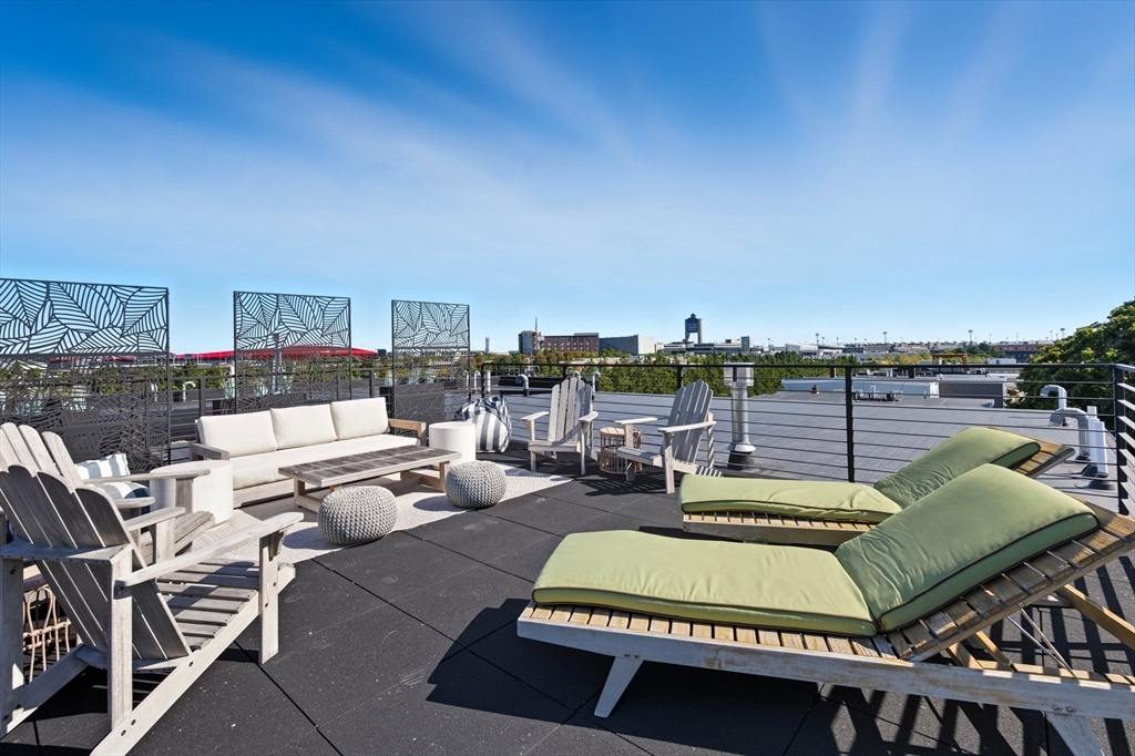 Modern Jeffries Point Penthouse with Private Roof Deck. Experience modern East Boston living in this newer-construction penthouse built in 2021. This 3-bed, 2-bath home offers 1,428 sq ft of living space plus 1,000+ sq ft of private outdoor space, including a roof deck with panoramic city and harbor views. The open layout features a chef’s kitchen with quartz waterfall island, high-end appliances, and a bright living area that opens to a private terrace, perfect for entertaining. The primary suite offers dual closets and a spa-like bath with glass shower. Two additional bedrooms, one with a private deck, provide space for guests or an office. Enjoy hardwood floors, recessed lighting, built-in sound, in-unit laundry, and garage parking. Minutes from Harborwalk, East Boston Greenway, parks, and waterfront trails, plus neighborhood favorites like Starbucks, The Quiet Few, Mida, ReelHouse, and Santarpio’s. Quick access to Maverick Station, East Boston Ferry, and major highways.