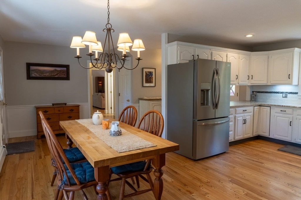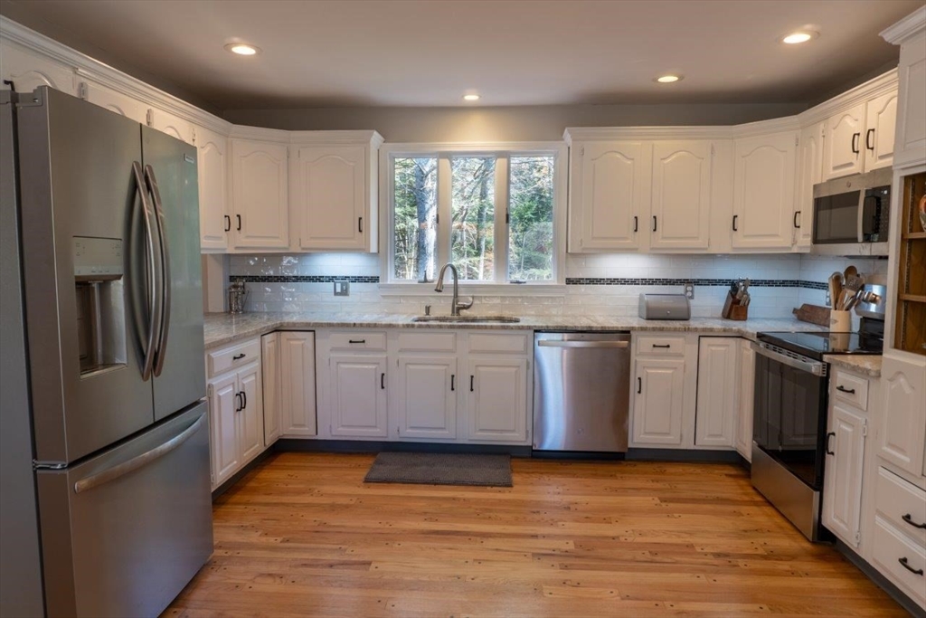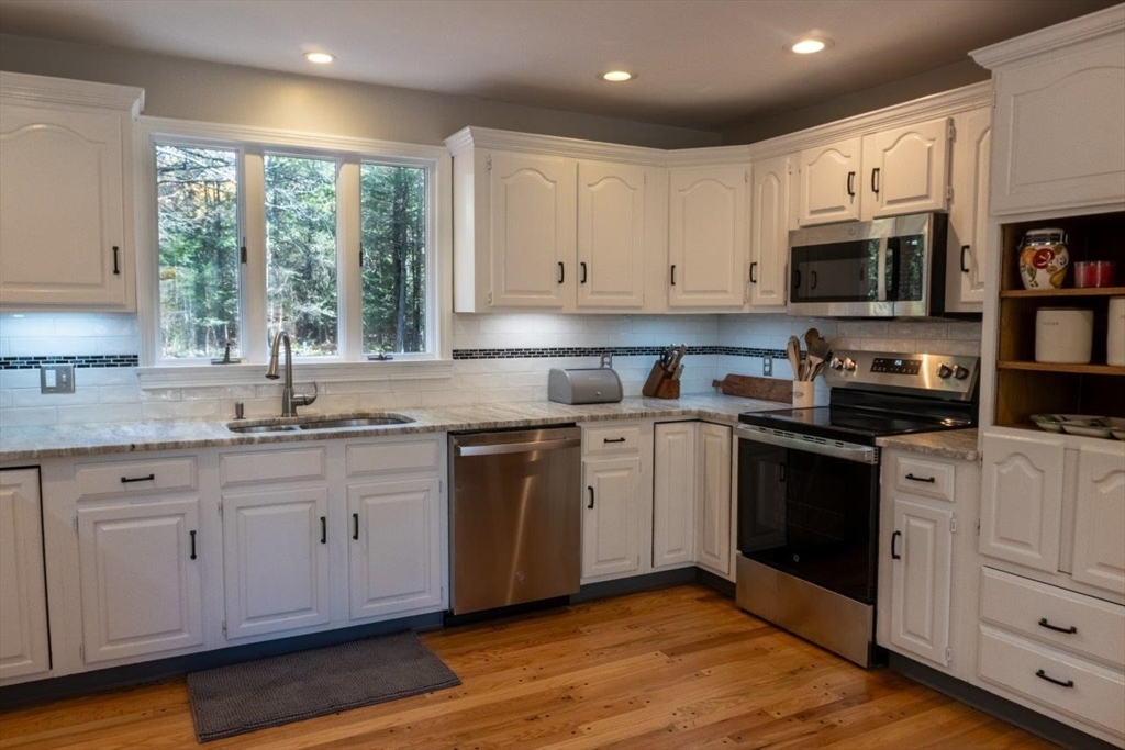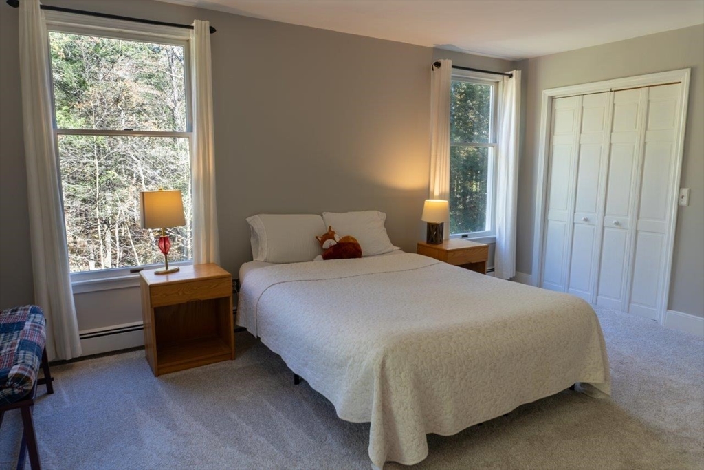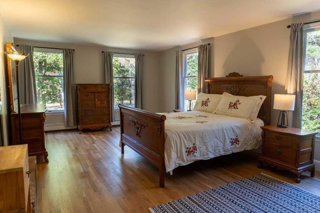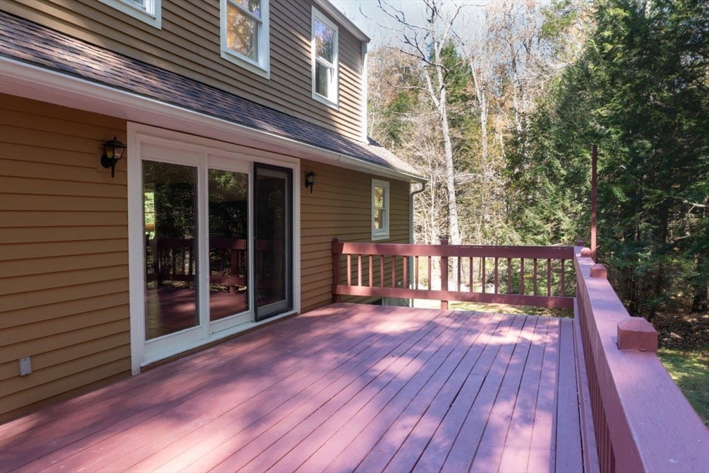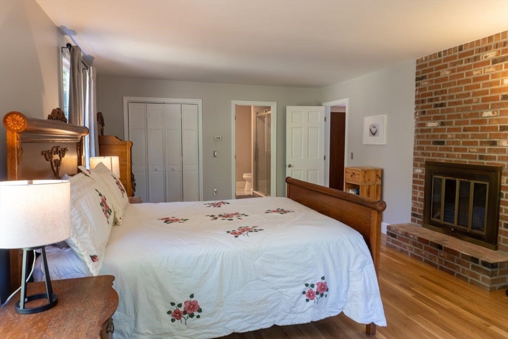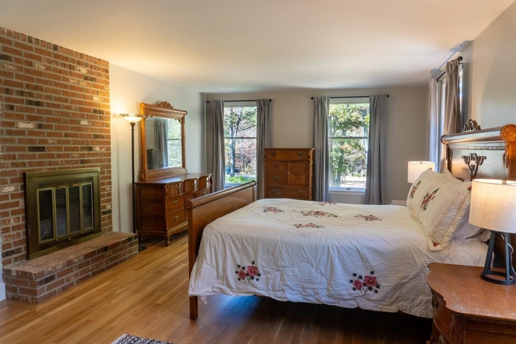Incredibly spacious 5 bedroom home set on 15 idyllic wooded acres near the center of a quaint New England town. You'll drive up the newly paved driveway past a rock-bordered garden to a beautiful gambrel styled house with an open porch to relax on and revel in the natural setting. Enter into a massive eat-in kitchen complete with fireplace, recently remodeled with exquisite custom granite countertops and new appliances. Entertain in your formal dining room and fireplace-equipped living room which opens onto a full-length deck overlooking your wn private nature habitat. Virtually the entire interior has been remodeled: new hardwood floors, wall-to-wall carpeting, custom-tiled bathrooms with new vanities and fixtures. Massive first floor master BR with fireplace, walk-in closet, and MBa with double vanity and walk-in shower. Your home will be heated by a top of the line Buderus heater and a new indirect water heater. Just move in and relax! It's all been done for you!