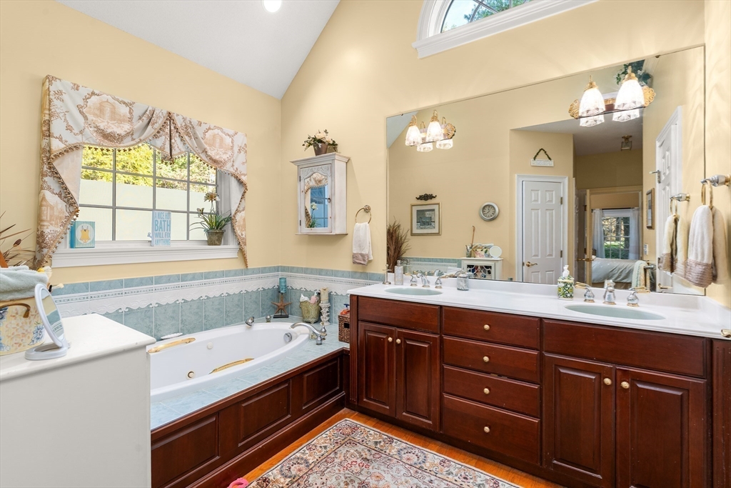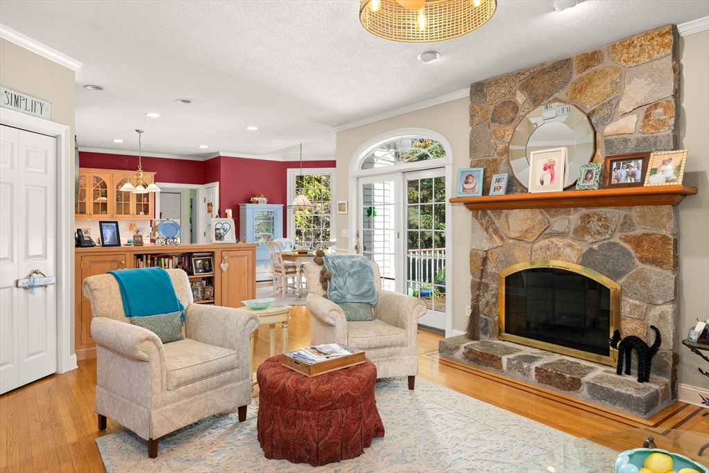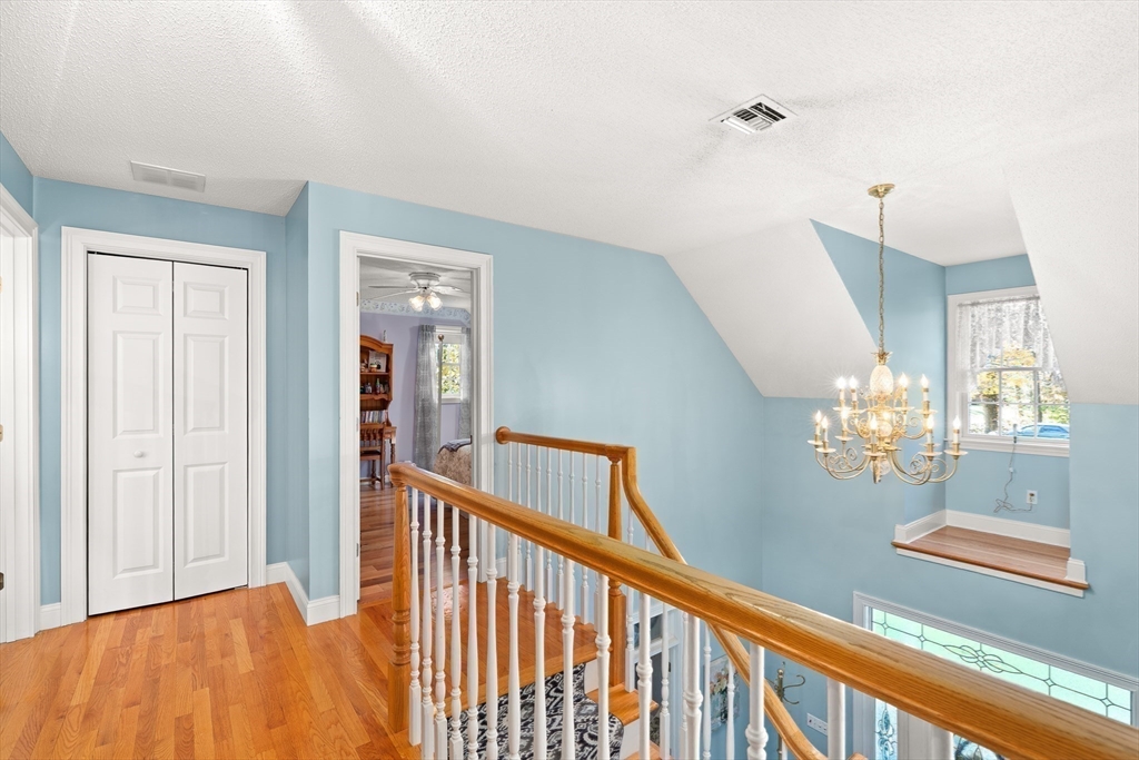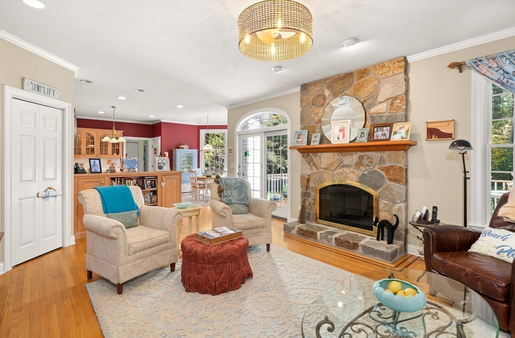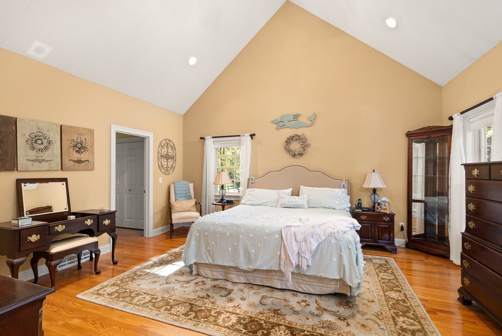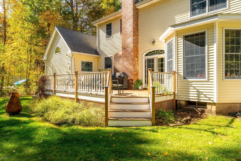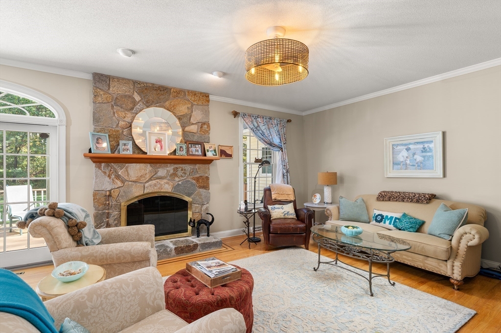Stunning one owner custom-built Cape in premiere Southampton neighborhood with thoughtfully designed features including large Andersen windows, offering lots of natural sunlight. The charming front porch leads to an impressive two story foyer & spacious open layout, perfect for entertaining. The kitchen with island & breakfast nook opens to living room with stone gas fireplace. The first floor continues with a formal dining room and an enclosed den with French doors. The first floor primary bedroom is spacious and airy with cathedral ceilings and leads to a private ensuite bath and double closets. Upstairs, there are three large bedroom all with ample closet space. The expansive bonus room over the garage is a perfect rec room or home office. The three car garage has direct access to the mudroom & convenient first floor laundry. Hydro air natural gas heating system with 3 zones is efficient, supplied by Holyoke Gas. The large composite deck overlooks the beautiful & private backyard.