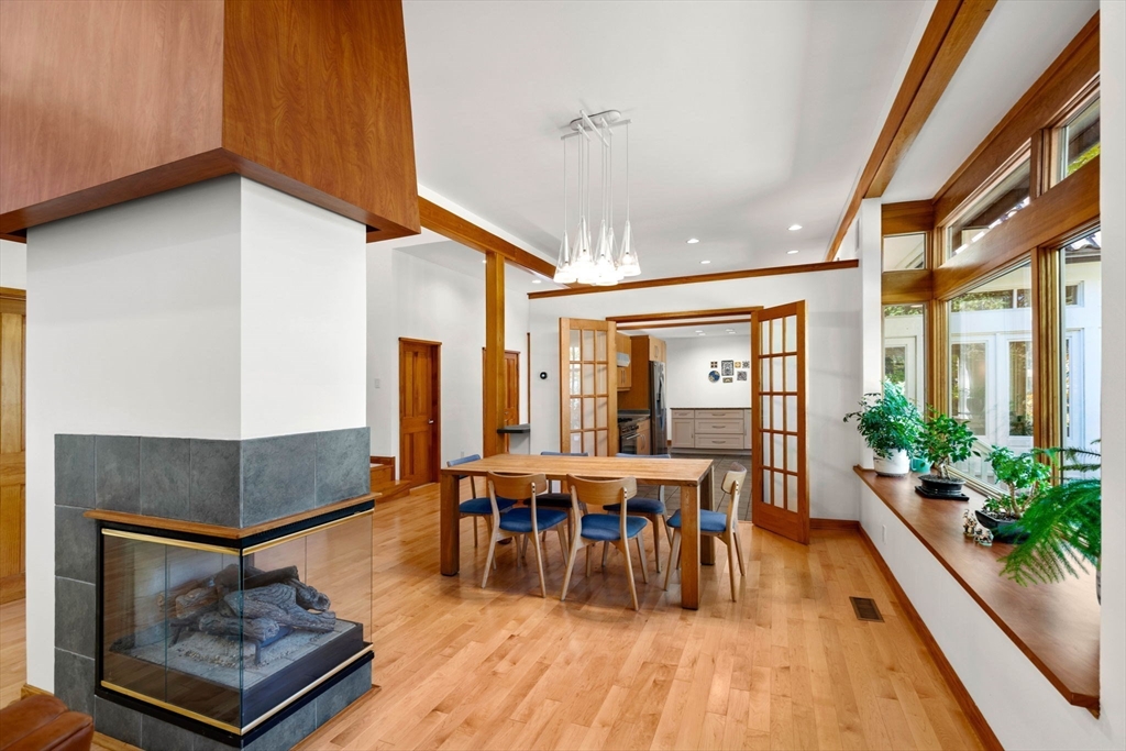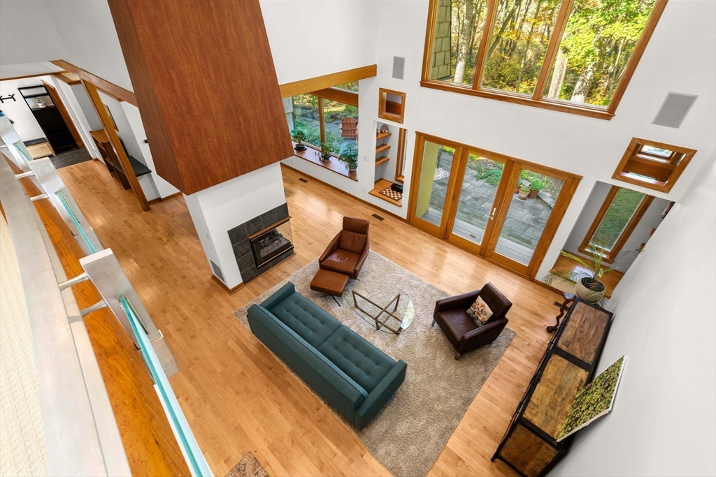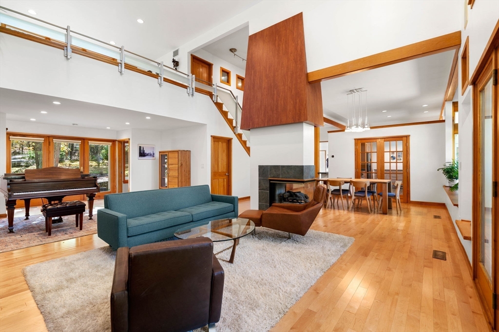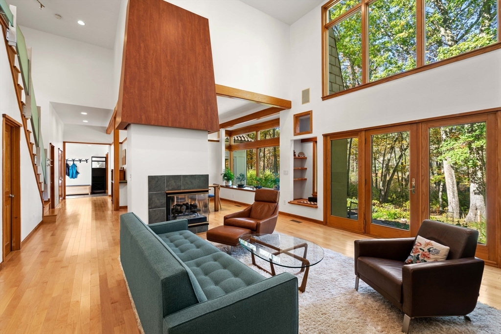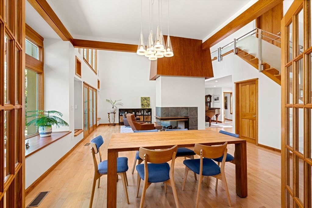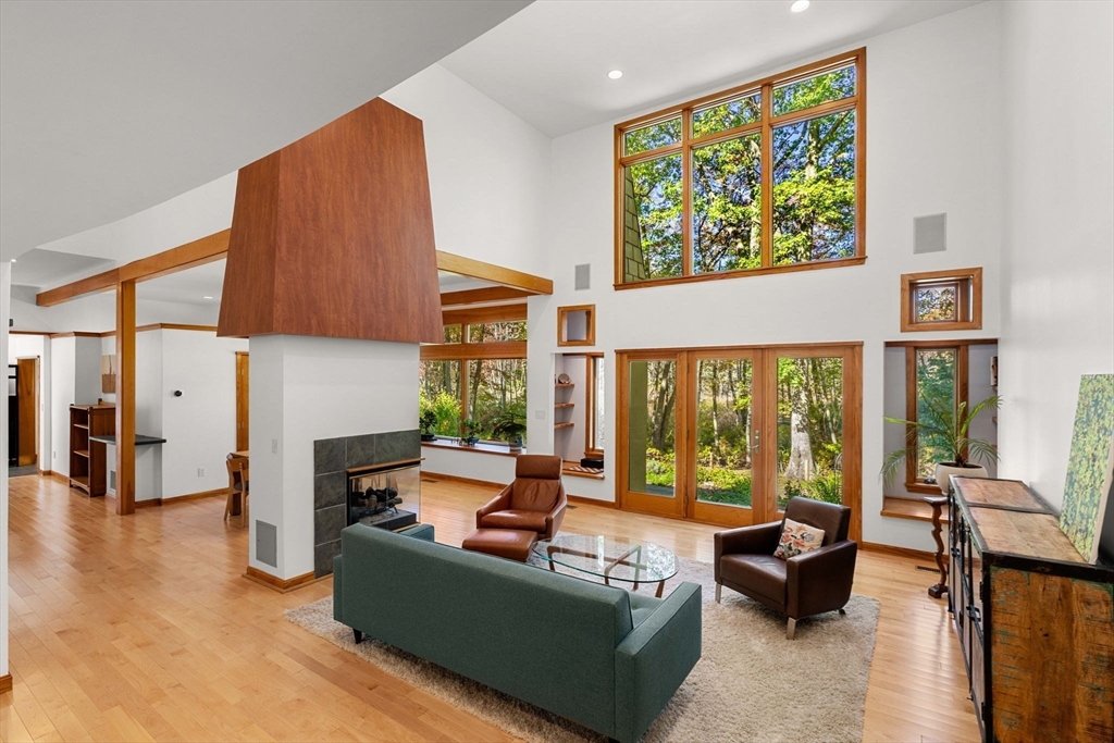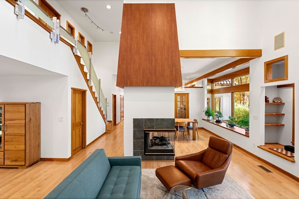 Impressive 3 BR, 2.2 BA Contemporary Ranch stands as a testament to enduring craftsmanship, ready to welcome its new owners. Spacious, open-concept living & dining rm w/ cathedral ceilings, double-sided gas fireplace & new HW floors offers 3025 SF of living sp. The sleek, modern kitchen is stylish & functional w/ island seating. Ideal for entertaining family & friends. New SS gas range & dishwasher. Expansive floor to ceiling windows throughout the home offers an abundance of natural light. The family room is a cozy retreat. Primary Br has an ensuite bath w/ steam shower & a sitting rm. Adjacent are 2 additional BR's, a new second full & 1/2 BA. Laundry Rm w/ built-in cabinetry. Home office & exercise Rm on the second level loft includes an ample storage rm. Beautiful 3-season sunroom opens to the private backyard w/ stone patio & garden beds. Enjoy the surrounding tranquility of nature. C/A, 2-car garage & storage shed. Highly desirable neighborhood. Single-level living at it's best!