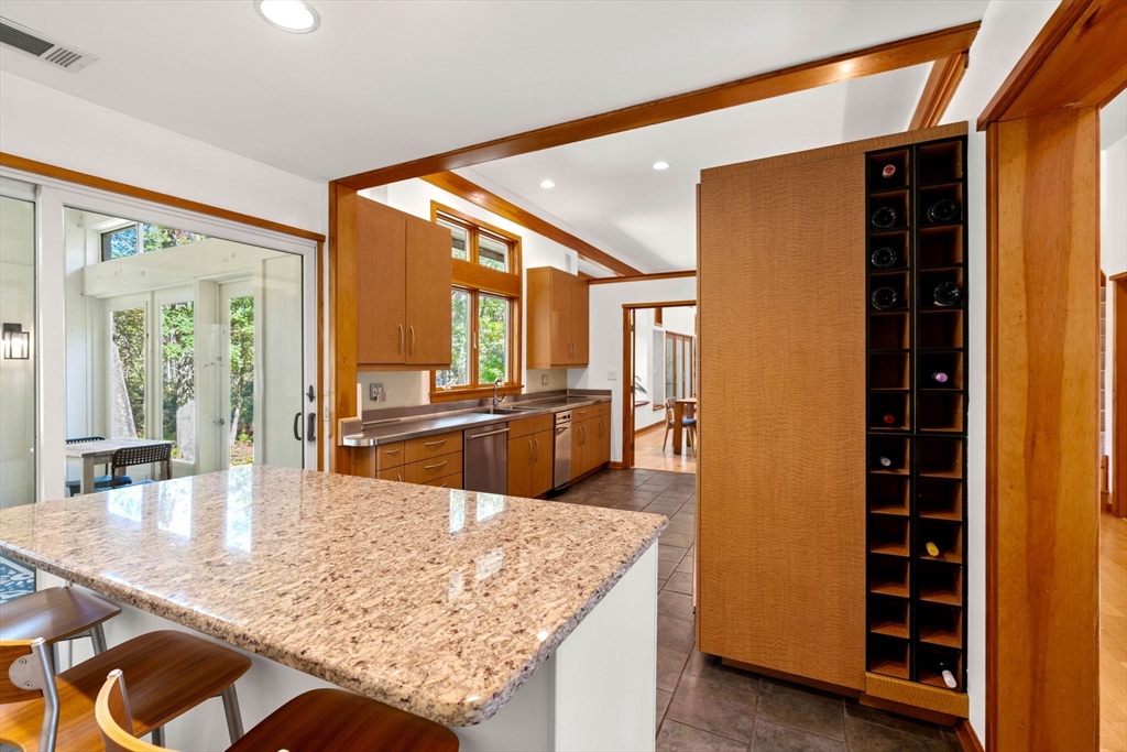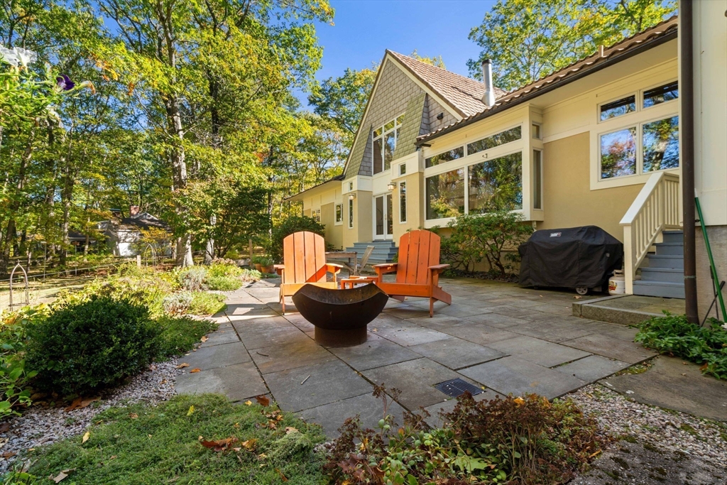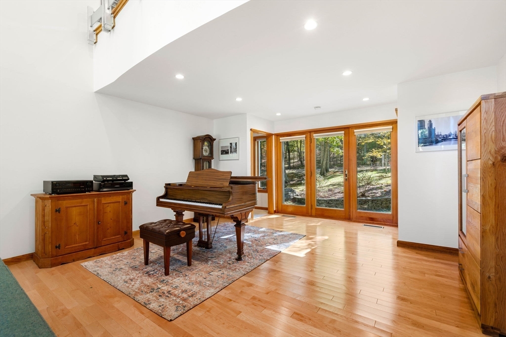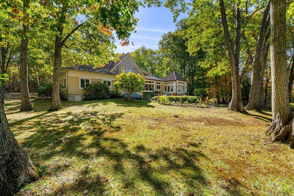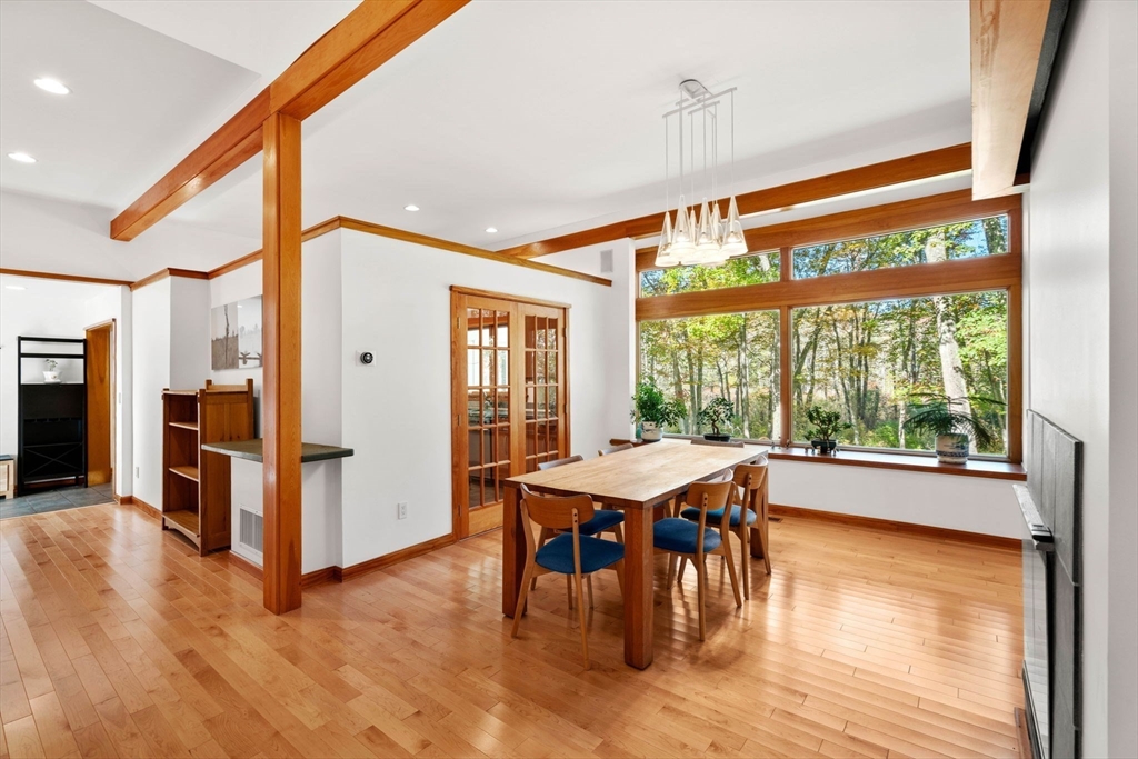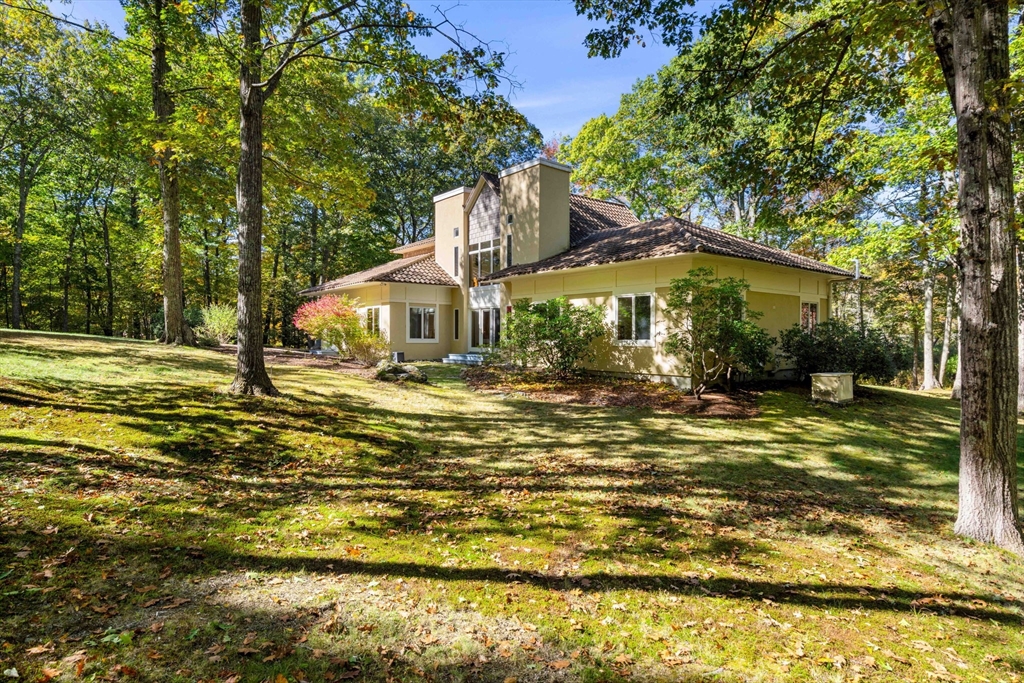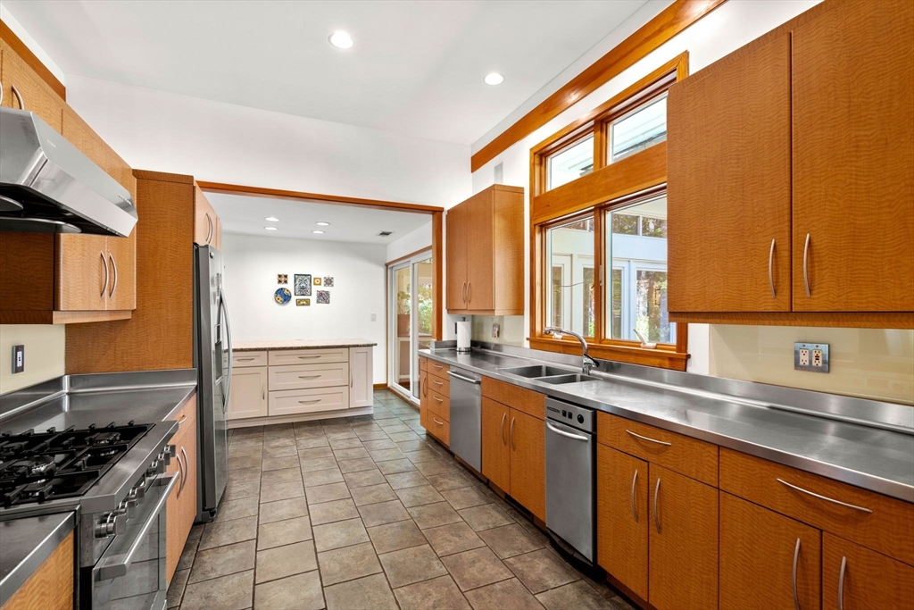 Impressive 3 BR, 2.2 BA Contemporary Ranch stands as a testament to enduring craftsmanship, ready to welcome its new owners. Spacious, open-concept living & dining rm w/ cathedral ceilings, double-sided gas fireplace & new HW floors offers 3025 SF of living sp. The sleek, modern kitchen is stylish & functional w/ island seating. Ideal for entertaining family & friends. New SS gas range & dishwasher. Expansive floor to ceiling windows throughout the home offers an abundance of natural light. The family room is a cozy retreat. Primary Br has an ensuite bath w/ steam shower & a sitting rm. Adjacent are 2 additional BR's, a new second full & 1/2 BA. Laundry Rm w/ built-in cabinetry. Home office & exercise Rm on the second level loft includes an ample storage rm. Beautiful 3-season sunroom opens to the private backyard w/ stone patio & garden beds. Enjoy the surrounding tranquility of nature. C/A, 2-car garage & storage shed. Highly desirable neighborhood. Single-level living at it's best!