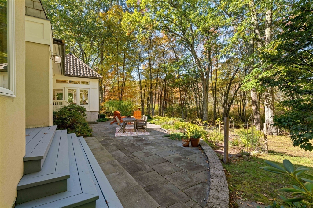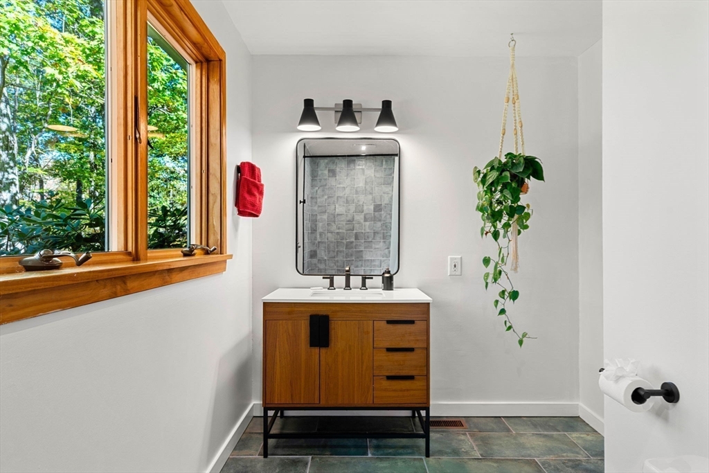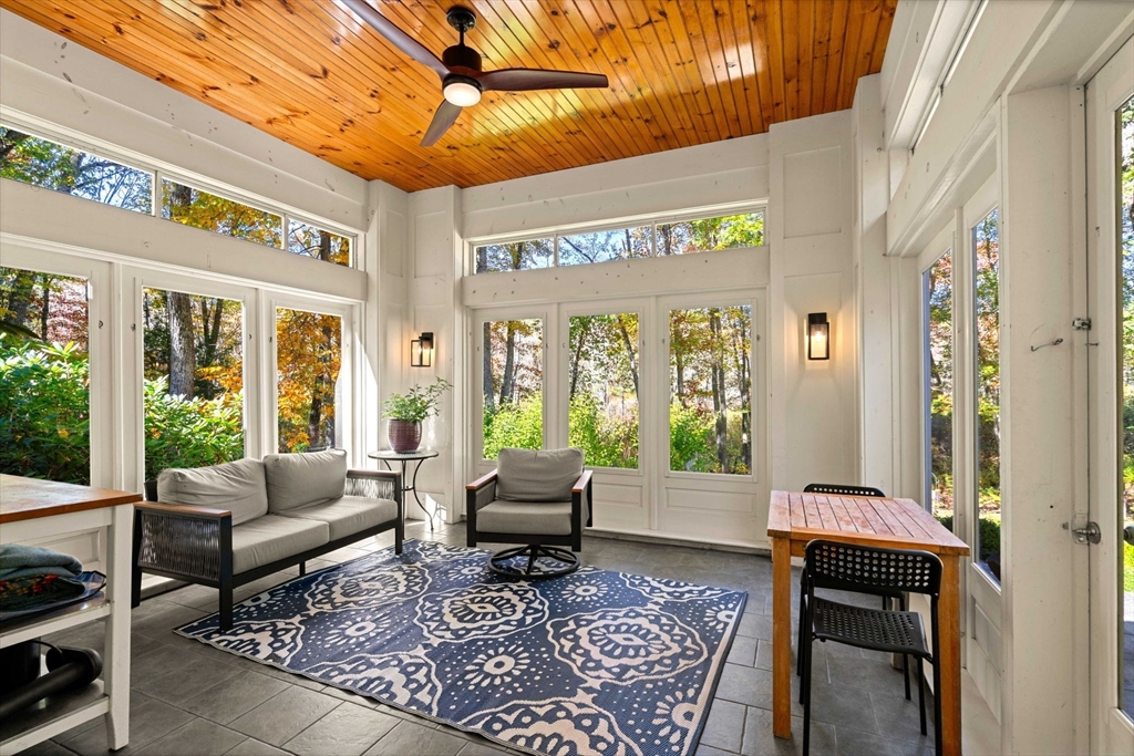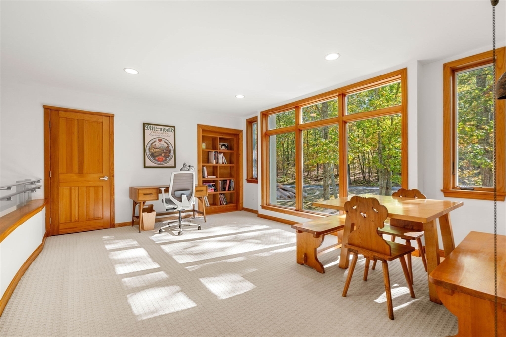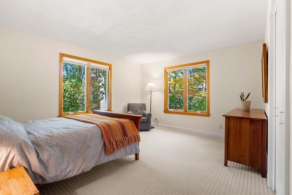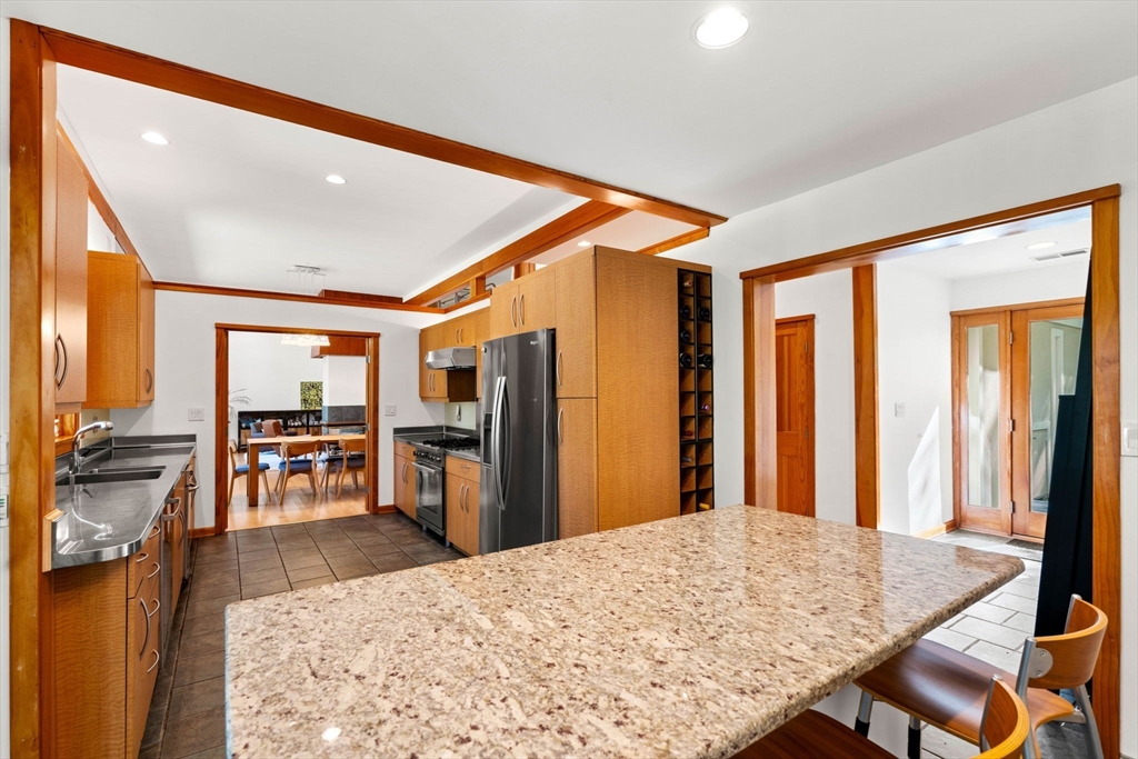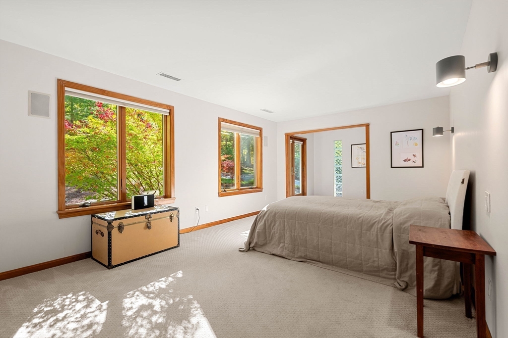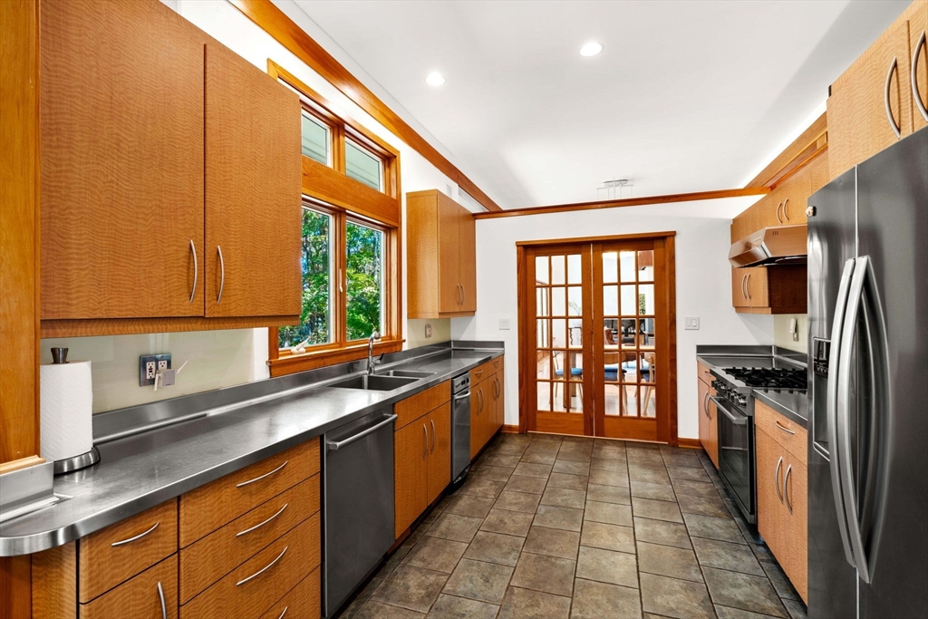 Impressive 3 BR, 2.2 BA Contemporary Ranch stands as a testament to enduring craftsmanship, ready to welcome its new owners. Spacious, open-concept living & dining rm w/ cathedral ceilings, double-sided gas fireplace & new HW floors offers 3025 SF of living sp. The sleek, modern kitchen is stylish & functional w/ island seating. Ideal for entertaining family & friends. New SS gas range & dishwasher. Expansive floor to ceiling windows throughout the home offers an abundance of natural light. The family room is a cozy retreat. Primary Br has an ensuite bath w/ steam shower & a sitting rm. Adjacent are 2 additional BR's, a new second full & 1/2 BA. Laundry Rm w/ built-in cabinetry. Home office & exercise Rm on the second level loft includes an ample storage rm. Beautiful 3-season sunroom opens to the private backyard w/ stone patio & garden beds. Enjoy the surrounding tranquility of nature. C/A, 2-car garage & storage shed. Highly desirable neighborhood. Single-level living at it's best!