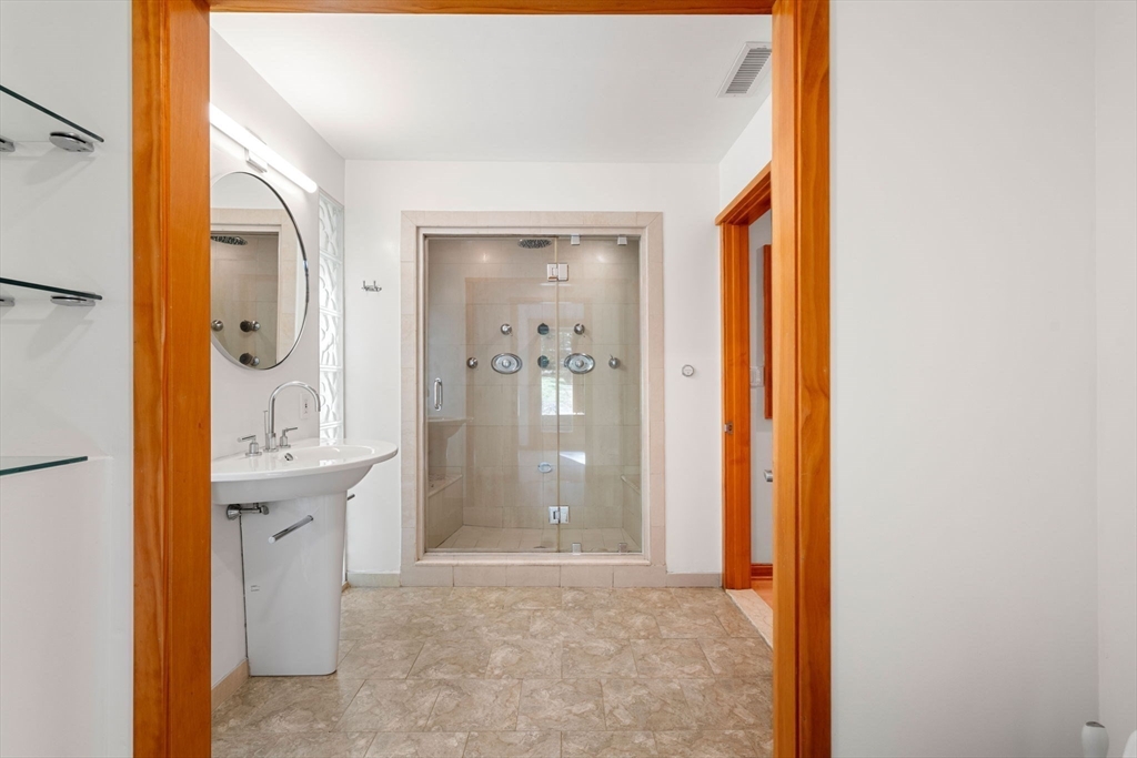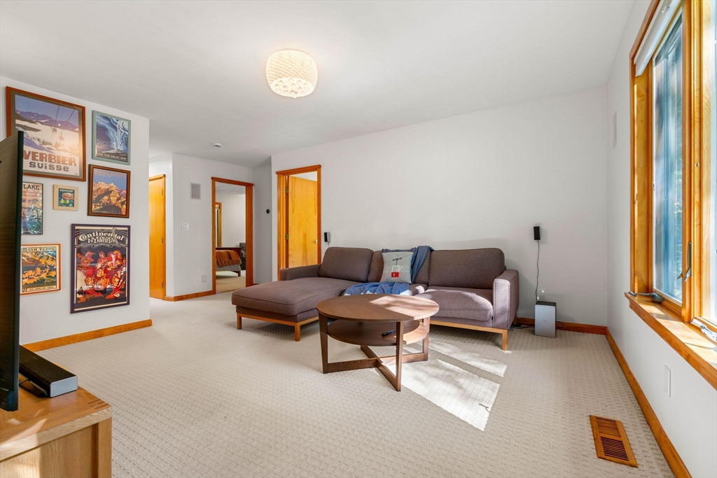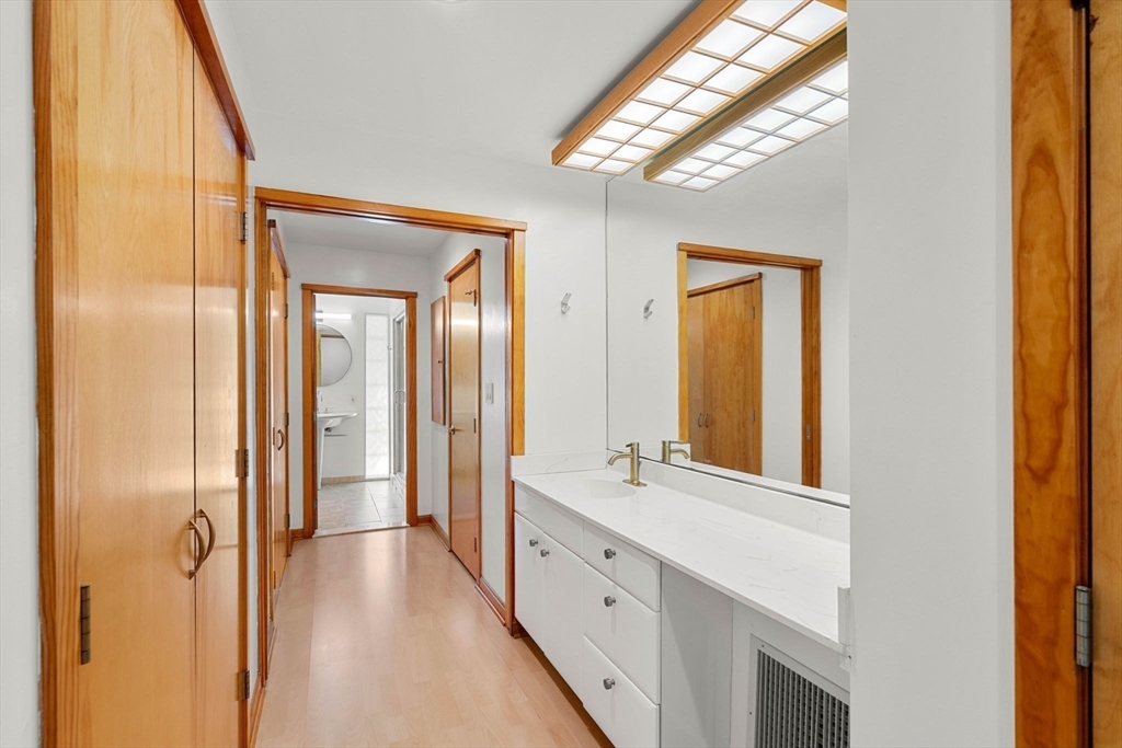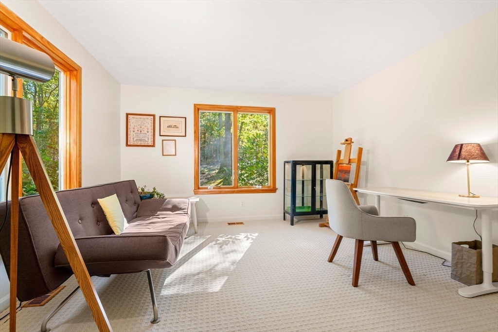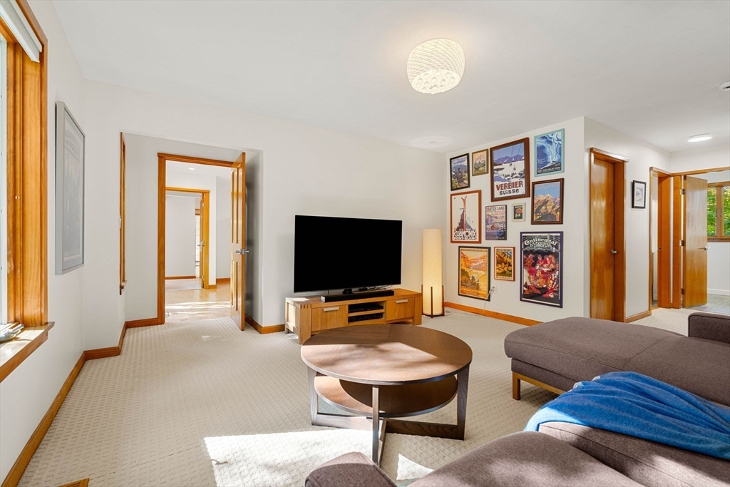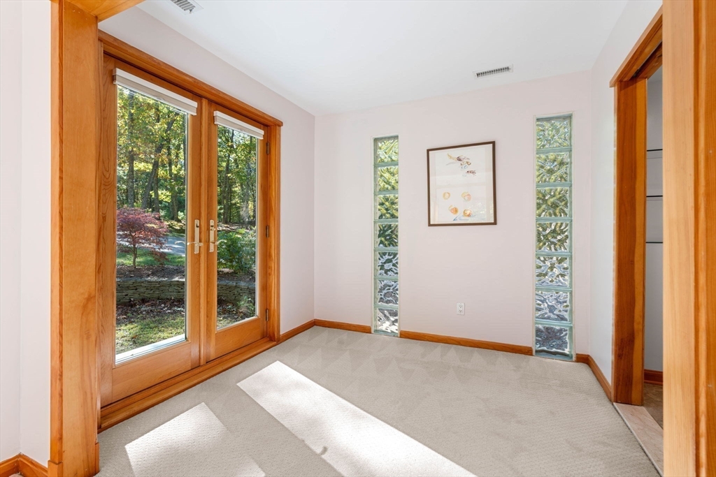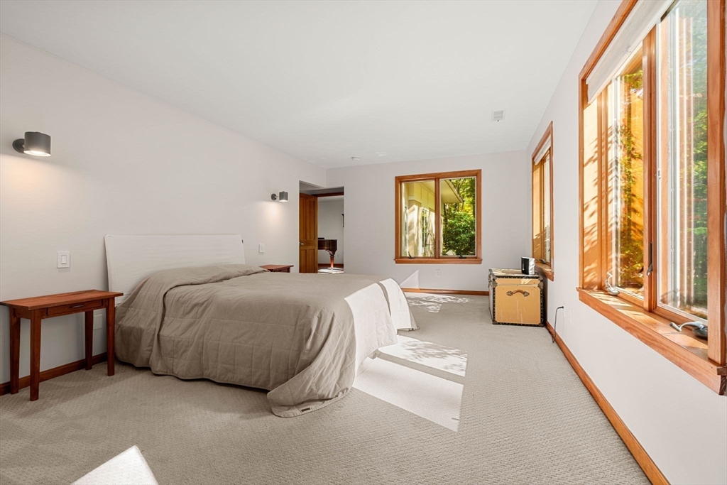 Impressive 3 BR, 2.2 BA Contemporary Ranch stands as a testament to enduring craftsmanship, ready to welcome its new owners. Spacious, open-concept living & dining rm w/ cathedral ceilings, double-sided gas fireplace & new HW floors offers 3025 SF of living sp. The sleek, modern kitchen is stylish & functional w/ island seating. Ideal for entertaining family & friends. New SS gas range & dishwasher. Expansive floor to ceiling windows throughout the home offers an abundance of natural light. The family room is a cozy retreat. Primary Br has an ensuite bath w/ steam shower & a sitting rm. Adjacent are 2 additional BR's, a new second full & 1/2 BA. Laundry Rm w/ built-in cabinetry. Home office & exercise Rm on the second level loft includes an ample storage rm. Beautiful 3-season sunroom opens to the private backyard w/ stone patio & garden beds. Enjoy the surrounding tranquility of nature. C/A, 2-car garage & storage shed. Highly desirable neighborhood. Single-level living at it's best!