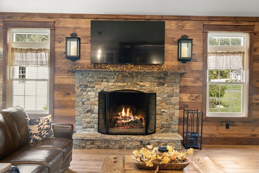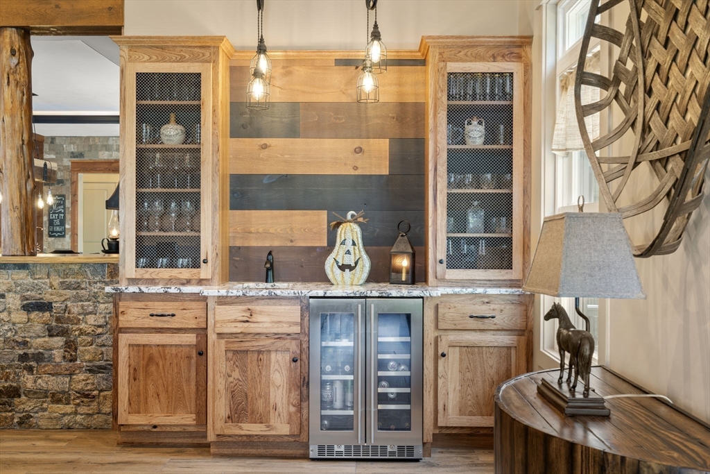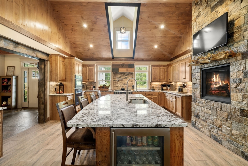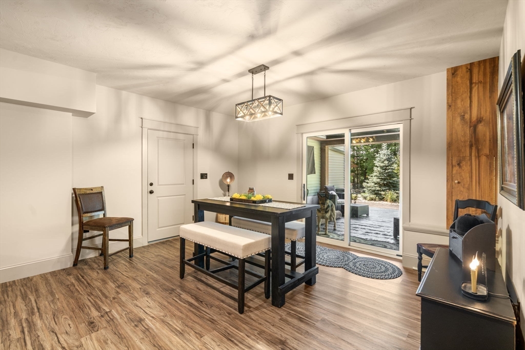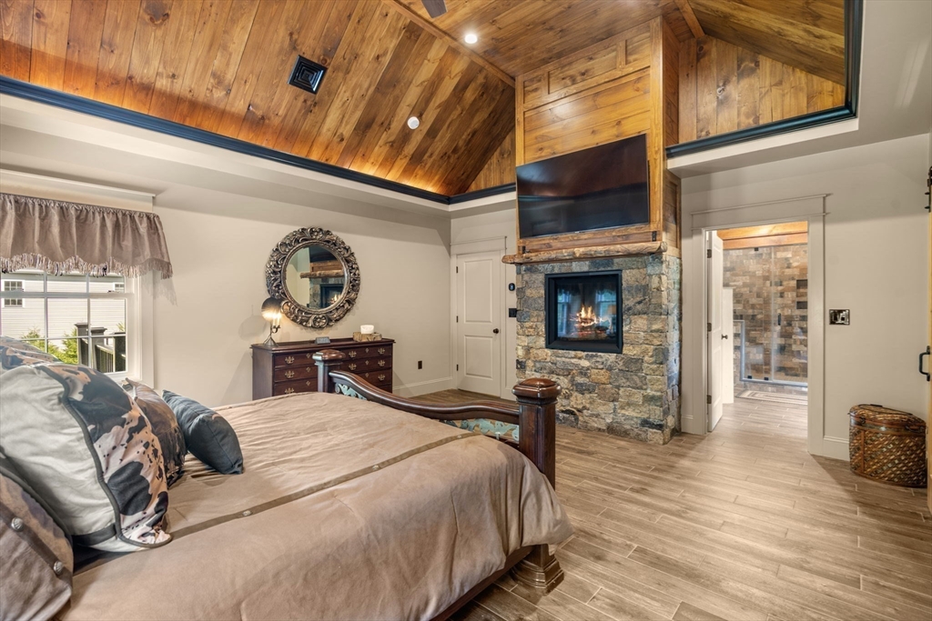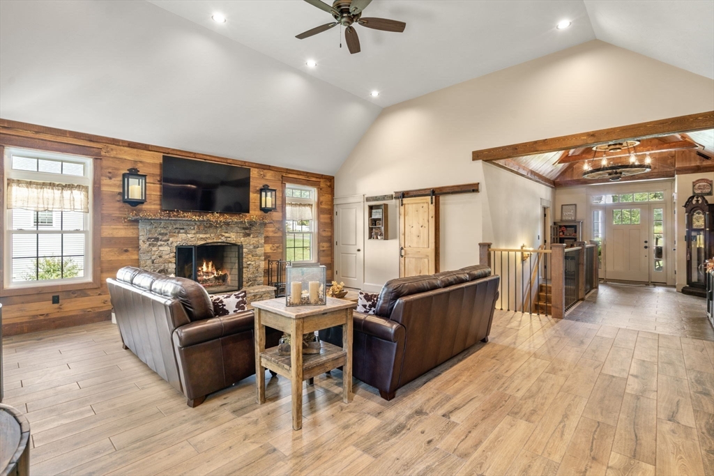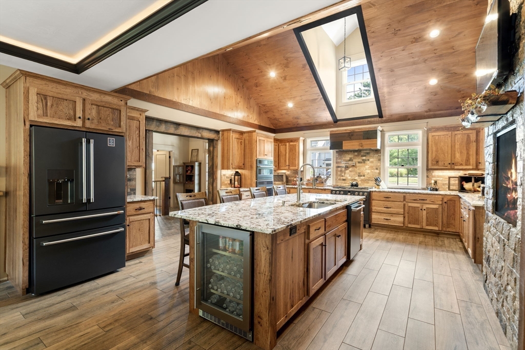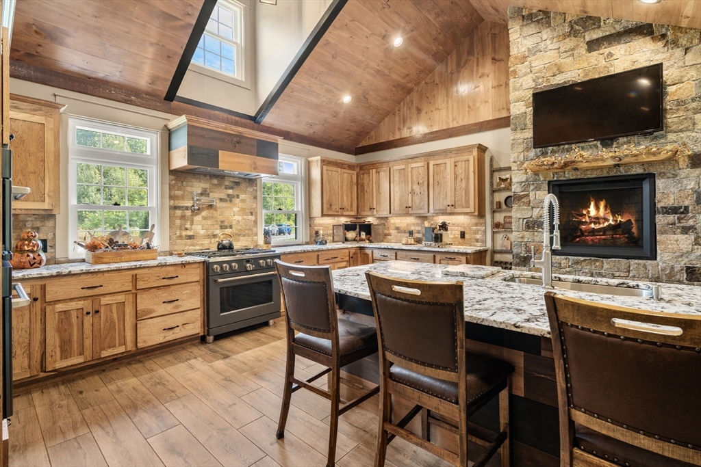 Step into this beautifully designed Craftsman-inspired colonial, showcasing over 4,100 sq ft of expansive, light-filled living space. Rich character flows throughout, from wood-like tile floors to a gourmet kitchen outfitted with a statement island and premium appliances. The airy living room boasts a dramatic fireplace and lofty ceilings, creating a warm and welcoming ambiance. Entertaining is effortless with a seamless layout connecting the dining area and main gathering spaces. The first-floor primary suite offers a serene retreat with dual walk-in closets and a spa-like bath featuring a walk-in shower and elegant double vanity. A versatile main-level office doubles as a fourth bedroom. The finished lower level feels like an extension of the home, complete with large windows and a sliding door, a generous family room with wet bar, dining nook, two more bedrooms, and a full bath. A dual-level garage adds convenience, while the covered patio opens to a private, fenced backyard oasis.