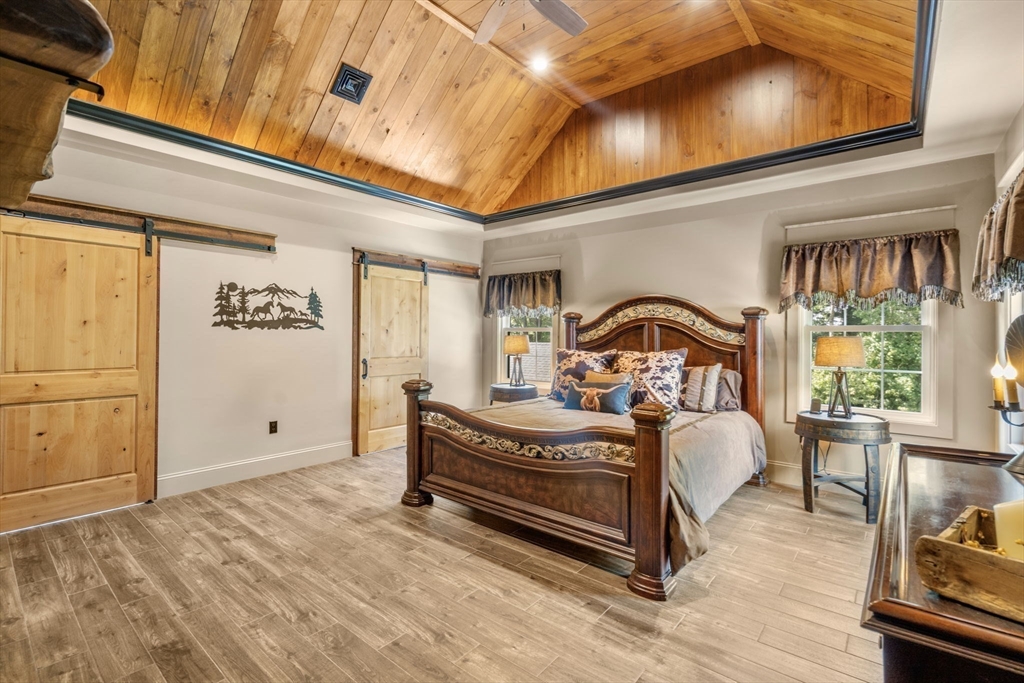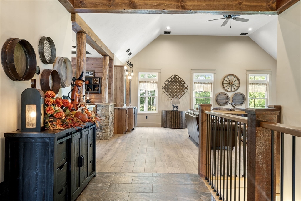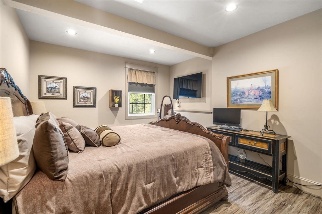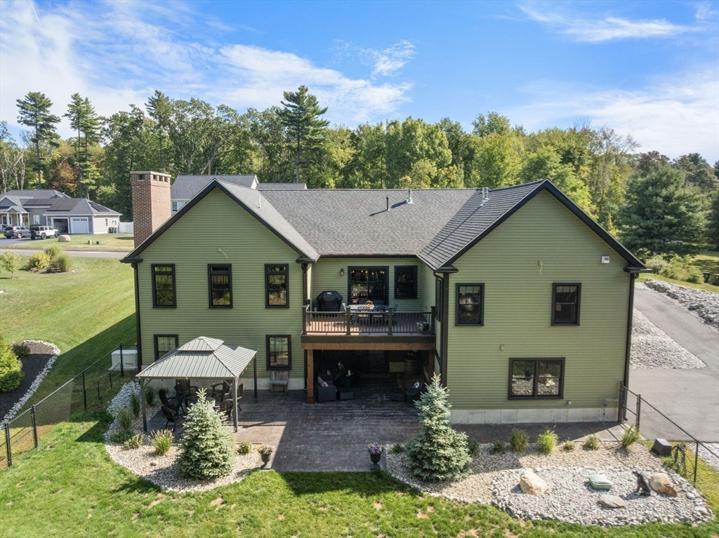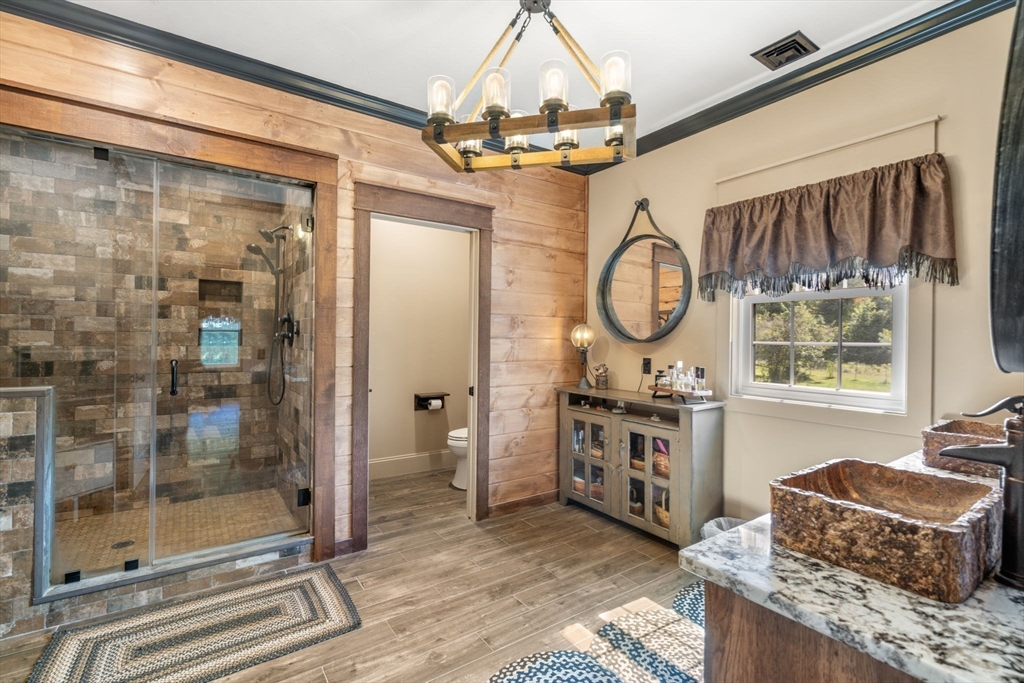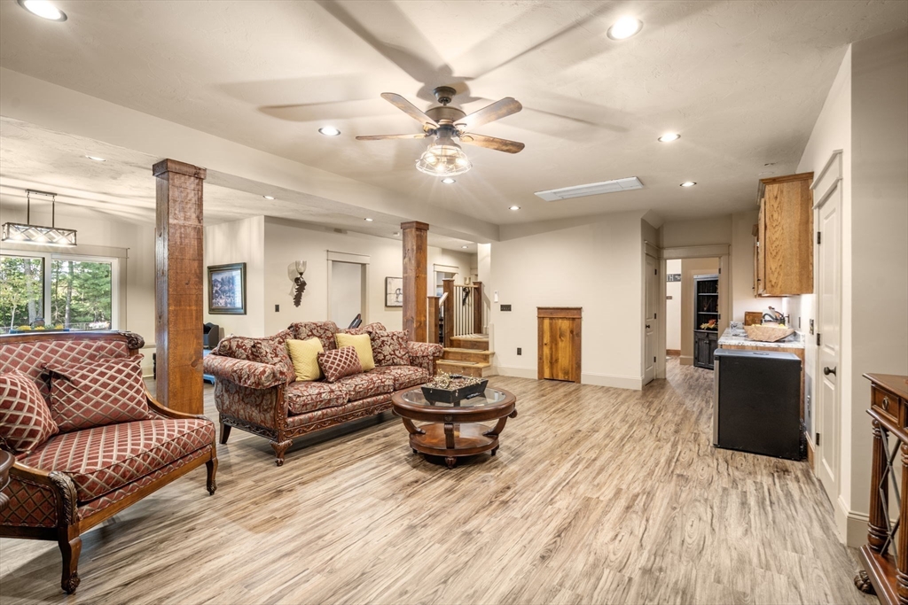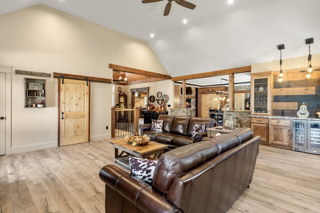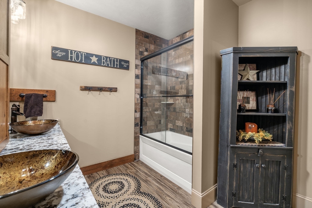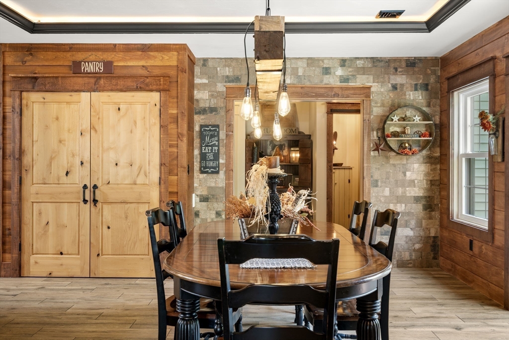 Step into this beautifully designed Craftsman-inspired colonial, showcasing over 4,100 sq ft of expansive, light-filled living space. Rich character flows throughout, from wood-like tile floors to a gourmet kitchen outfitted with a statement island and premium appliances. The airy living room boasts a dramatic fireplace and lofty ceilings, creating a warm and welcoming ambiance. Entertaining is effortless with a seamless layout connecting the dining area and main gathering spaces. The first-floor primary suite offers a serene retreat with dual walk-in closets and a spa-like bath featuring a walk-in shower and elegant double vanity. A versatile main-level office doubles as a fourth bedroom. The finished lower level feels like an extension of the home, complete with large windows and a sliding door, a generous family room with wet bar, dining nook, two more bedrooms, and a full bath. A dual-level garage adds convenience, while the covered patio opens to a private, fenced backyard oasis.